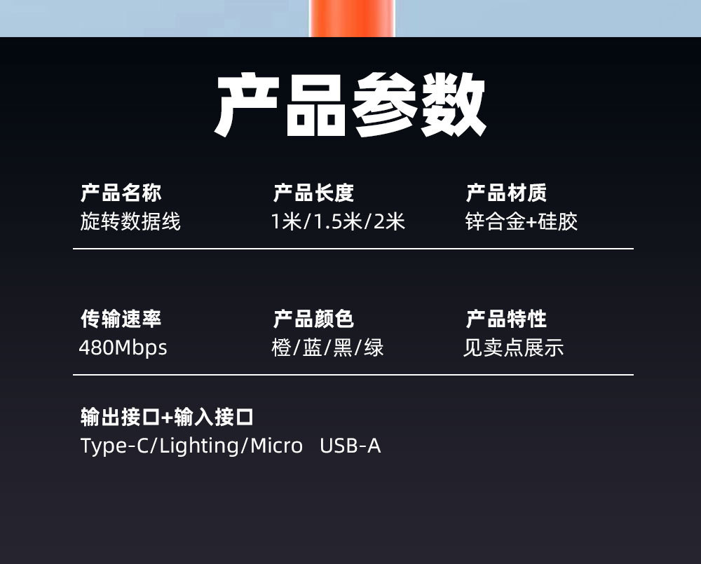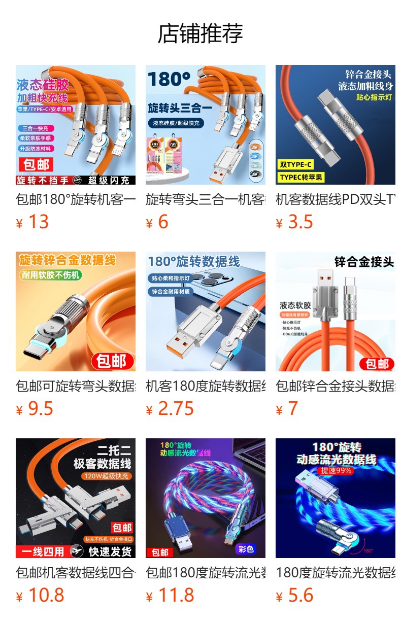 180 도 6A 회전 데이터 케이블 아이폰 화웨이 빠른 충전 데이터 전송 아연 합금 USB 케이블스토어 가기