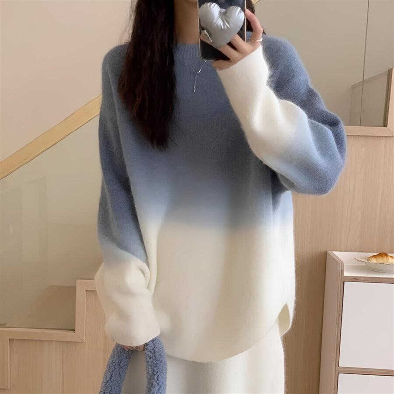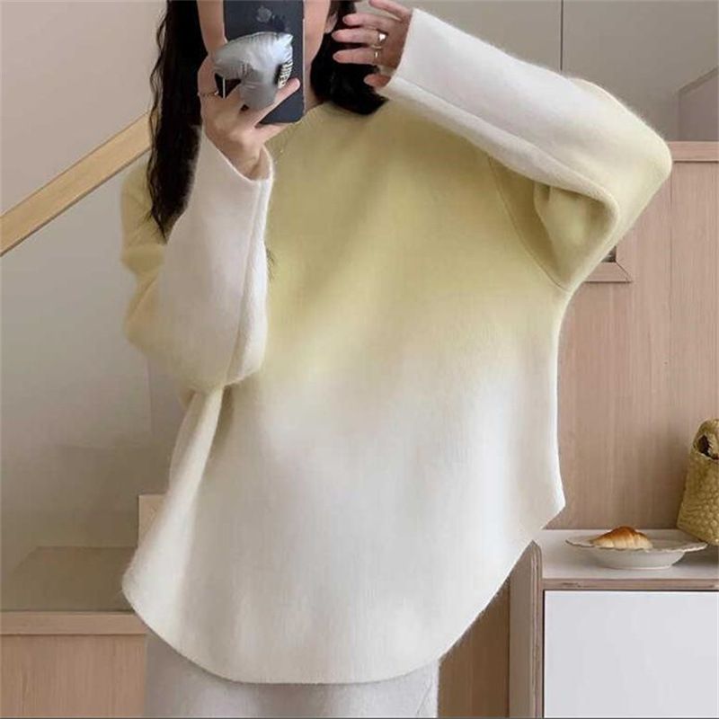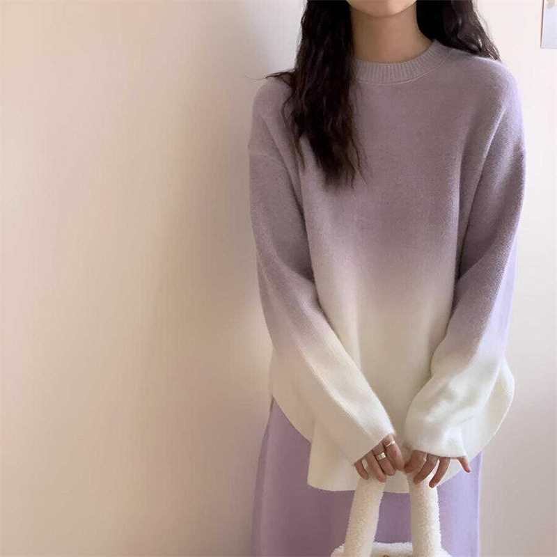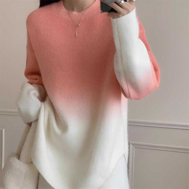그라디언트 게으른 스타일 느슨한 니트 스웨터 가을과 겨울 둥근 목 풀오버 불규칙한 헴 스웨터 긴 소매베이스 셔츠