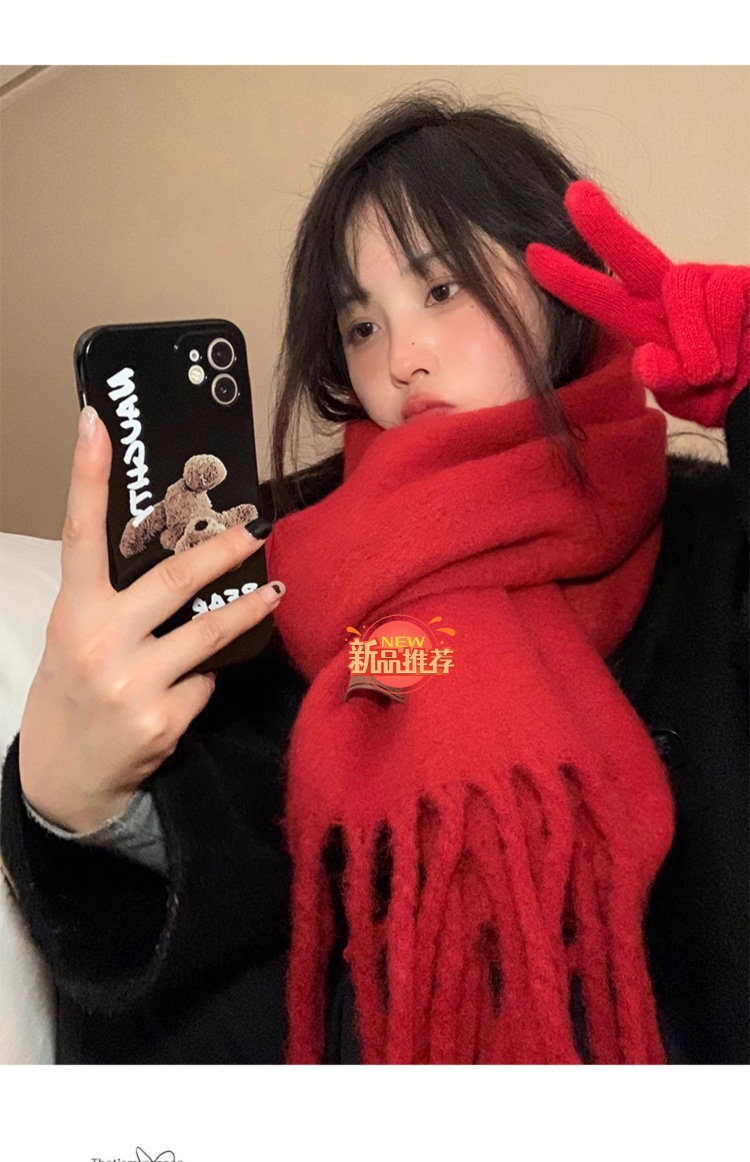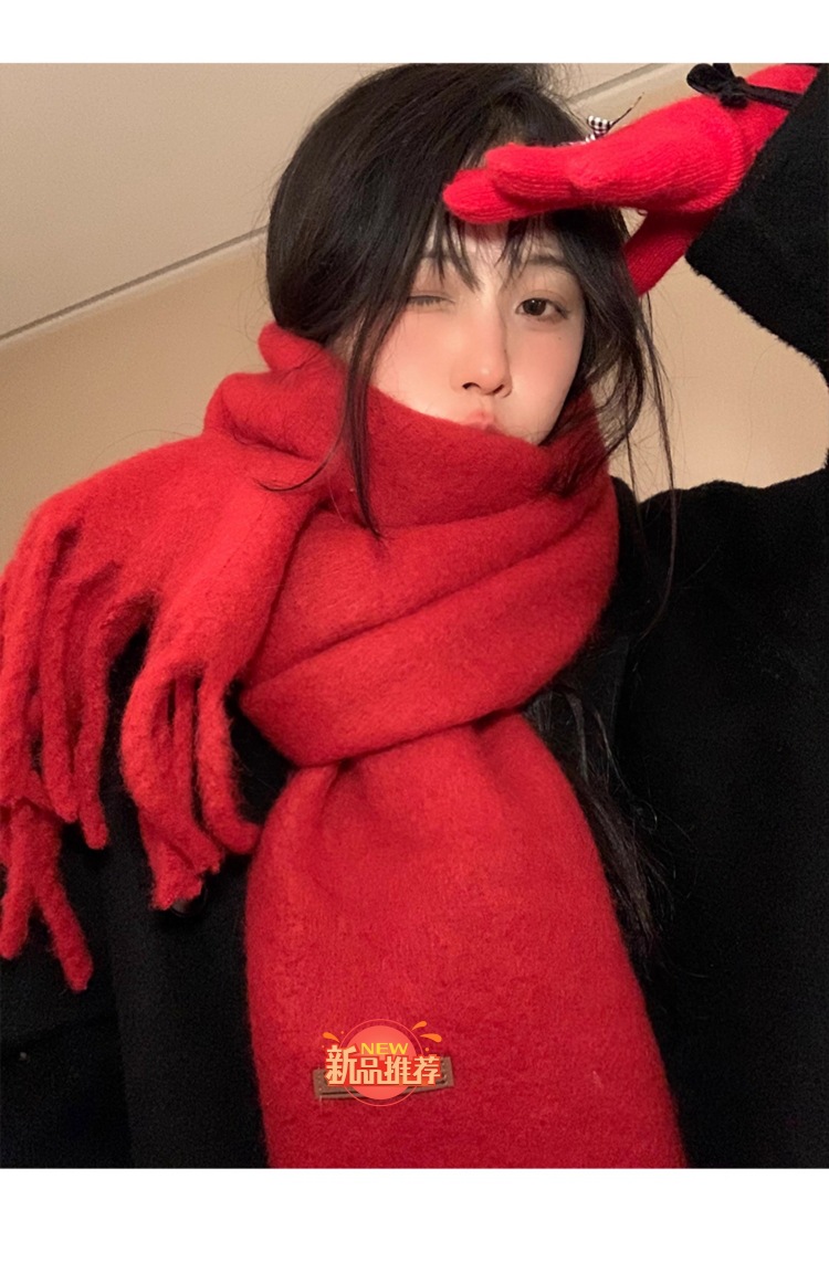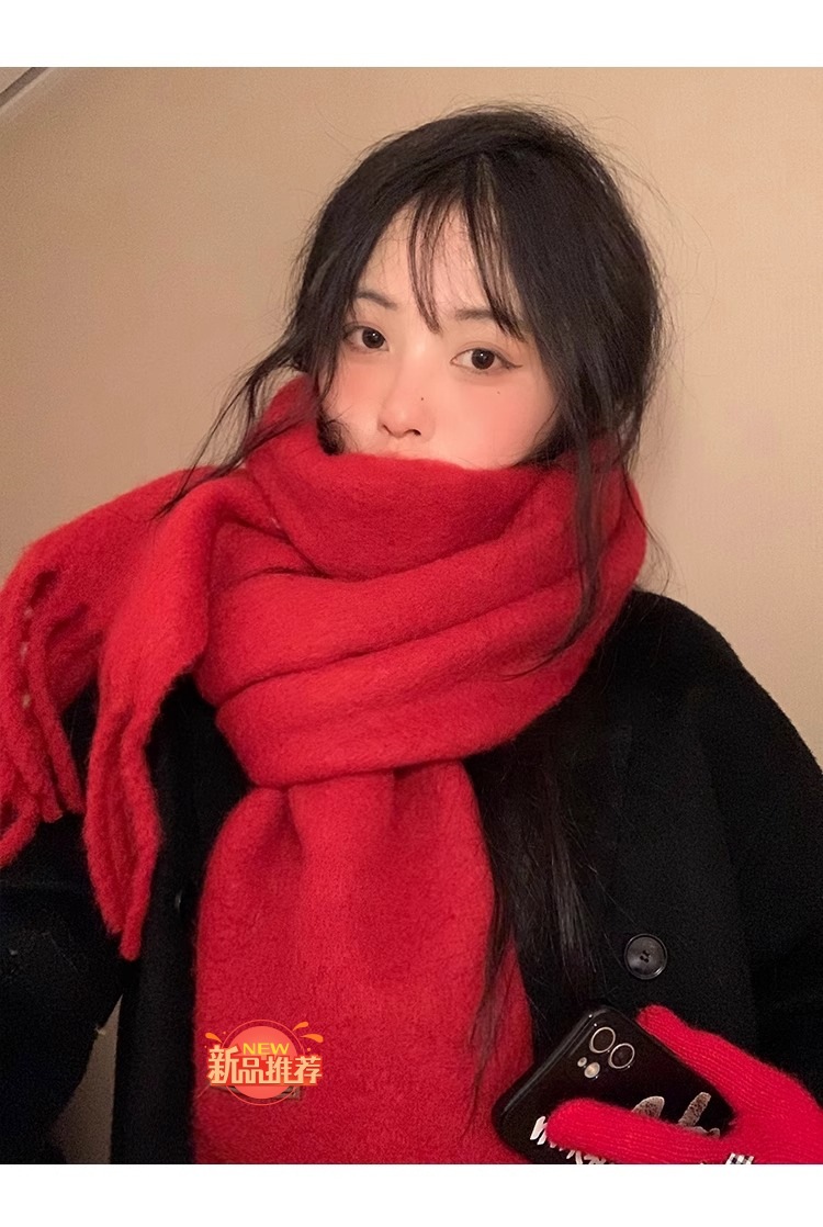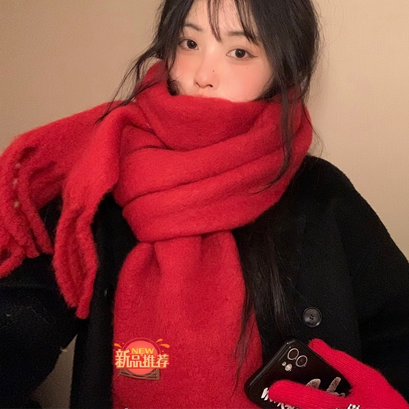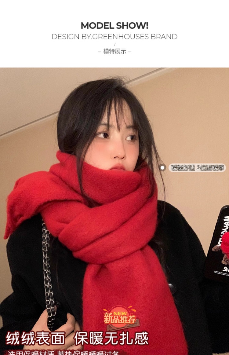 한국식 붉은 모헤어 플러시 스카프 여성의 겨울 한국식 올 매치 분위기 두꺼운 단색 따뜻한 스카프 숄스토어 가기