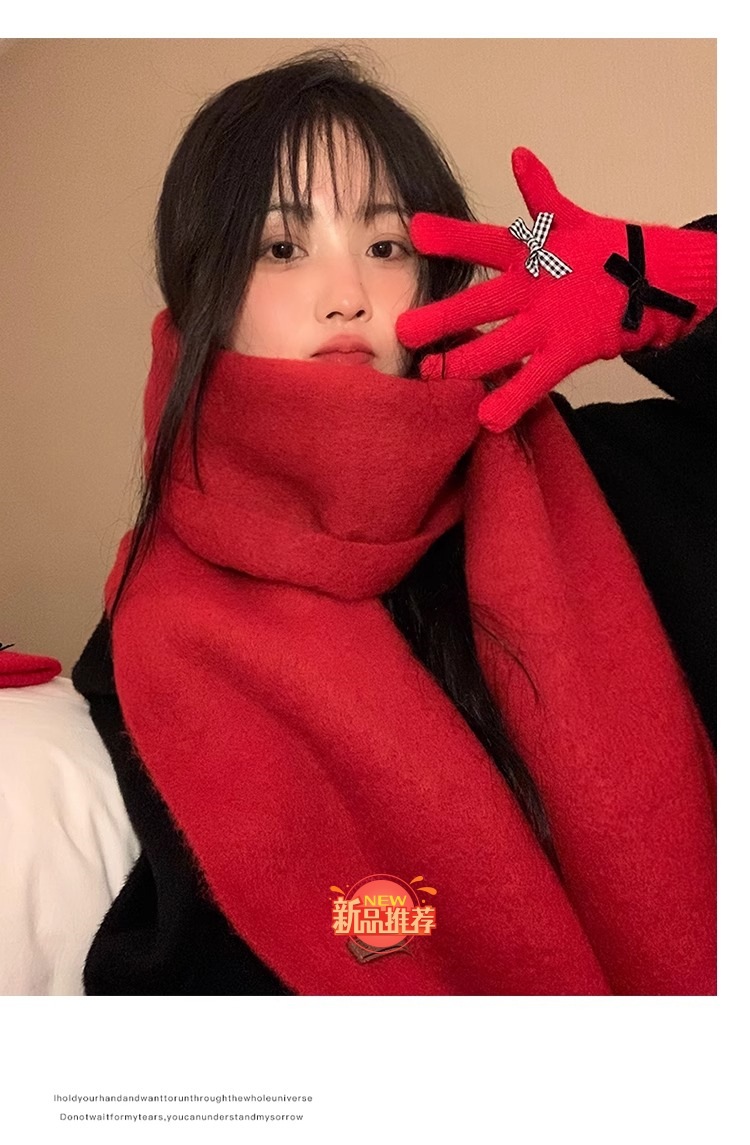 한국식 붉은 모헤어 플러시 스카프 여성의 겨울 한국식 올 매치 분위기 두꺼운 단색 따뜻한 스카프 숄