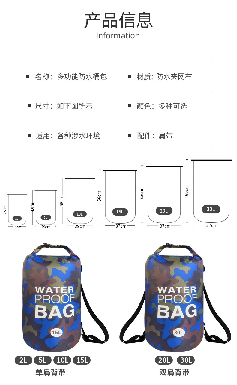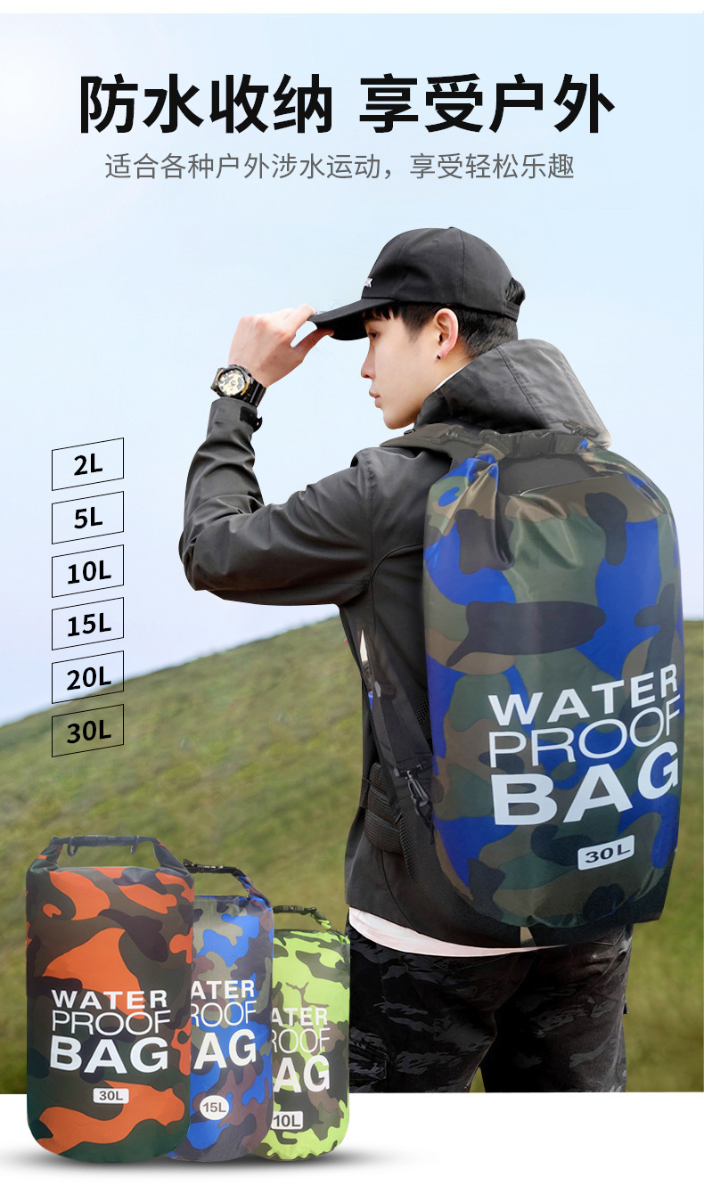국경 간 뜨거운 판매 위장 방수 표류 가방 단일 어깨 더블 어깨 방수 배럴 가방 폴리 에스테르 야외 표류 가방 보관 배낭스토어 가기