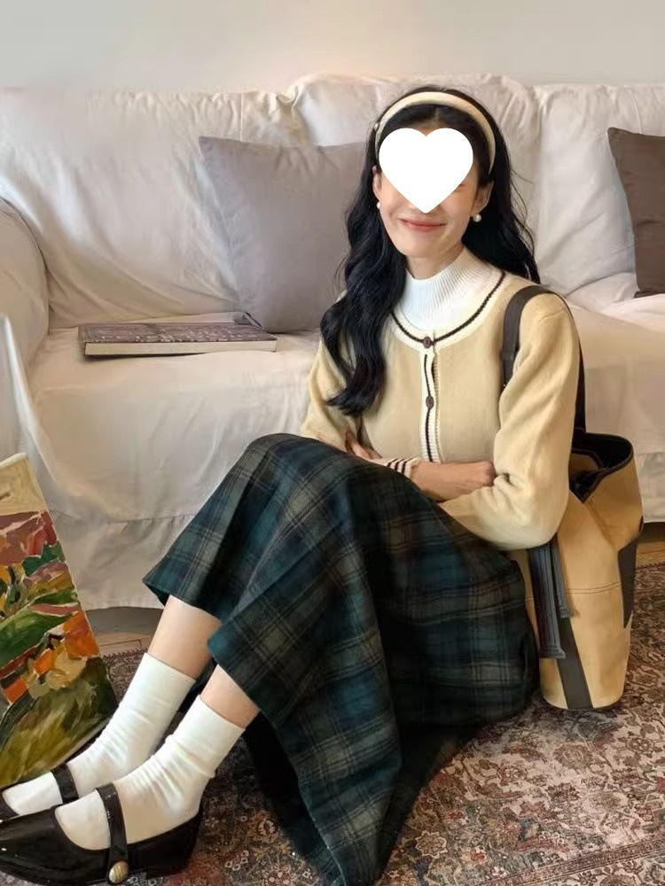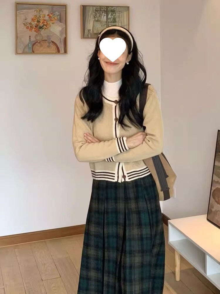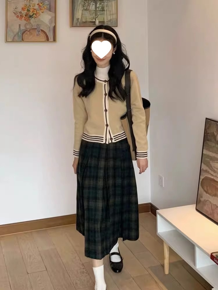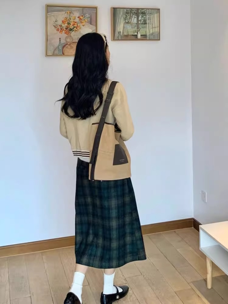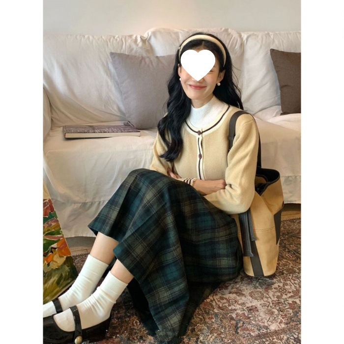 중간 길이의 레트로 그린 격자 무늬 모직 스커트 여성의 주름 치마스토어 가기