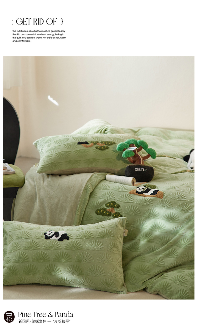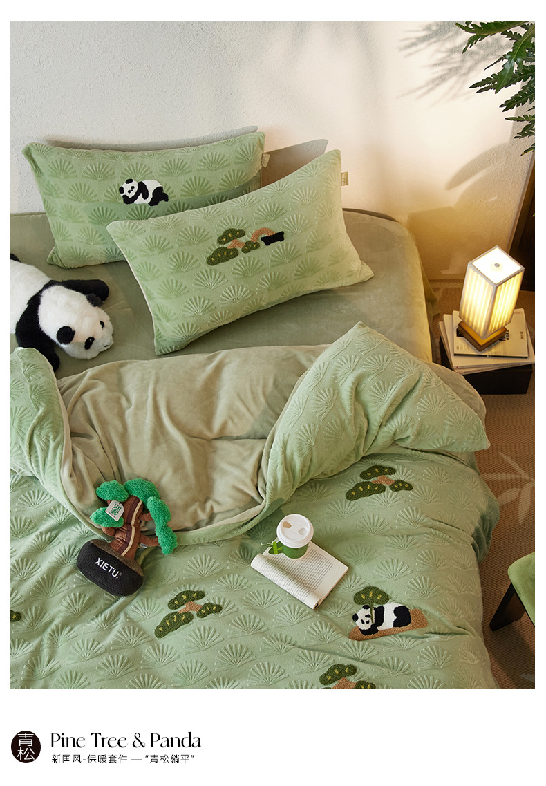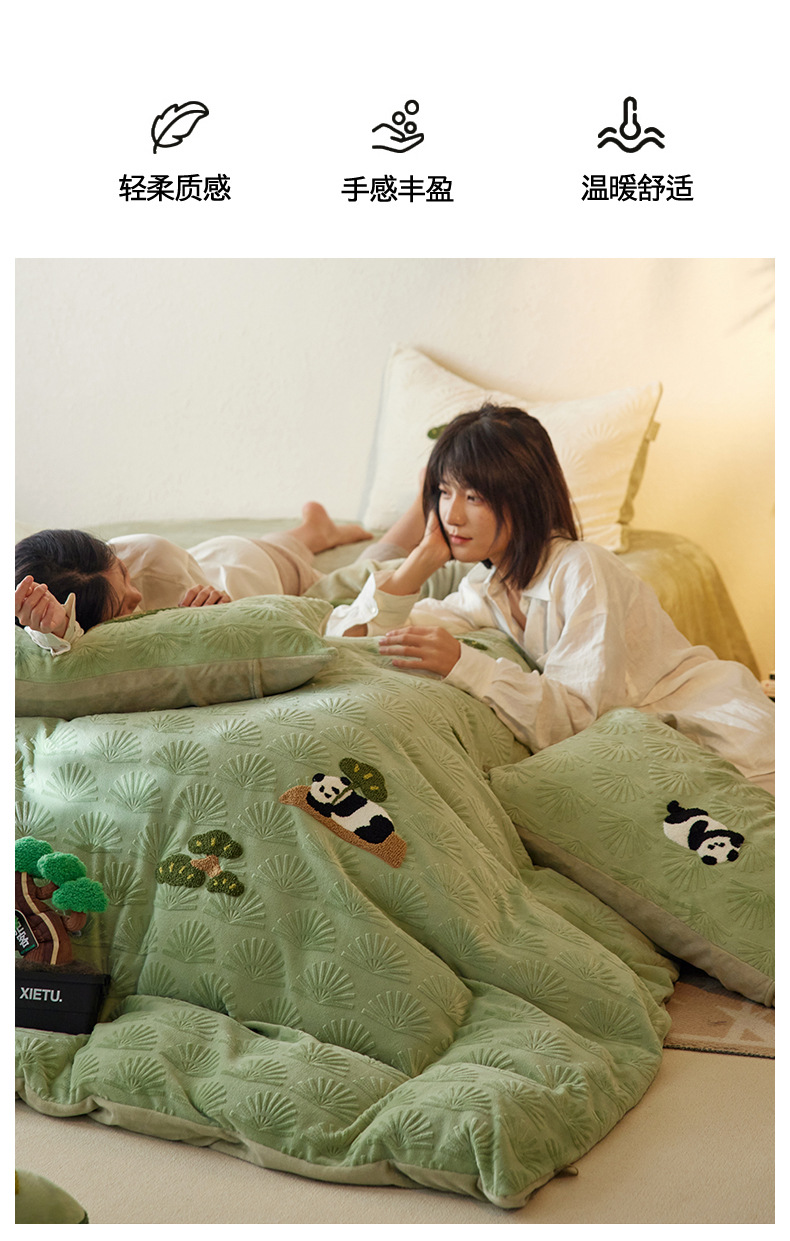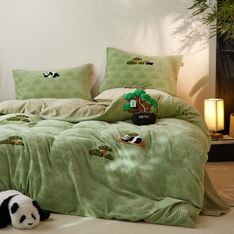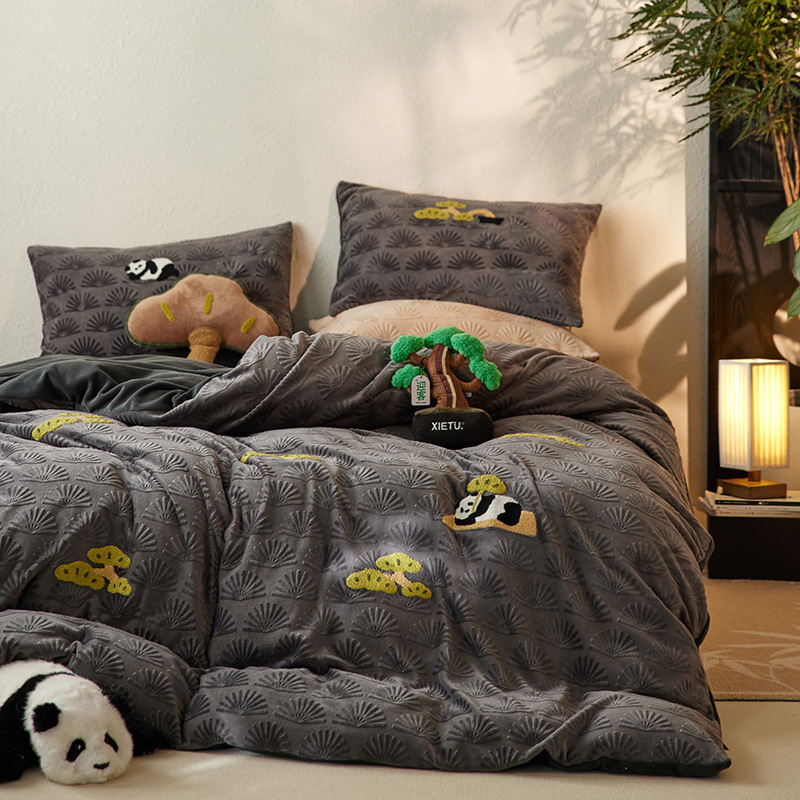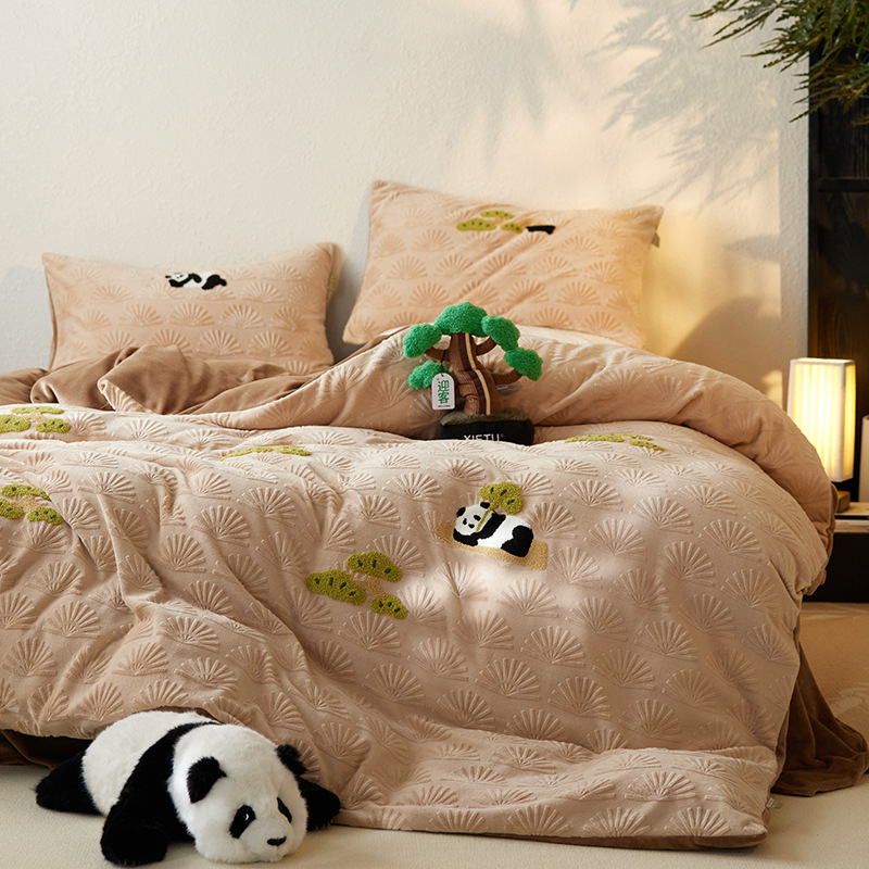 A 등급, 윈드 라이잉 플랫 팬더 스테레오 밀크 벨벳 4 피스 세트 타월 자수 양면 기모 침대 시트스토어 가기