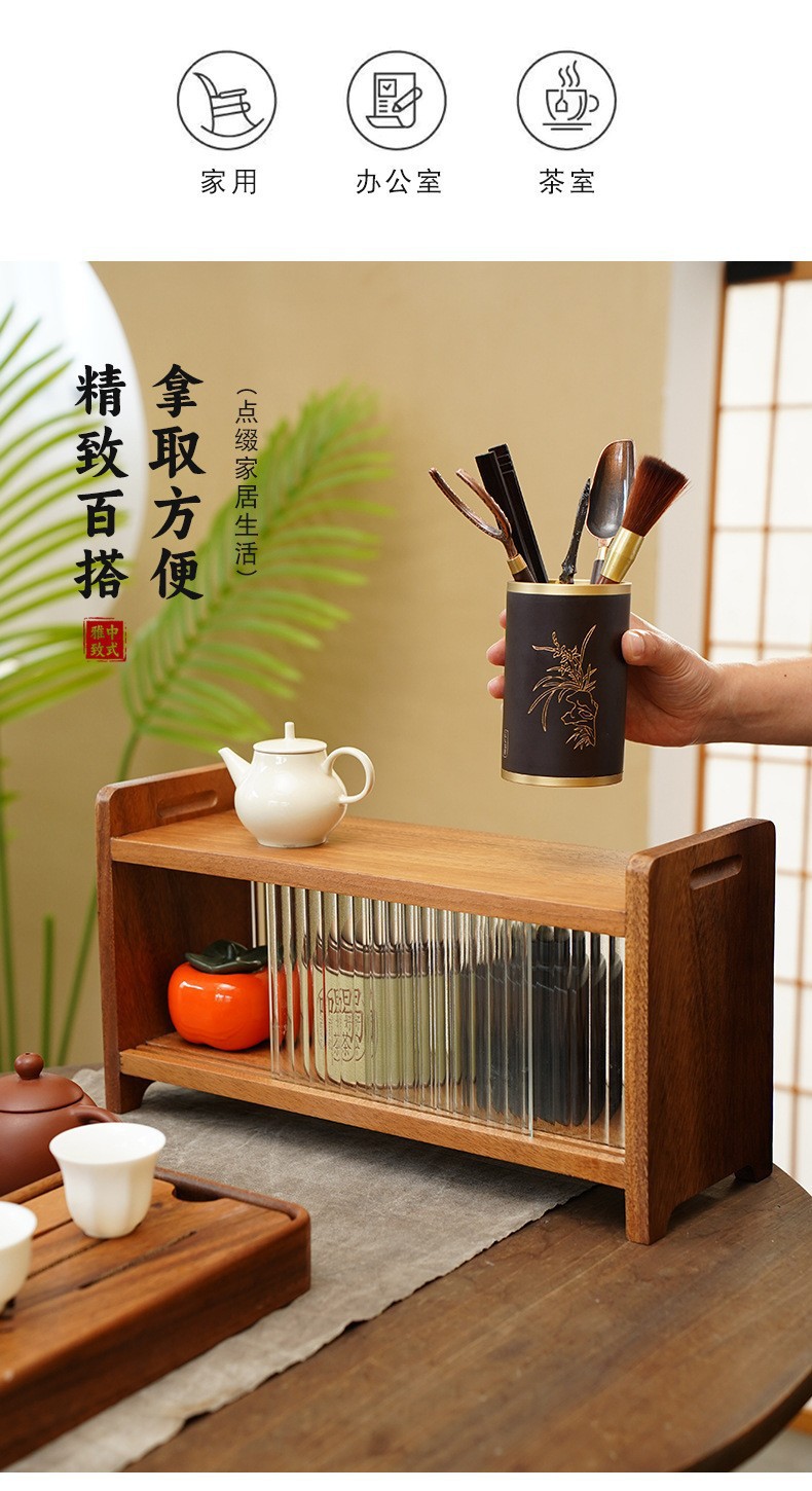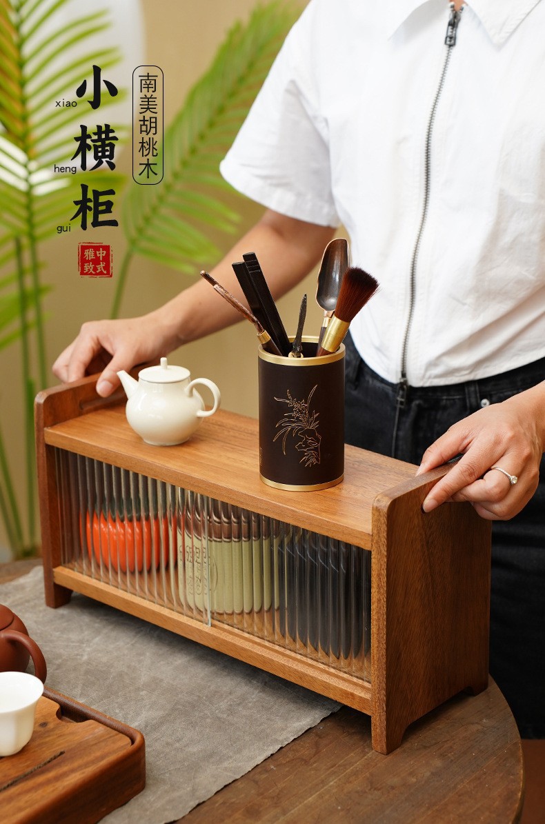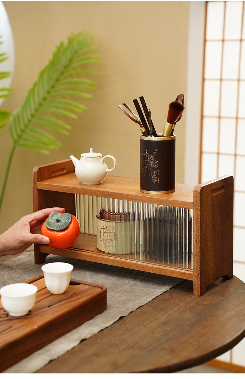 호두 나무 데스크탑 저장 캐비닛 주전자 차 세트 티 컵 저장 랙 화장품 보석 저장 상자 중국어 간단