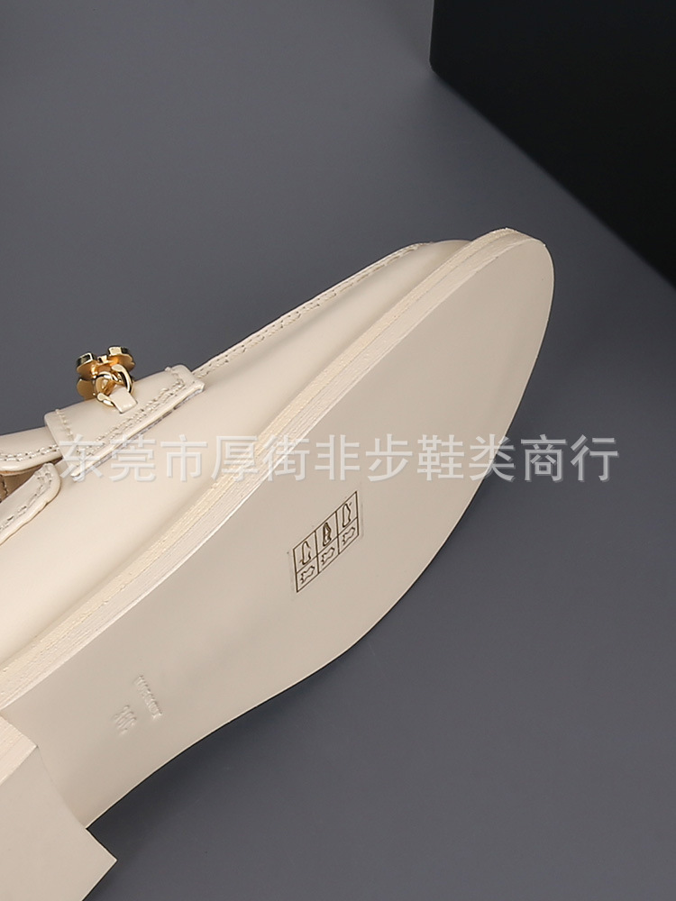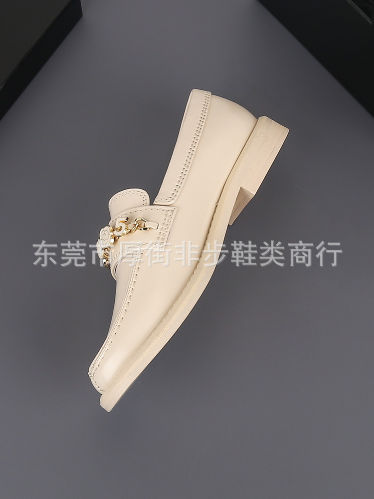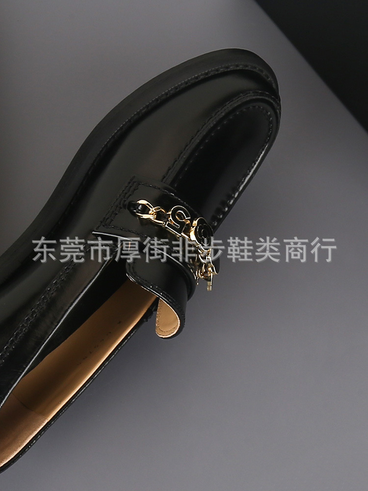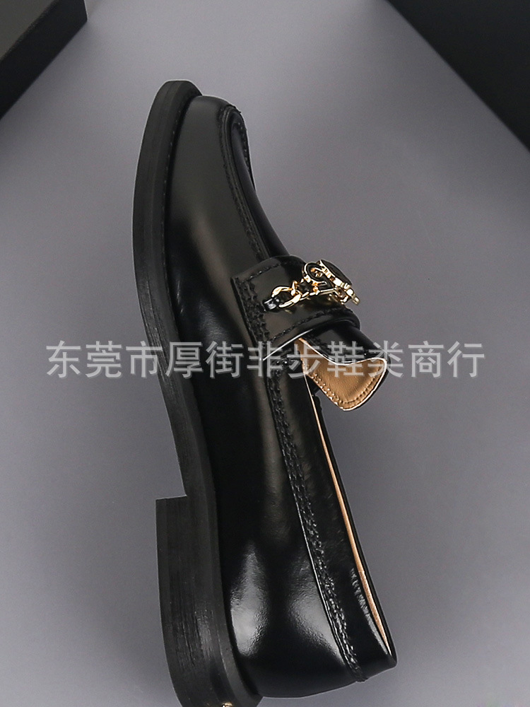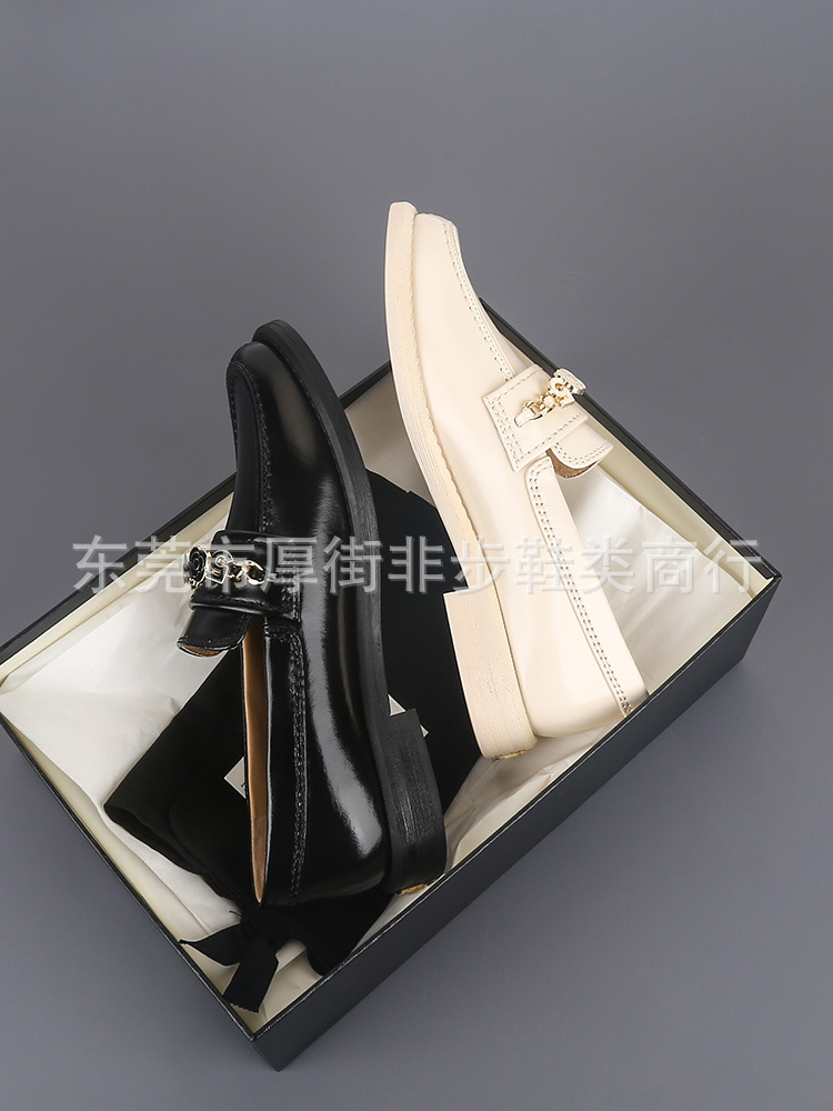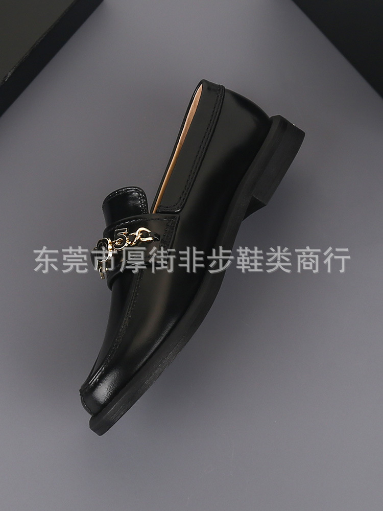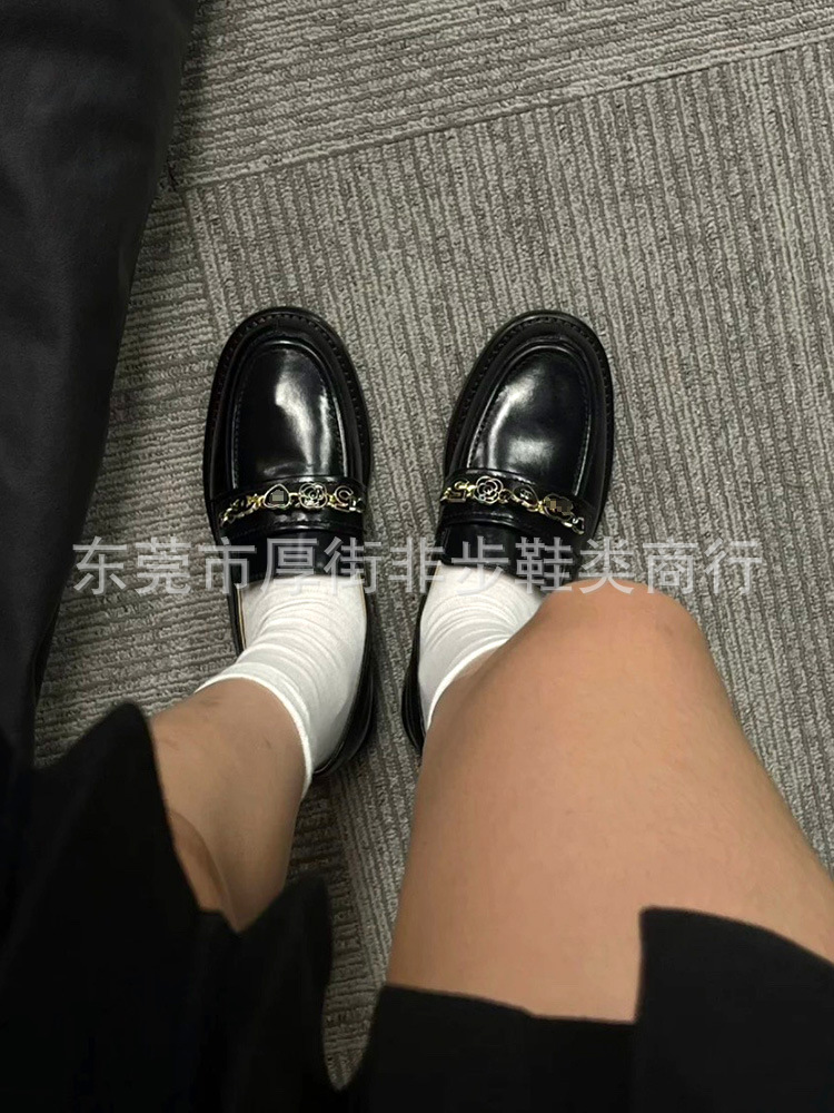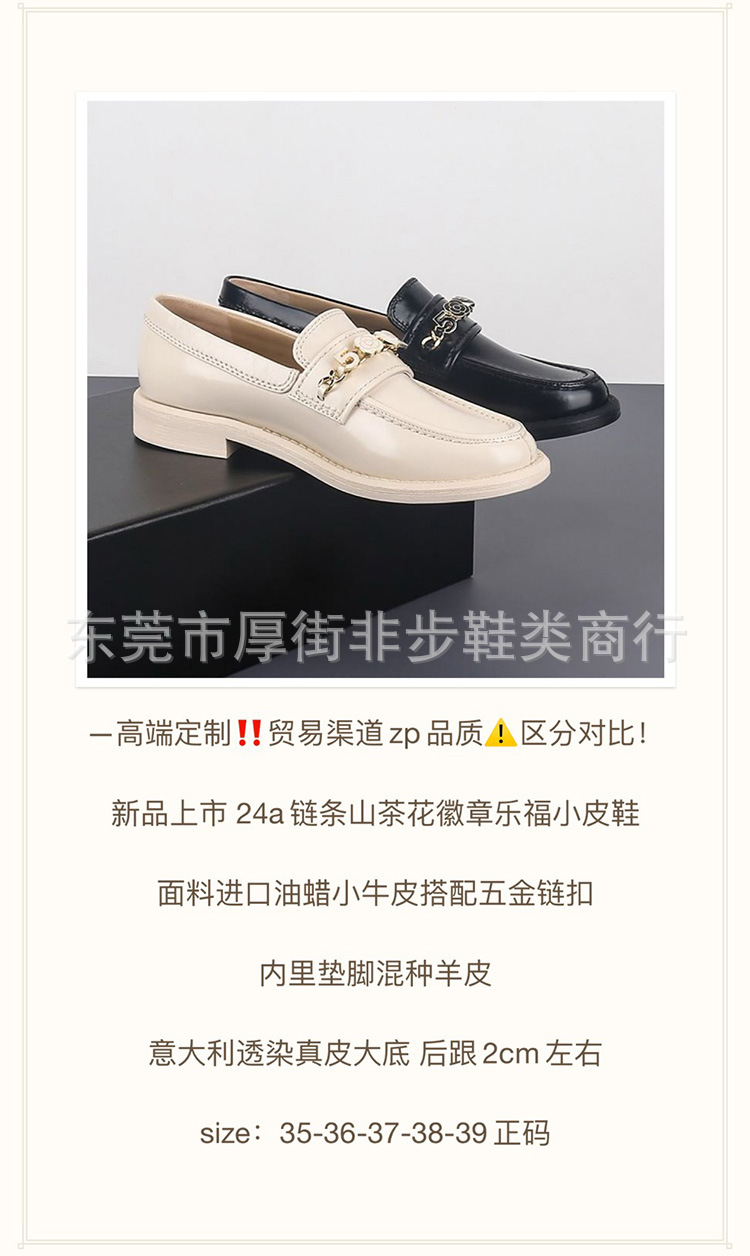 탑 플레이트 24a 금속 체인 동백 배지 로퍼 여성용 Cowhide 슬립 온 영국 가죽 신발 플랫 힐 신발