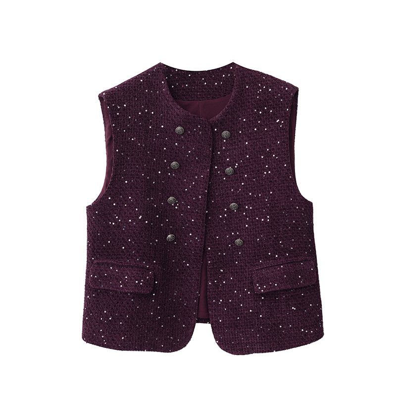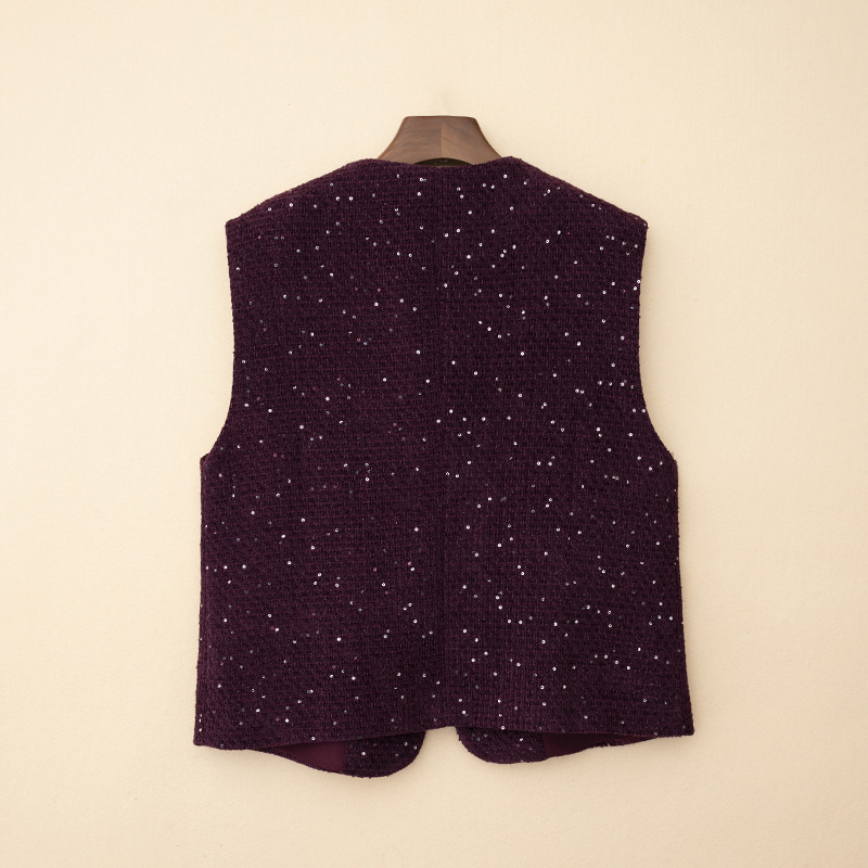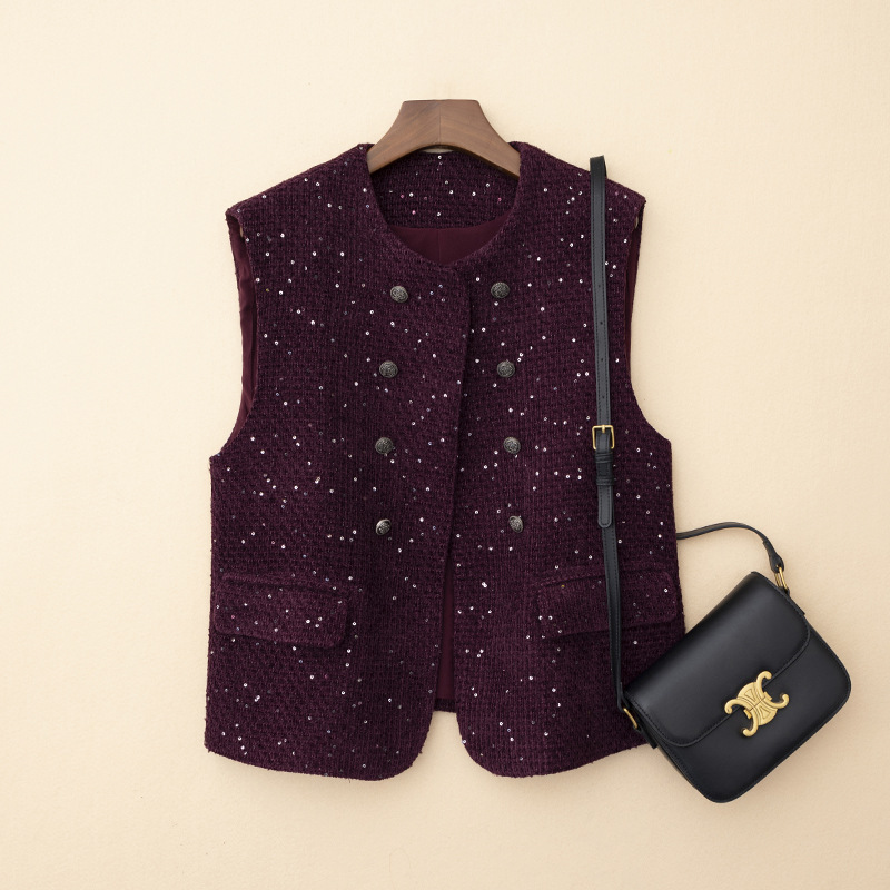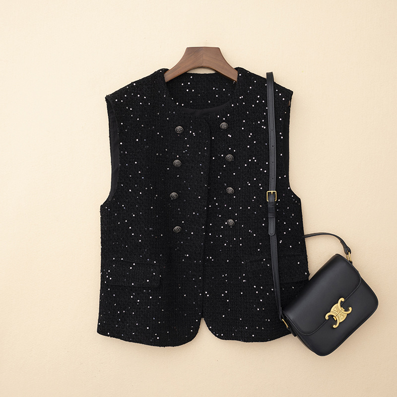 가을과 겨울 새로운 버클 조끼 여성의 우아한 모직 절묘한 밝은 실크 쌓인 패션 샤넬 스타일 연령 감소 조끼 탑