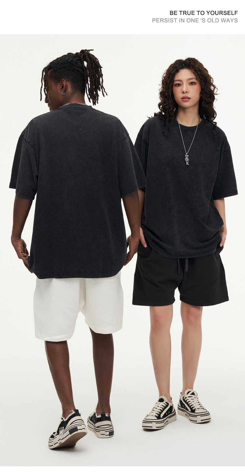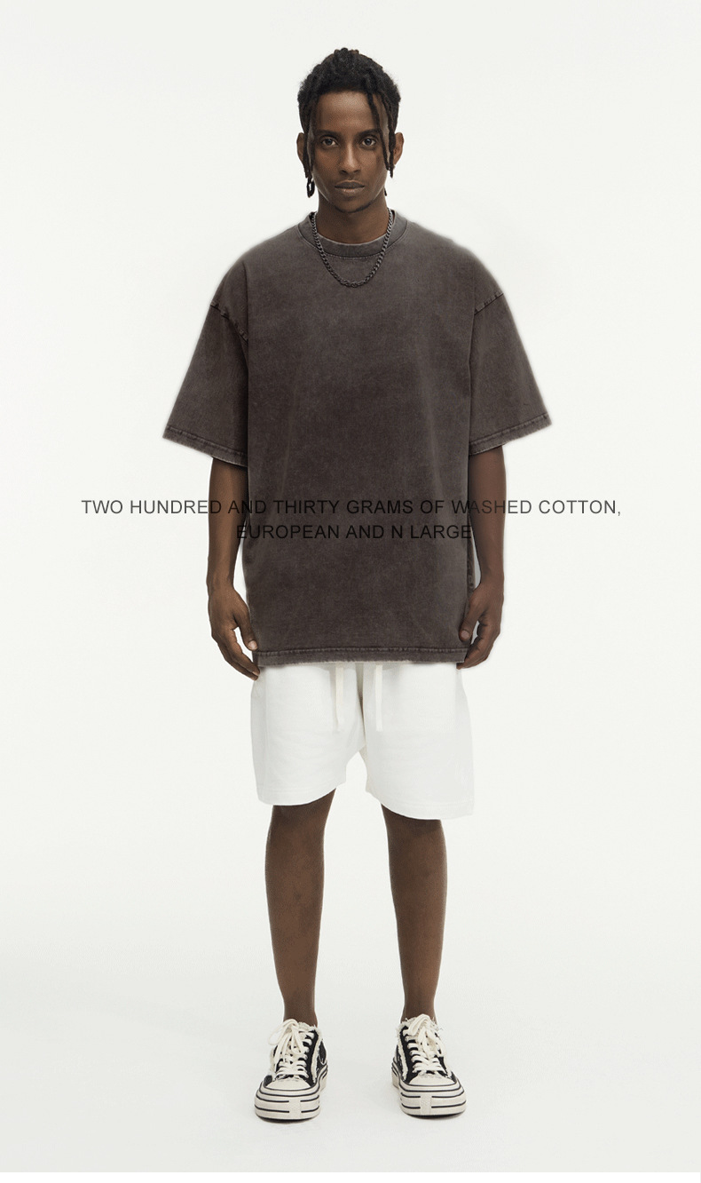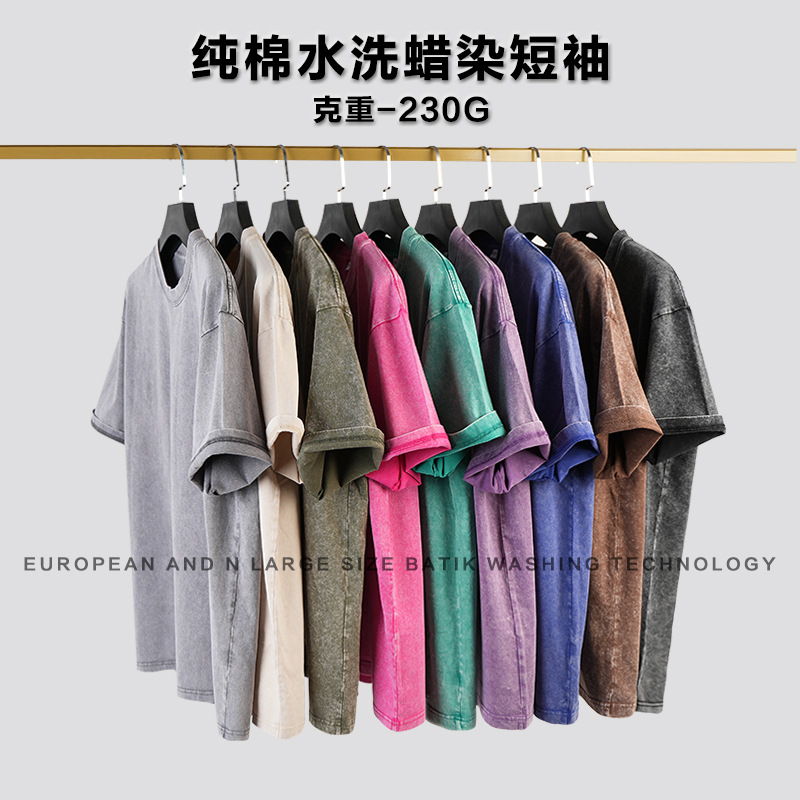 유럽 사이즈 씻은 바틱 올드 헤비 코튼 티셔츠 Oversize230g 남성용 느슨한 눈송이 짧은 소매스토어 가기
