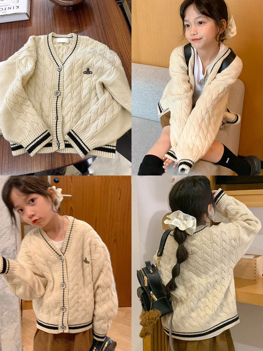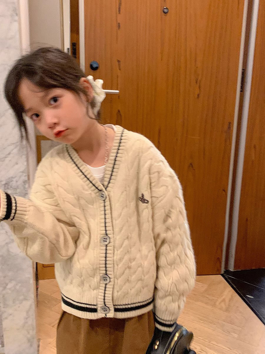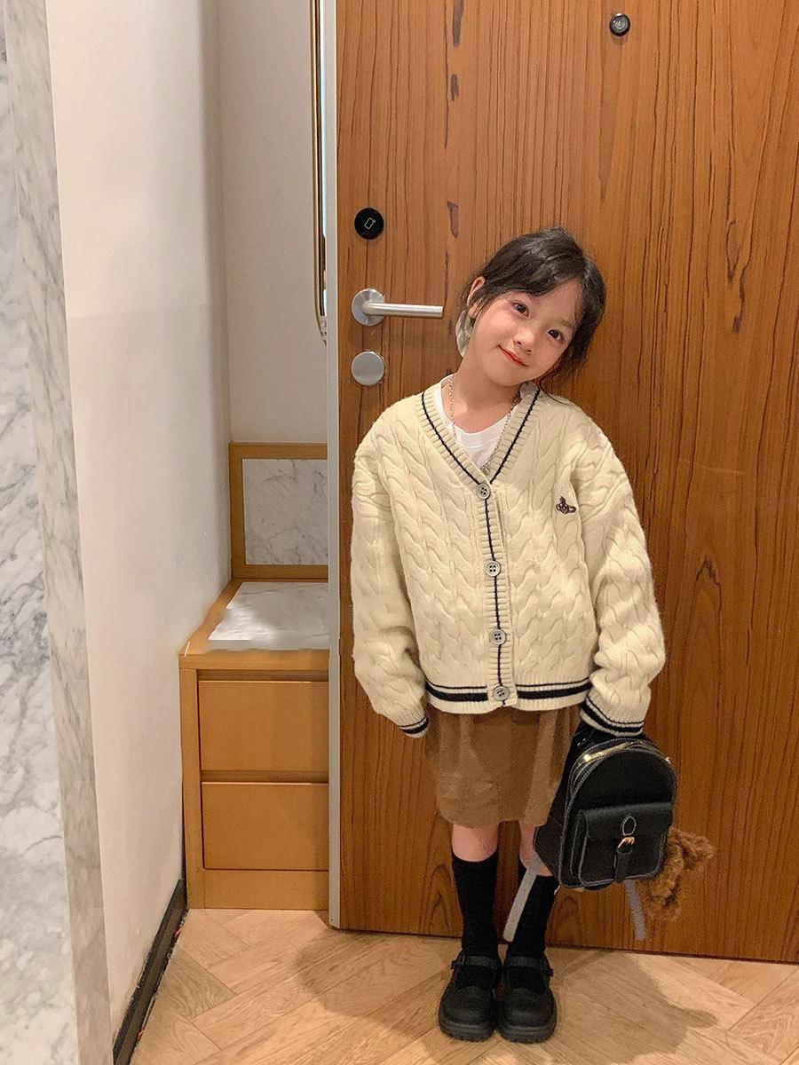 한국 아동복 2024 가을 새 소녀 베이지 트위스트 학업 스타일 스웨터 코트 어린이 스웨터 탑스토어 가기