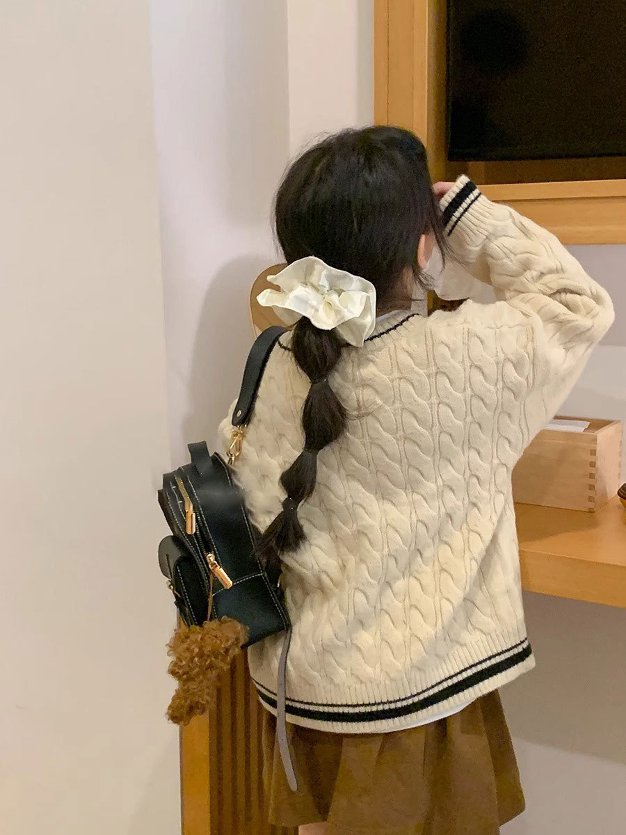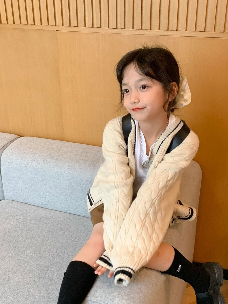 한국 아동복 2024 가을 새 소녀 베이지 트위스트 학업 스타일 스웨터 코트 어린이 스웨터 탑
