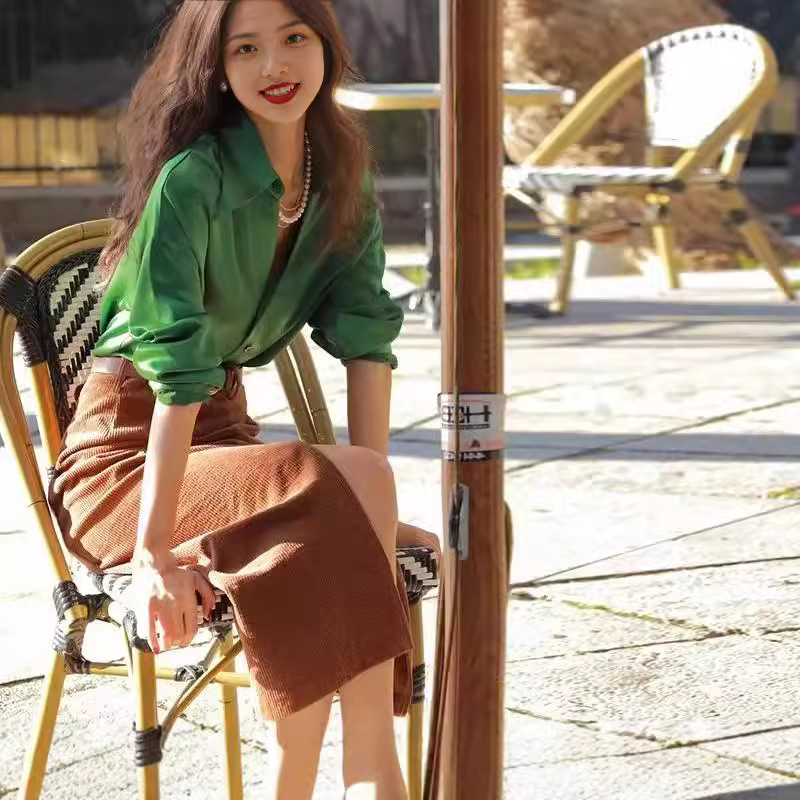 2025년 봄 가을 여성복 신상 프렌치 스타일 고급스러운 중년 여성 스타일 그린 셔츠와 스커트 투피스 세트스토어 가기