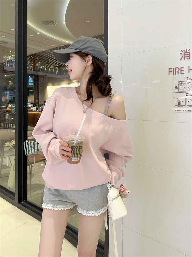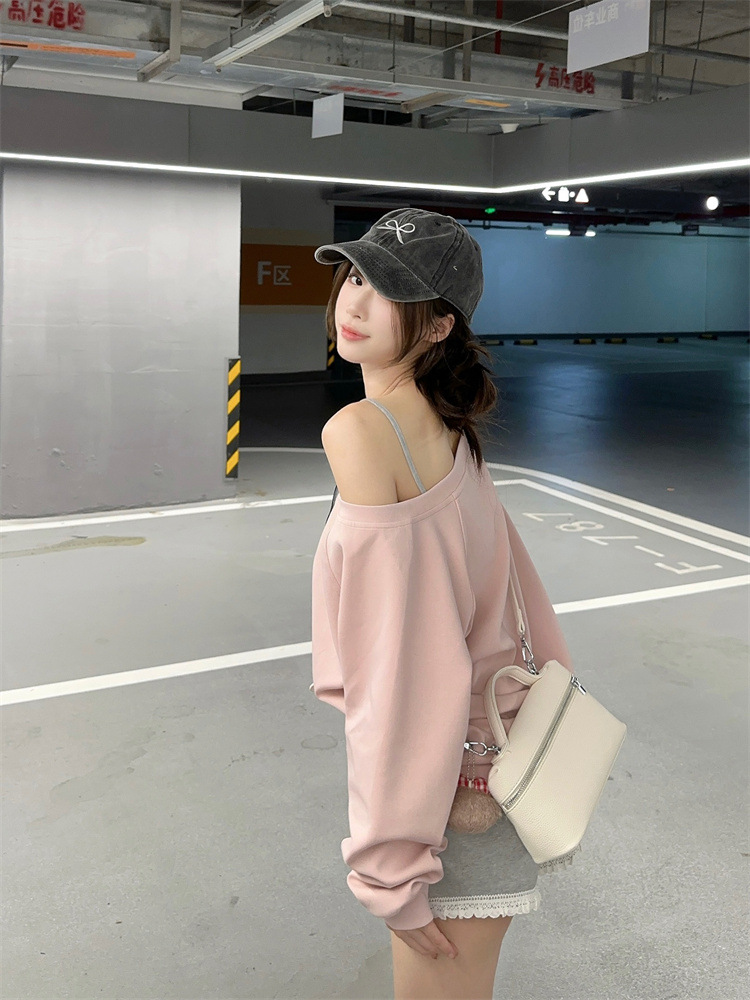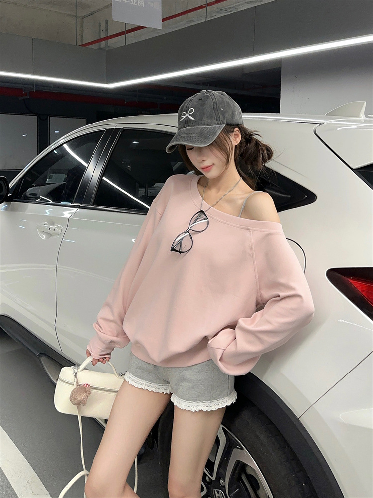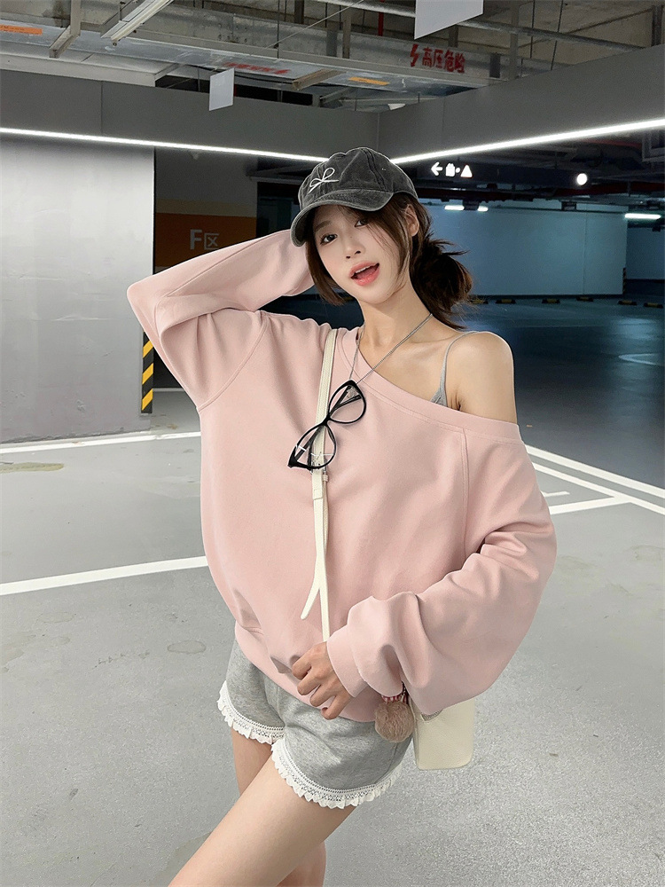 핑크 어깨 긴팔 여성용 가을 2024 새로운 게으른 스타일 느슨한 슬리밍 캐주얼 오프 숄더 풀오버 탑