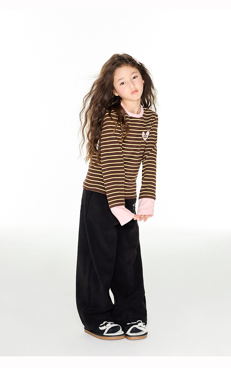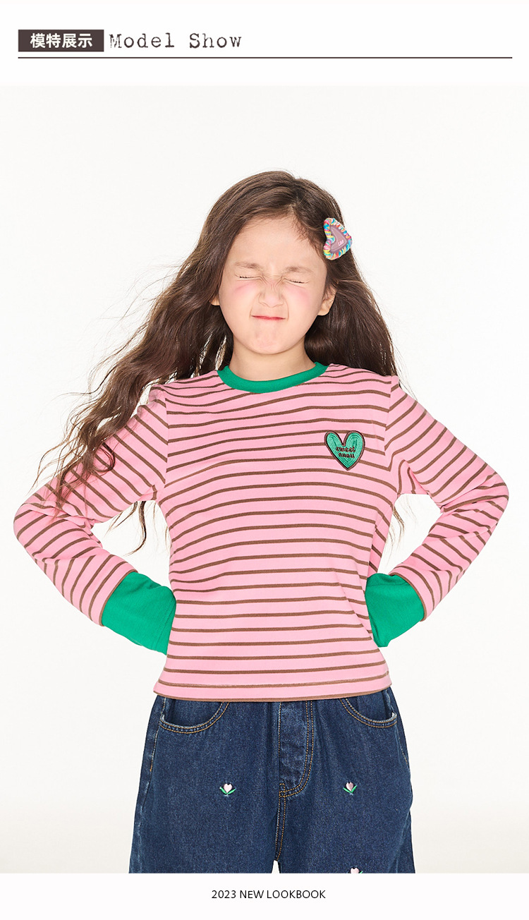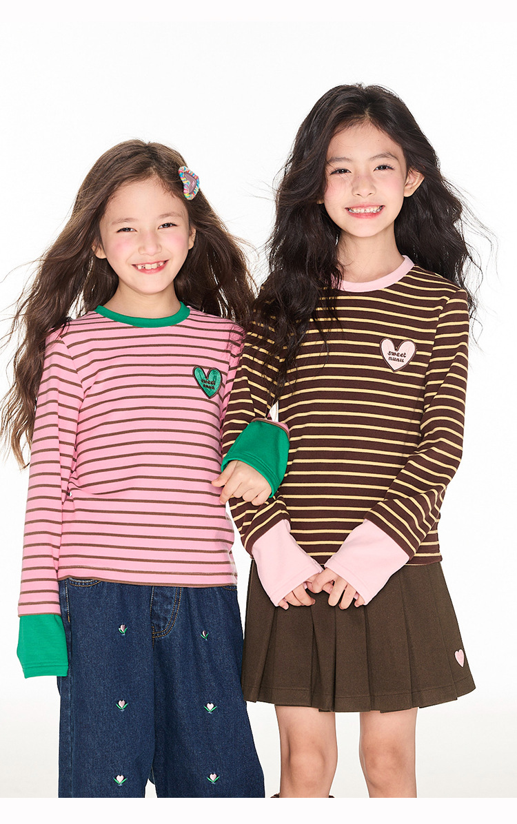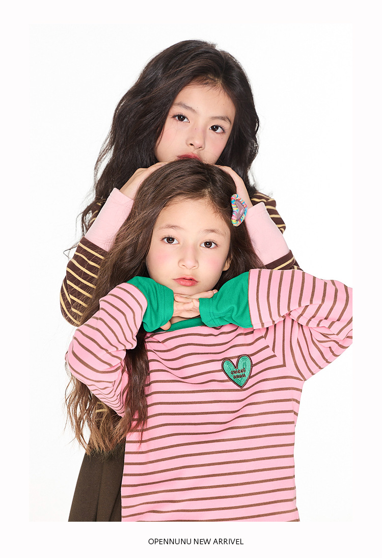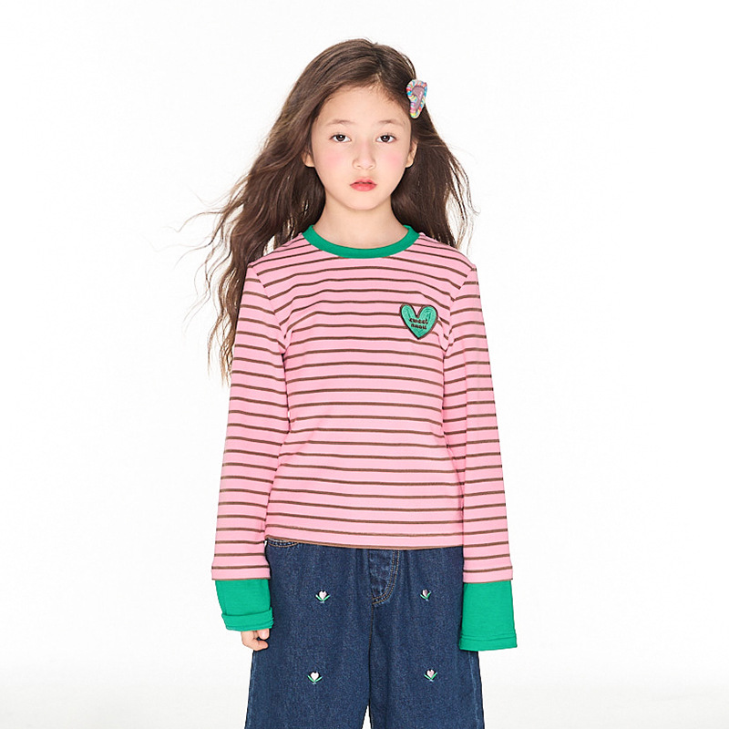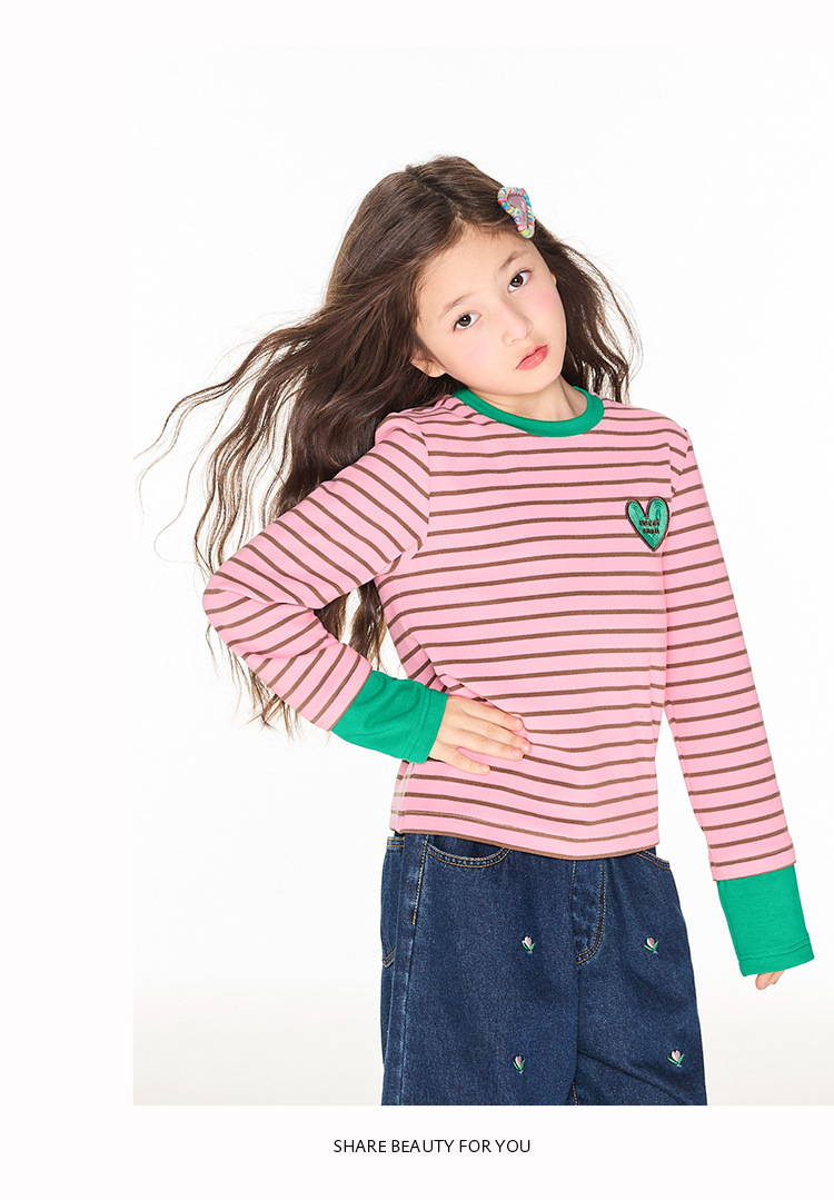 여아 하트 비트 의상, 배색 스트라이프 긴팔 티셔츠, 가을 투톤 러브 로고 슬림핏 셔츠스토어 가기