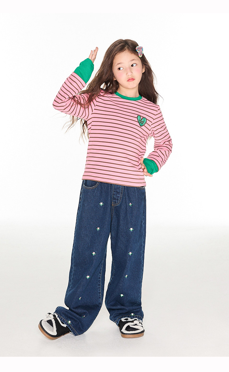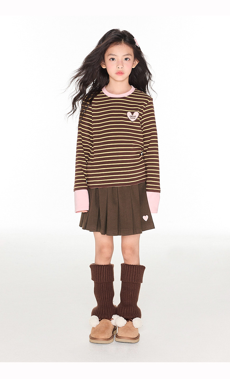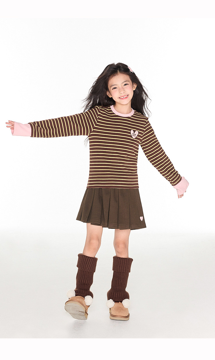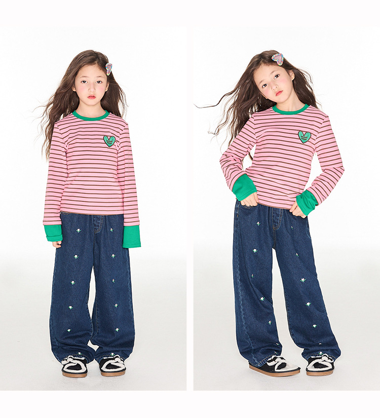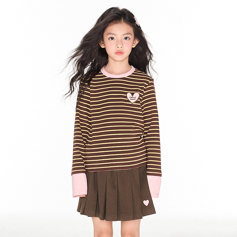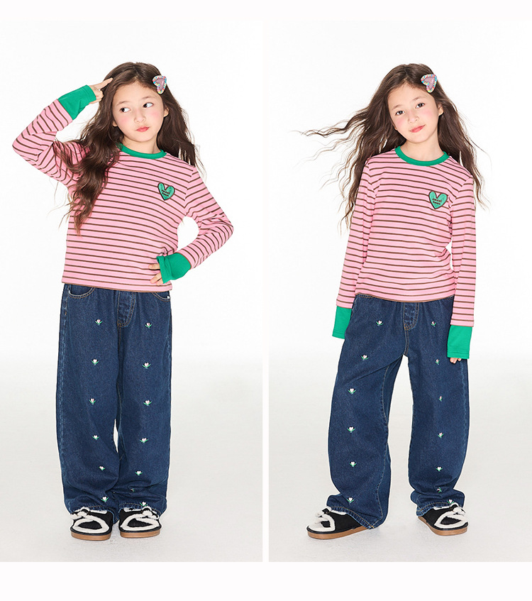 여아 하트 비트 의상, 배색 스트라이프 긴팔 티셔츠, 가을 투톤 러브 로고 슬림핏 셔츠스토어 가기