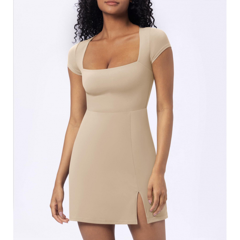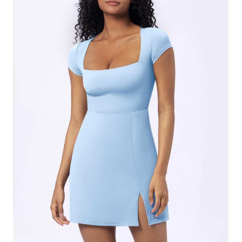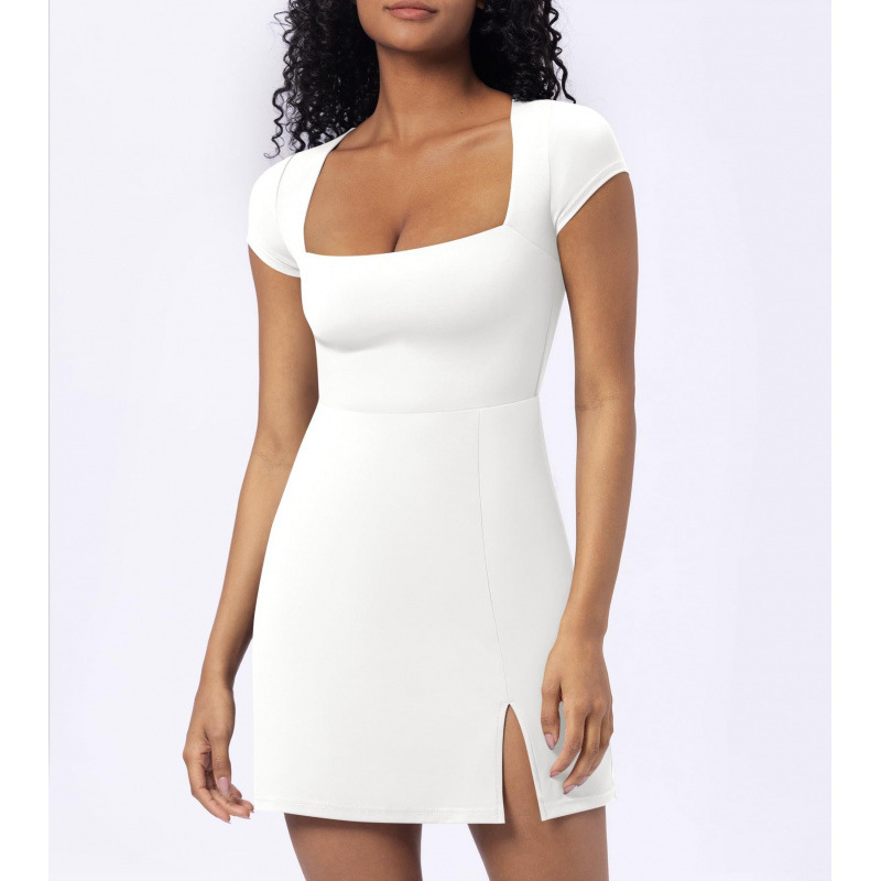 유럽과 미국 2024 새로운 사이드 스플릿 슬리밍 A 자형 여성의 섹시한 슬림 스퀘어 칼라 하프 소매 원피스스토어 가기