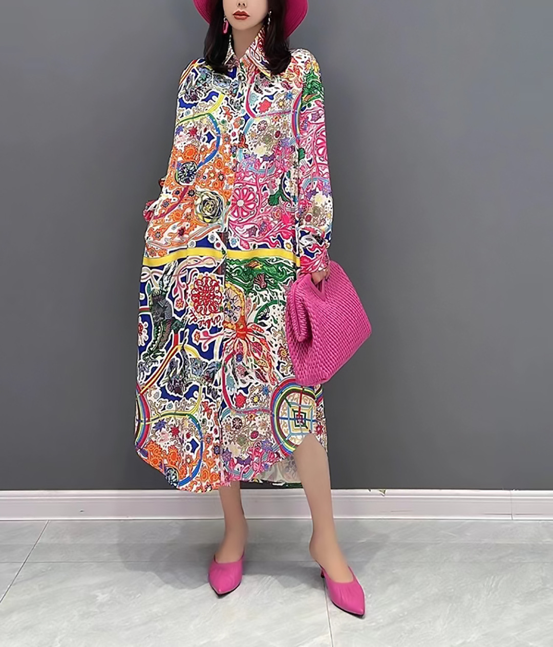 태국 패션 브랜드 2024 봄과 여름 휴가 스타일 우아한 올 매치 느슨한 인쇄 빈티지 긴 셔츠 원피스 여성
