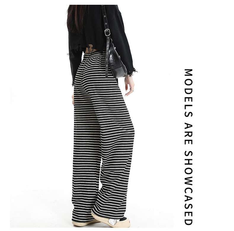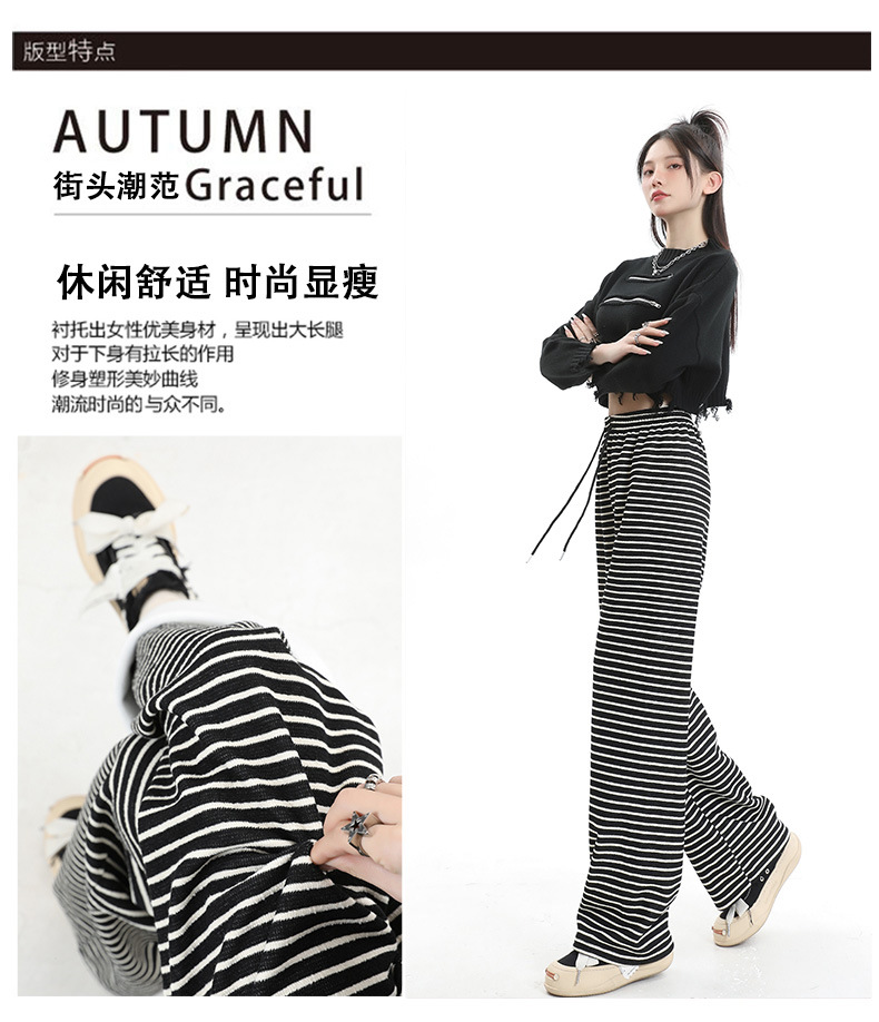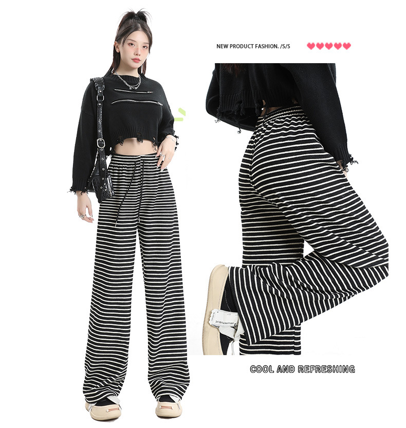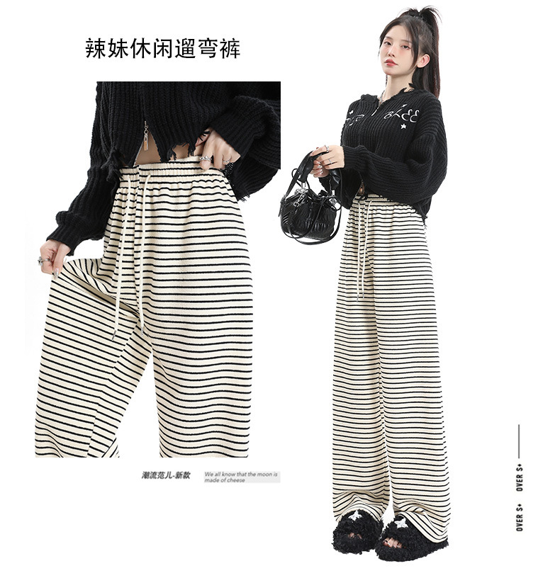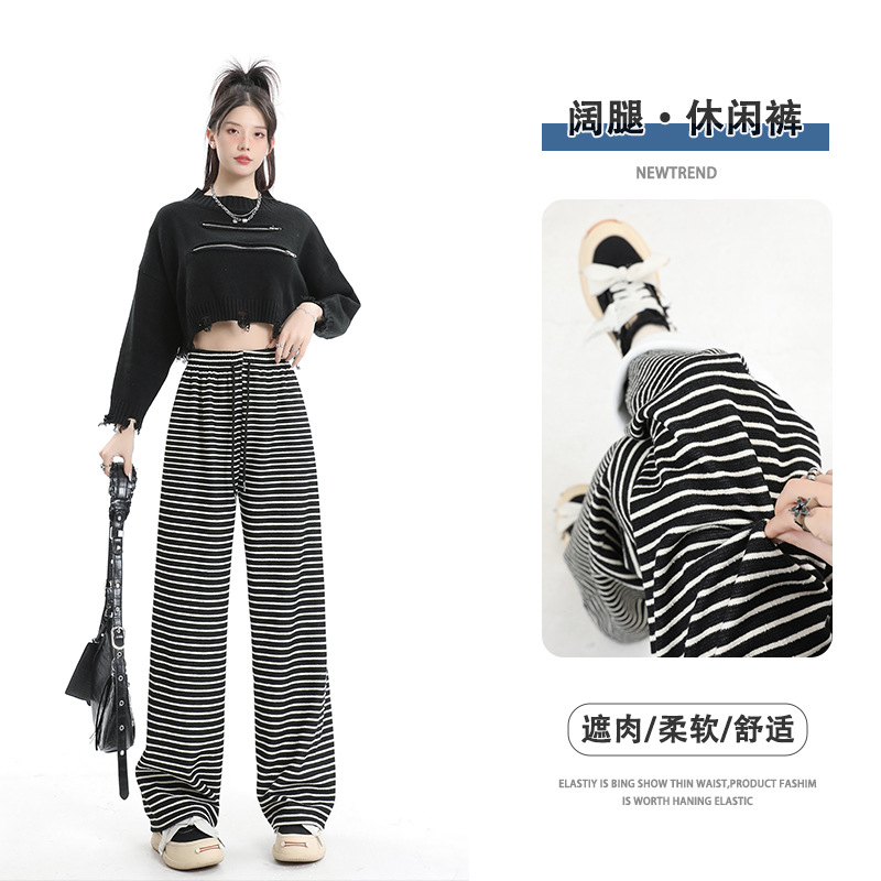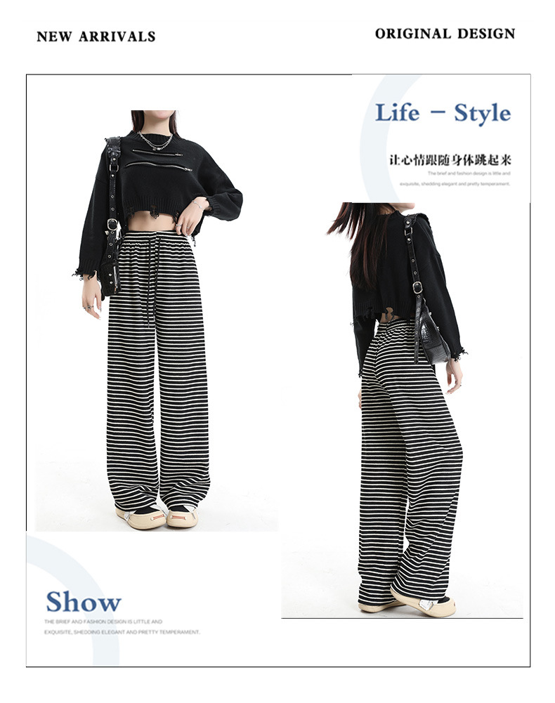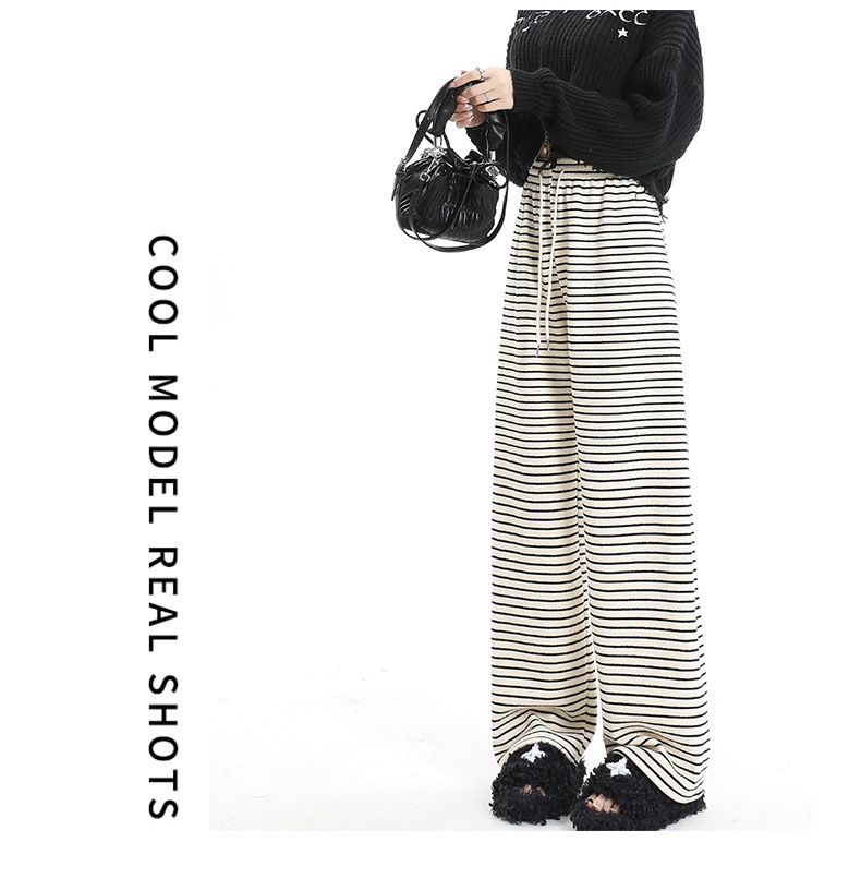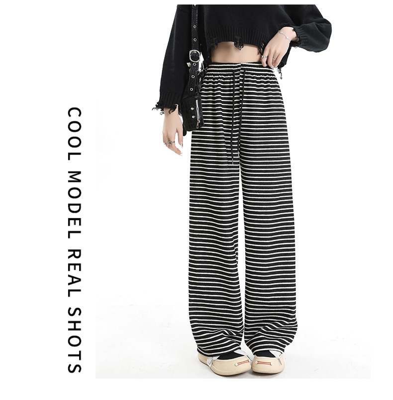 게으른 스타일 느슨한 넓은 다리 줄무늬 바지 Drawstring dipped 캐주얼 워킹 바지 여성용 검은 줄무늬 쌀 화이트 스트라이프