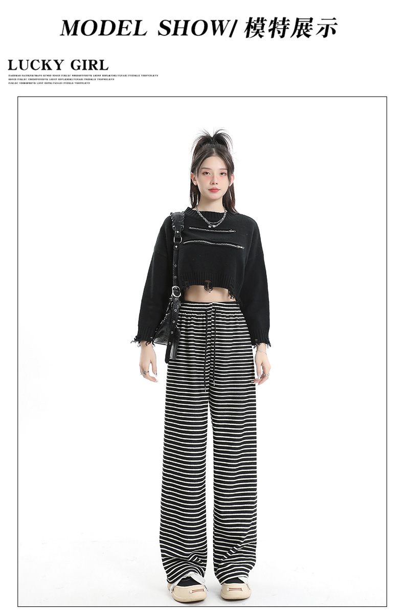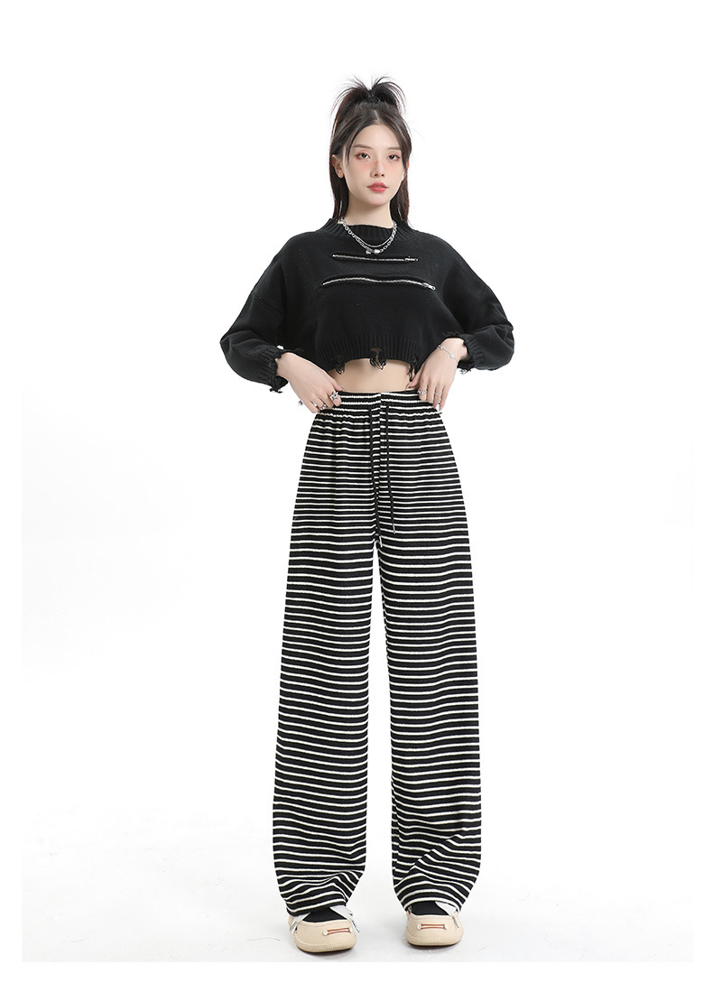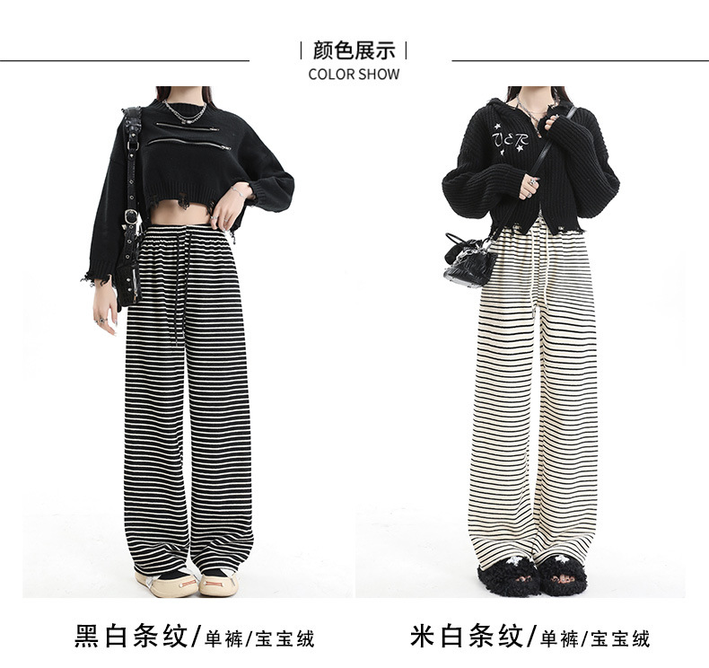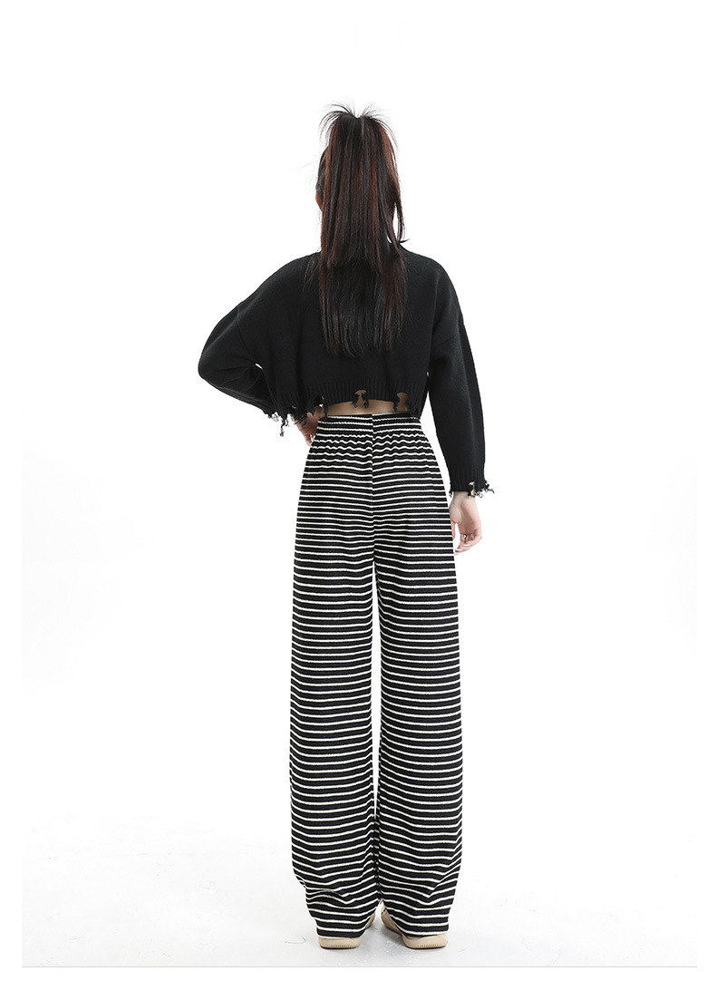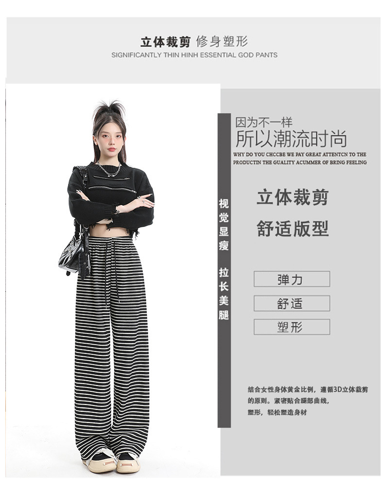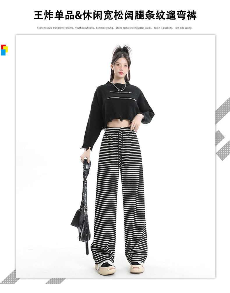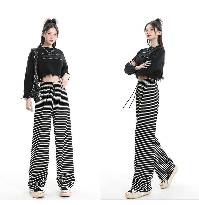 게으른 스타일 느슨한 넓은 다리 줄무늬 바지 Drawstring dipped 캐주얼 워킹 바지 여성용 검은 줄무늬 쌀 화이트 스트라이프