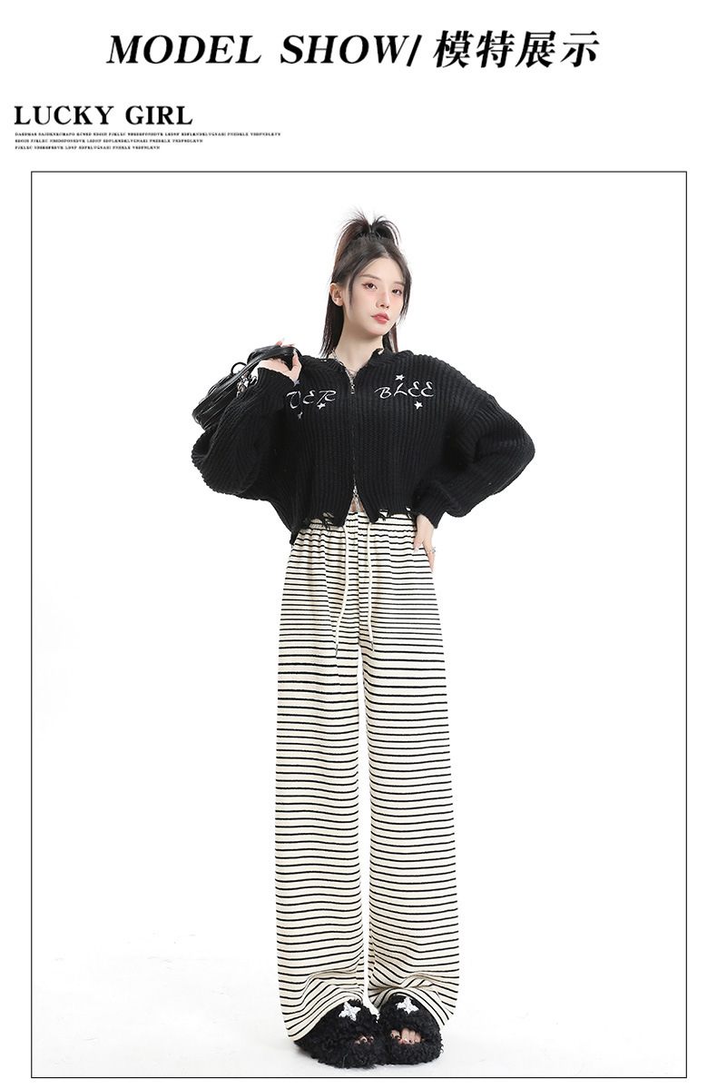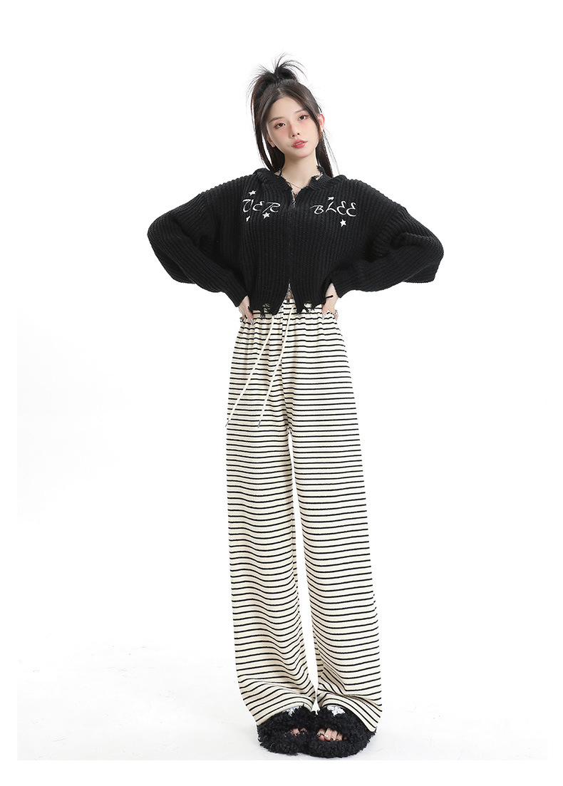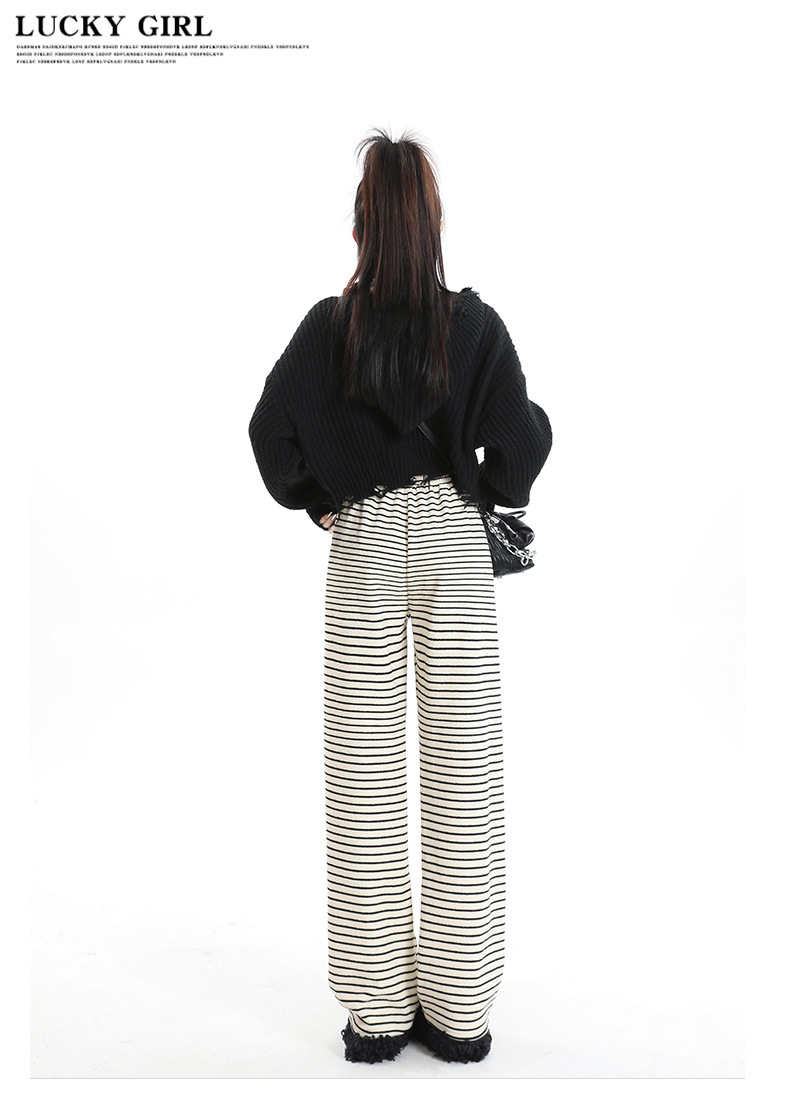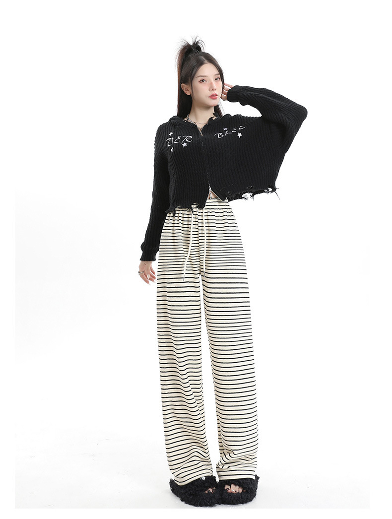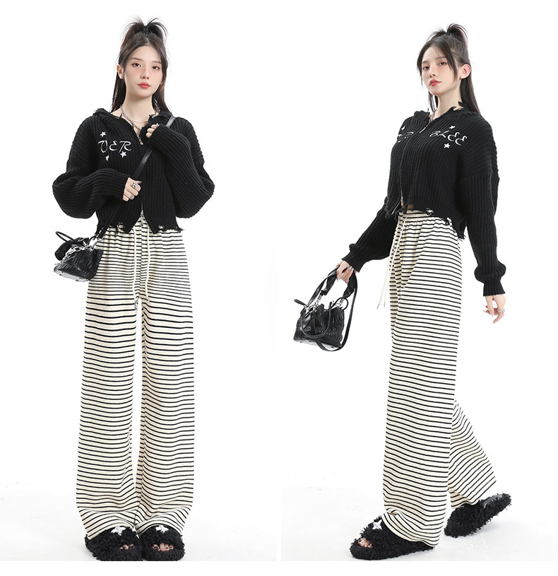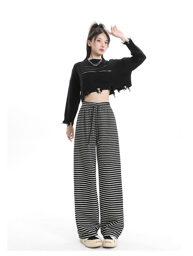 게으른 스타일 느슨한 넓은 다리 줄무늬 바지 Drawstring dipped 캐주얼 워킹 바지 여성용 검은 줄무늬 쌀 화이트 스트라이프