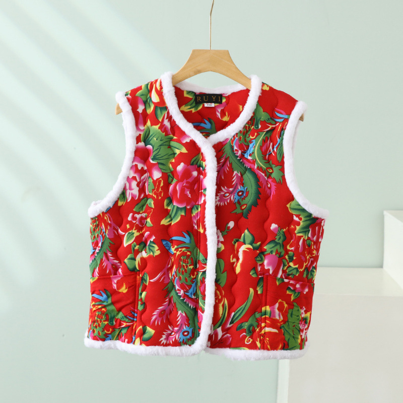 중국 스타일 조끼 동북 민속 큰 꽃 면화 가을 및 겨울 기모 두꺼운 외부 착용 실크 코튼 재킷