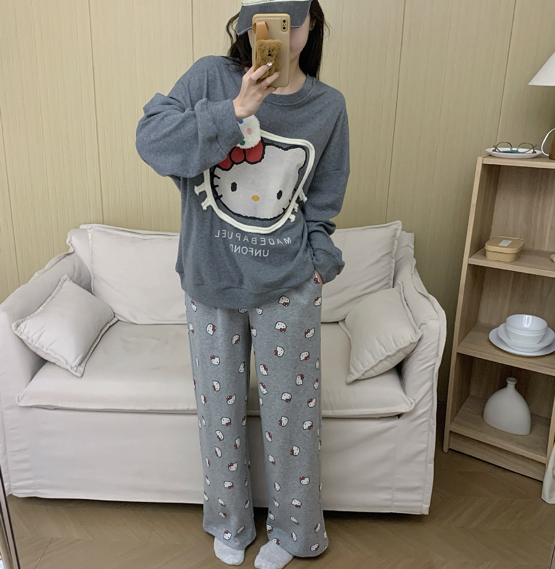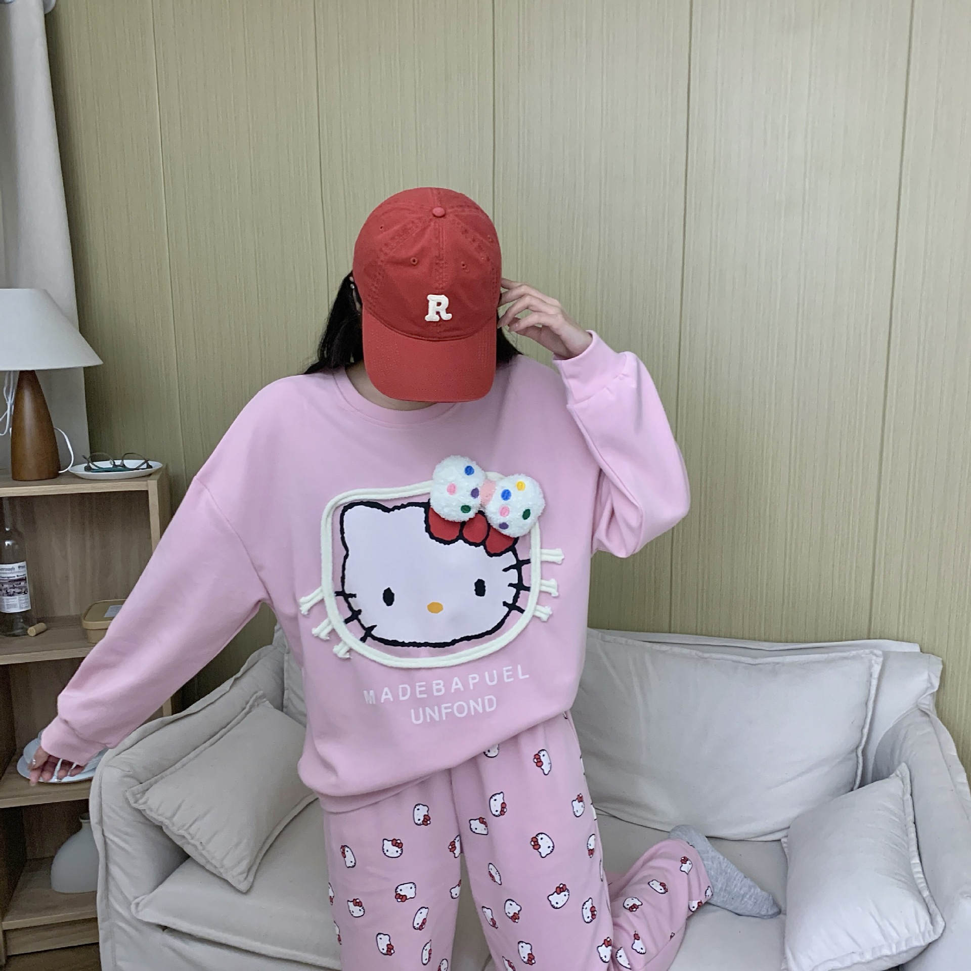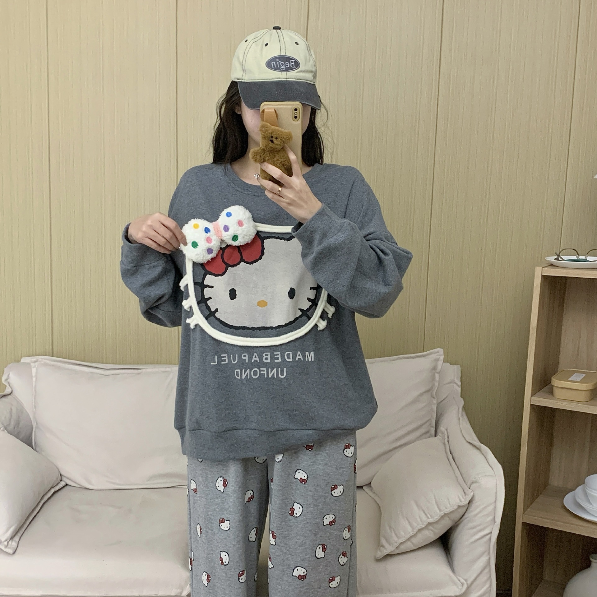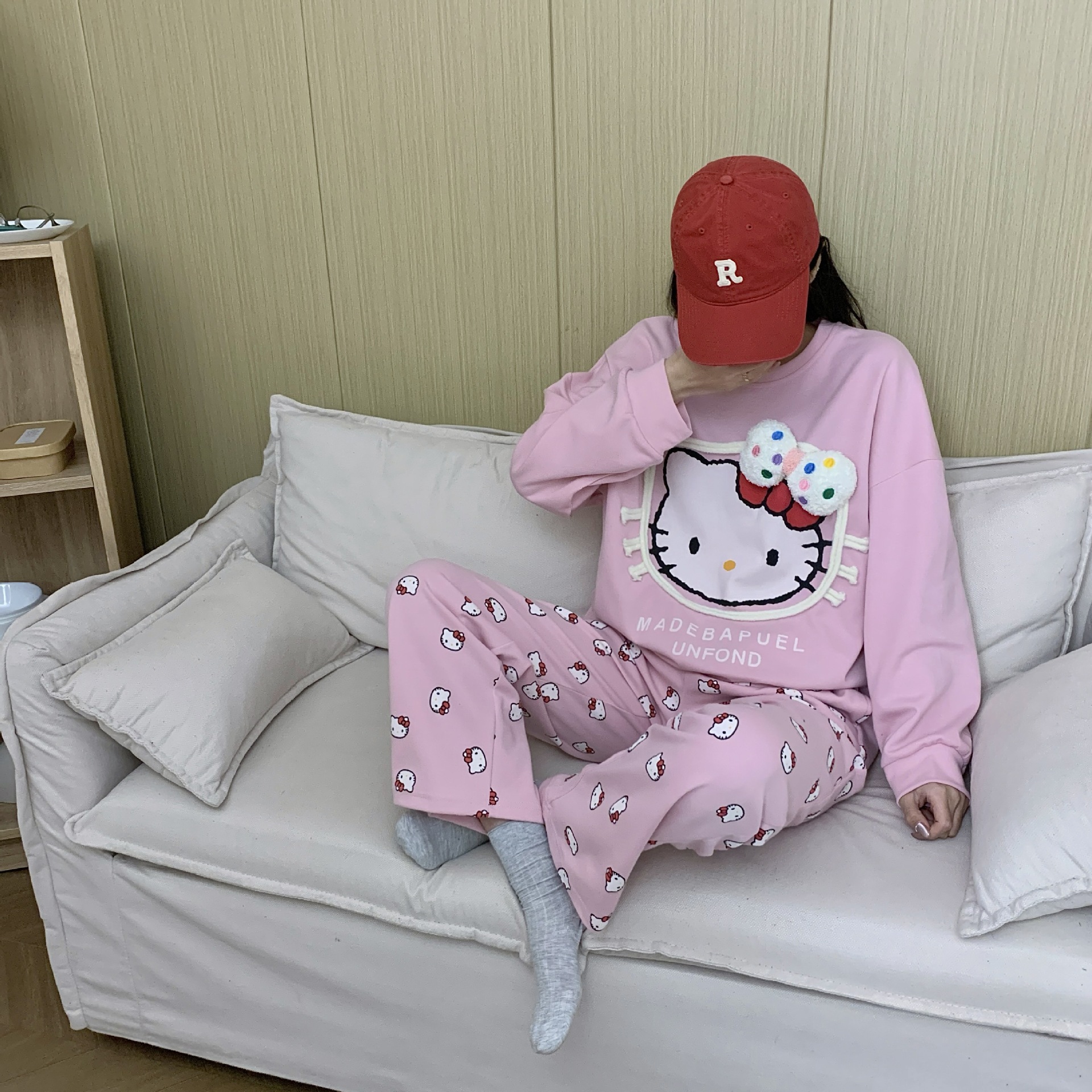 잠옷 여성의 가을과 겨울 새로운 달콤한 소녀의 귀여운 헬로 키티 인쇄 긴 소매 바지 외부 착용 세트 홈 옷스토어 가기