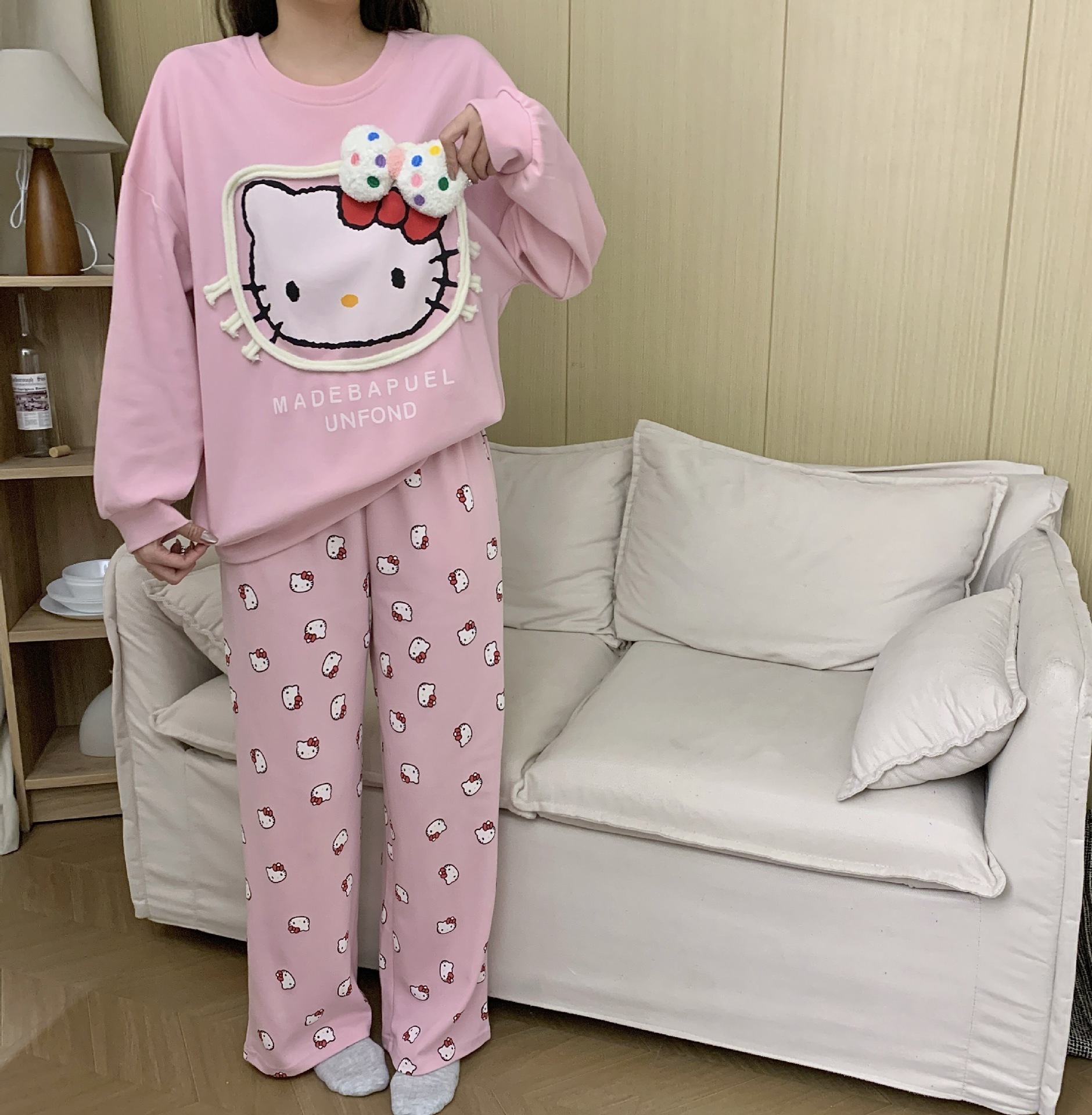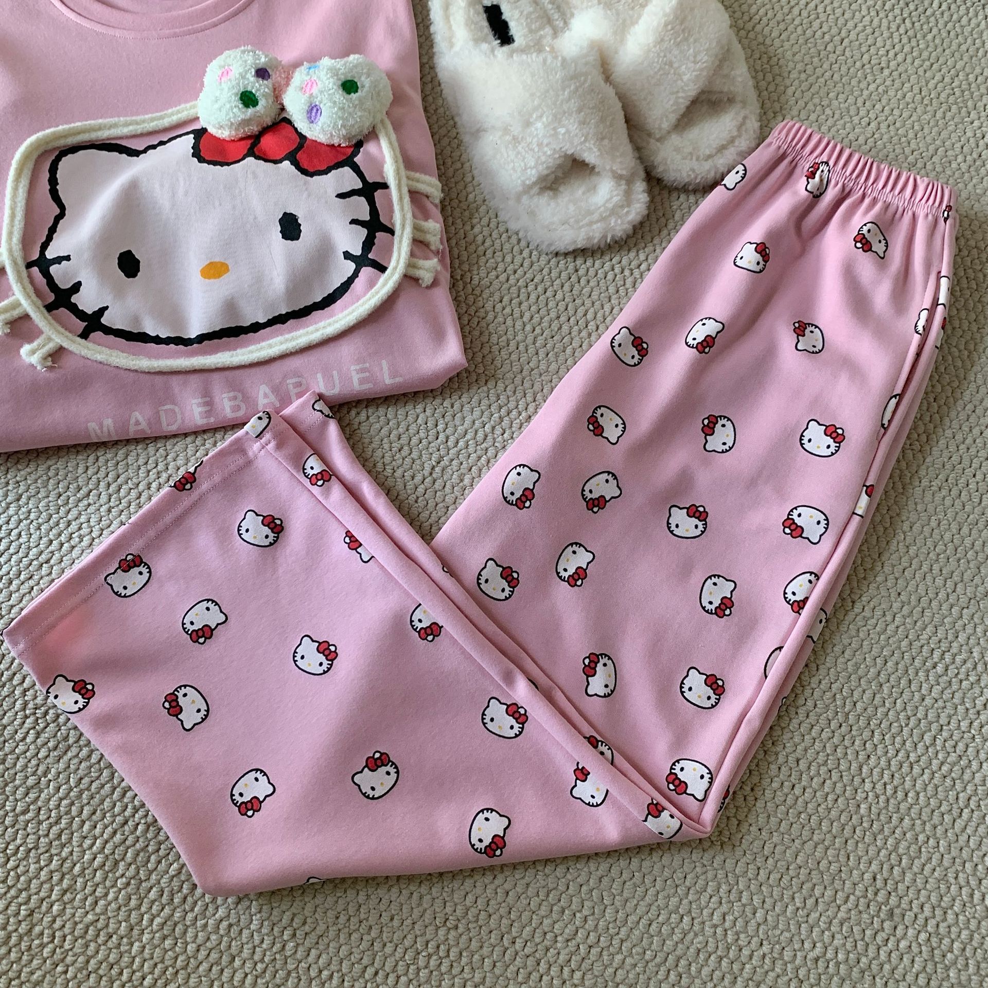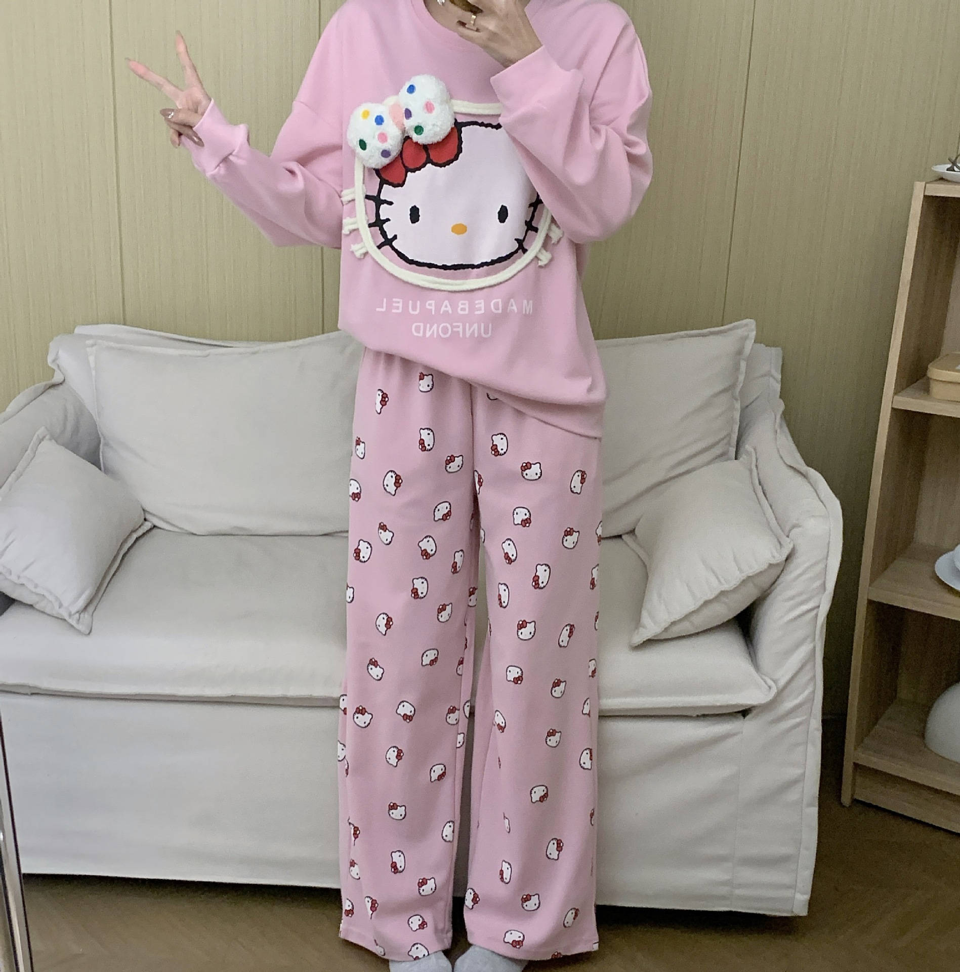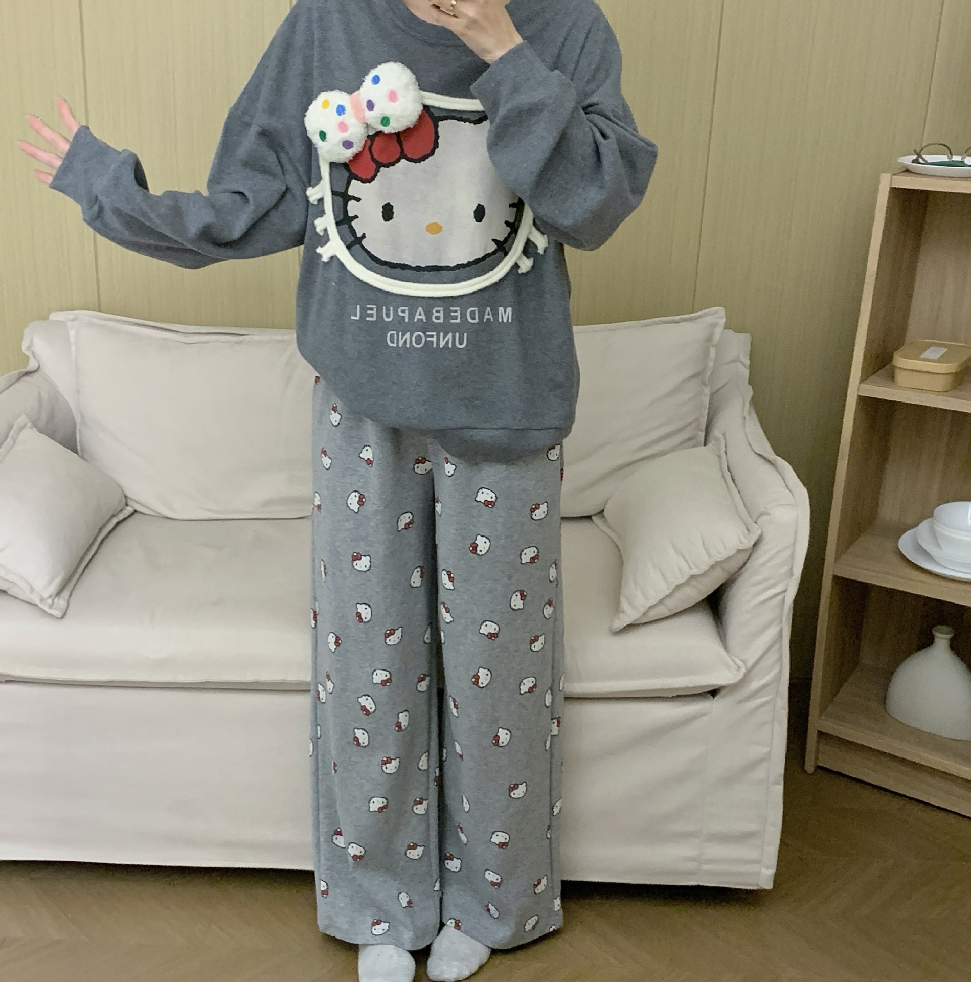 잠옷 여성의 가을과 겨울 새로운 달콤한 소녀의 귀여운 헬로 키티 인쇄 긴 소매 바지 외부 착용 세트 홈 옷스토어 가기
