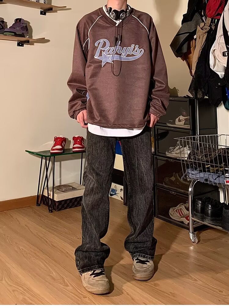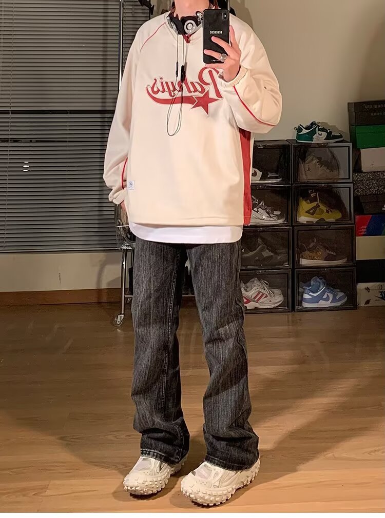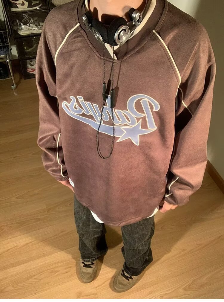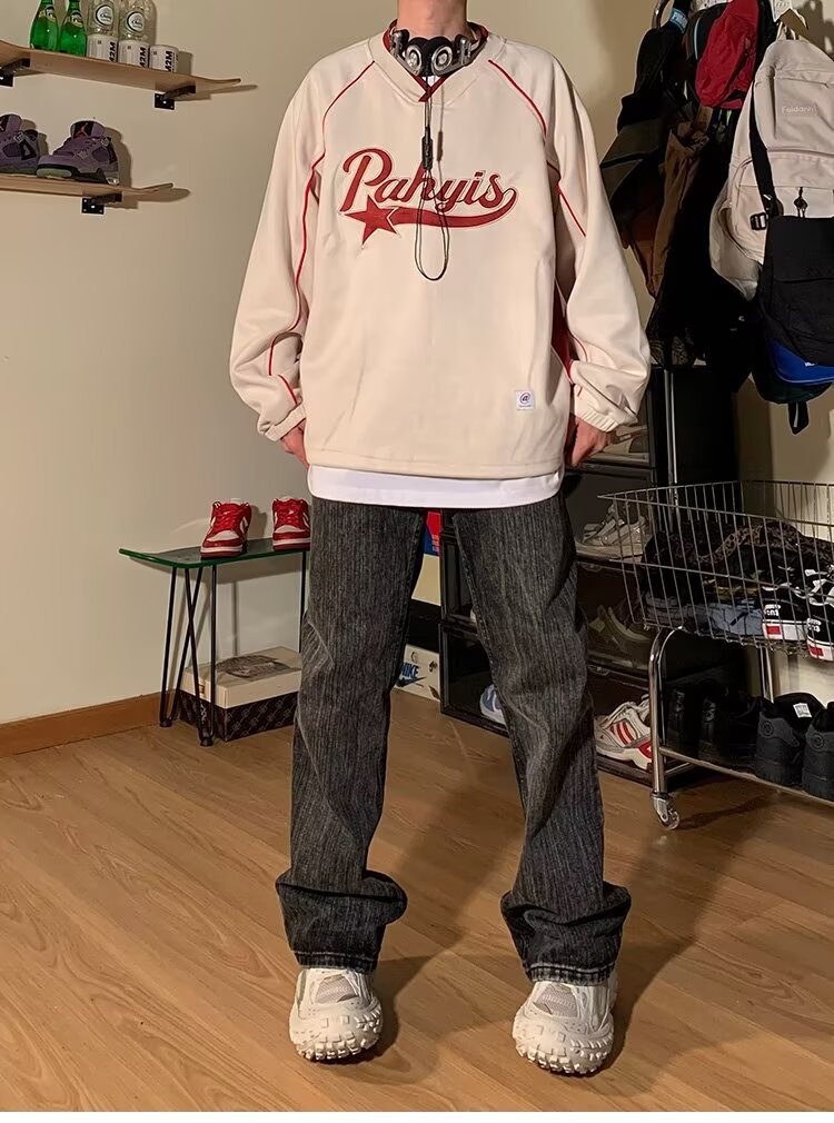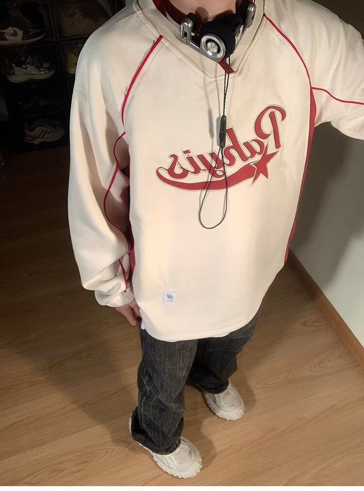 남성 가을 새로운 V 넥 탄성 허리 스웨터 실루엣 느슨한 편지 인쇄 컬러 매칭 캐주얼 탑 남성 패션스토어 가기