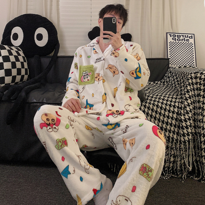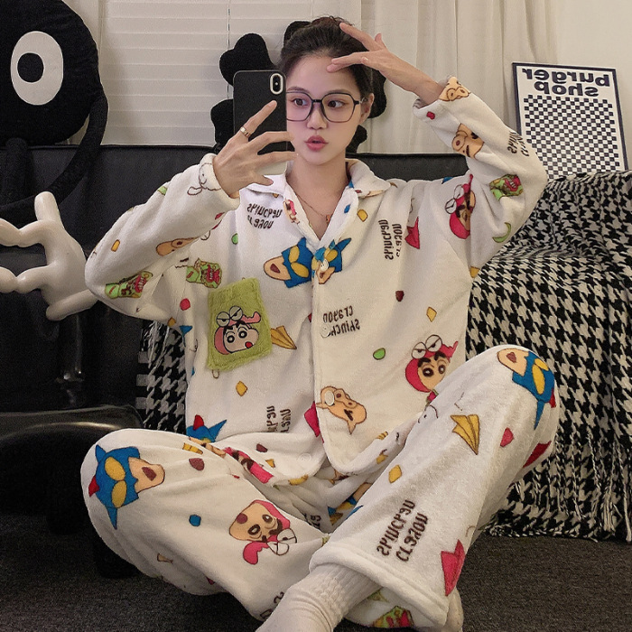 새로운 산호 양털 잠옷 여성의 가을과 겨울 새로운 만화 커플 따뜻한 세트 팔라 양털 기숙사 홈 옷 세트