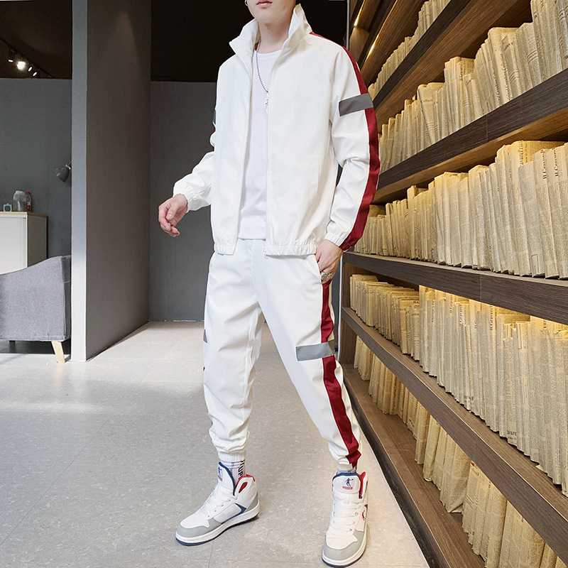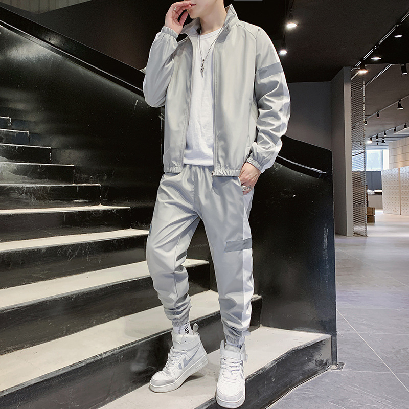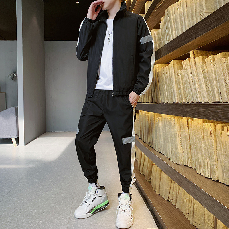 남자 레저 스포츠 카디건 세트 남성 봄과 가을 반사 스트립 2 피스 스포츠 세트 도매 대외 무역