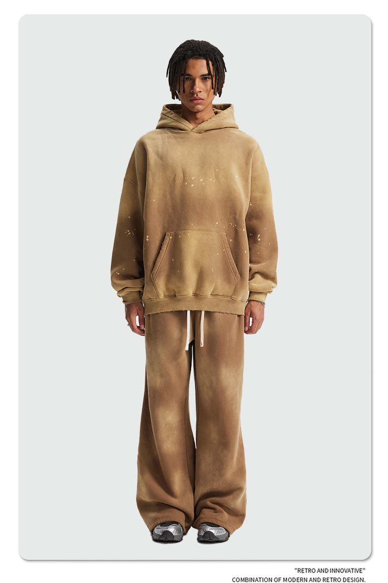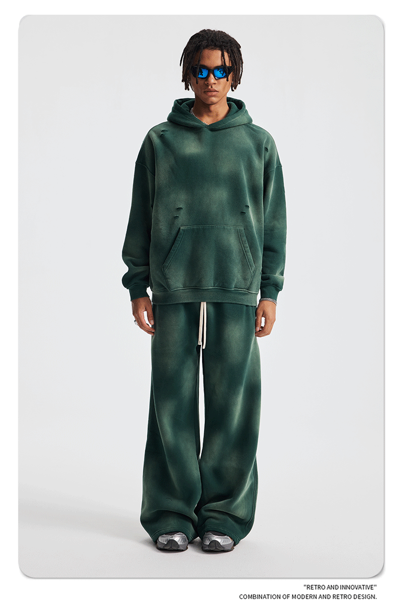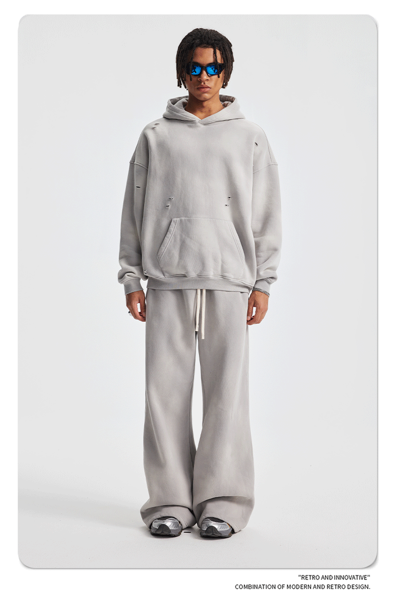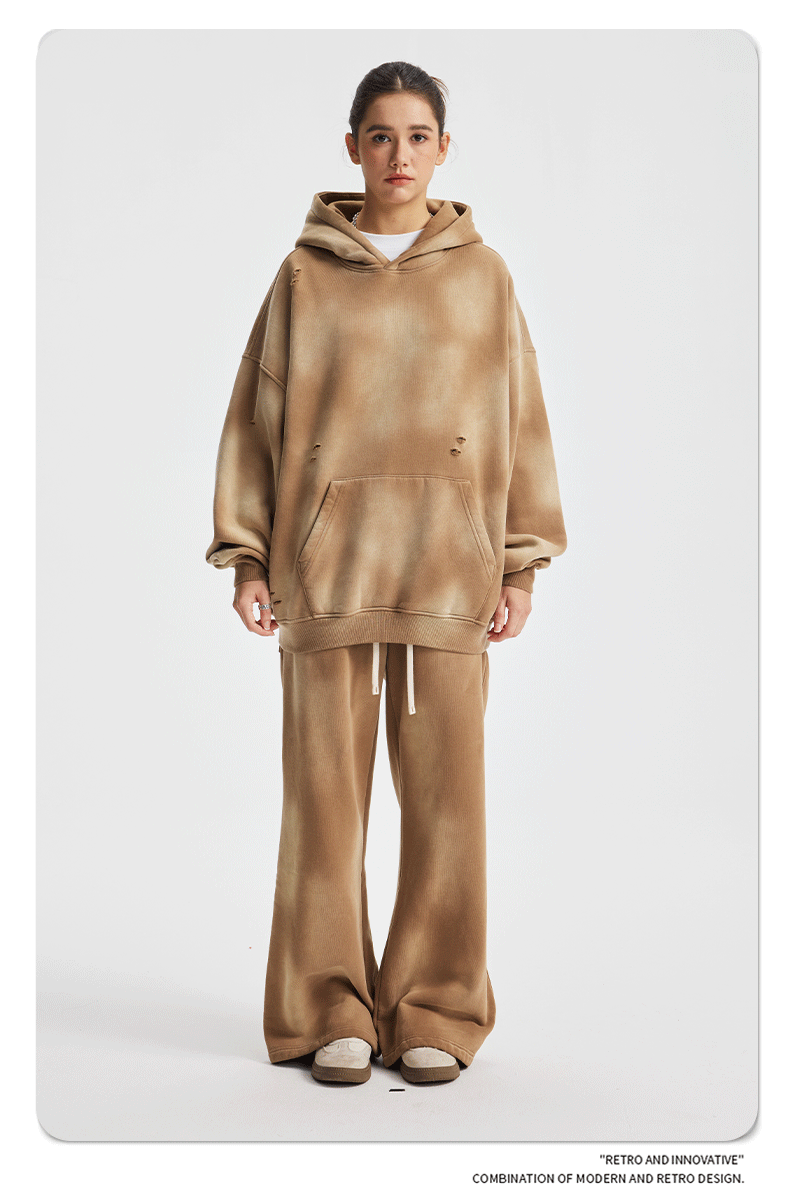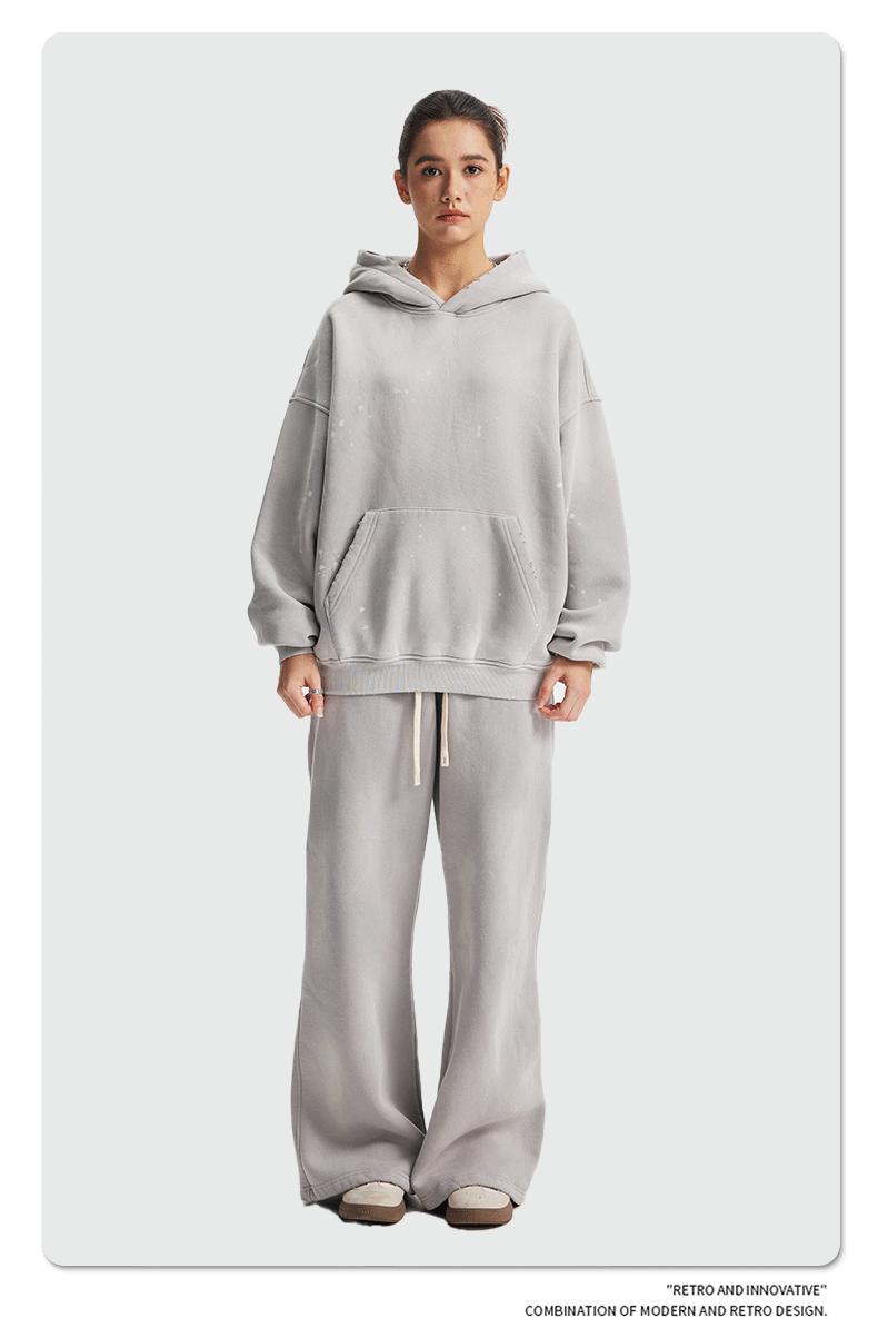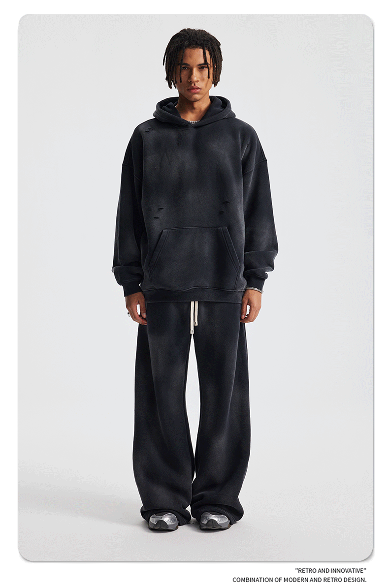 2026 가을 겨울 신상품 스프레이 워싱, 빈티지 스타일, 데미지, 컷팅 디테일, 기모 안감 스웨트셔츠와 스웨트팬츠 세트, 해외 공급원산지스토어 가기