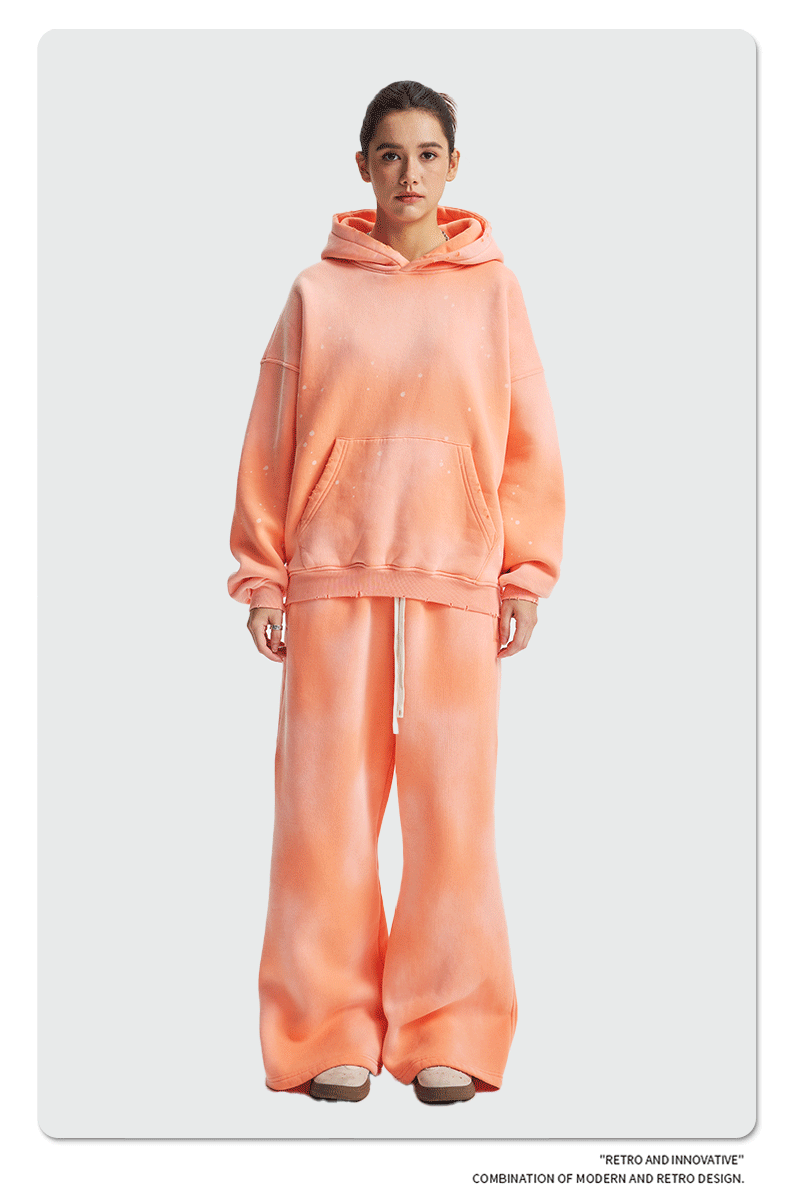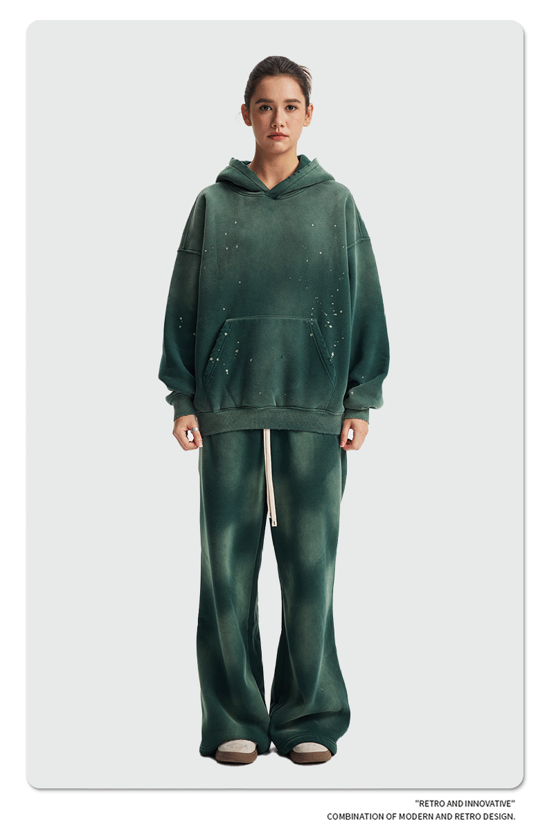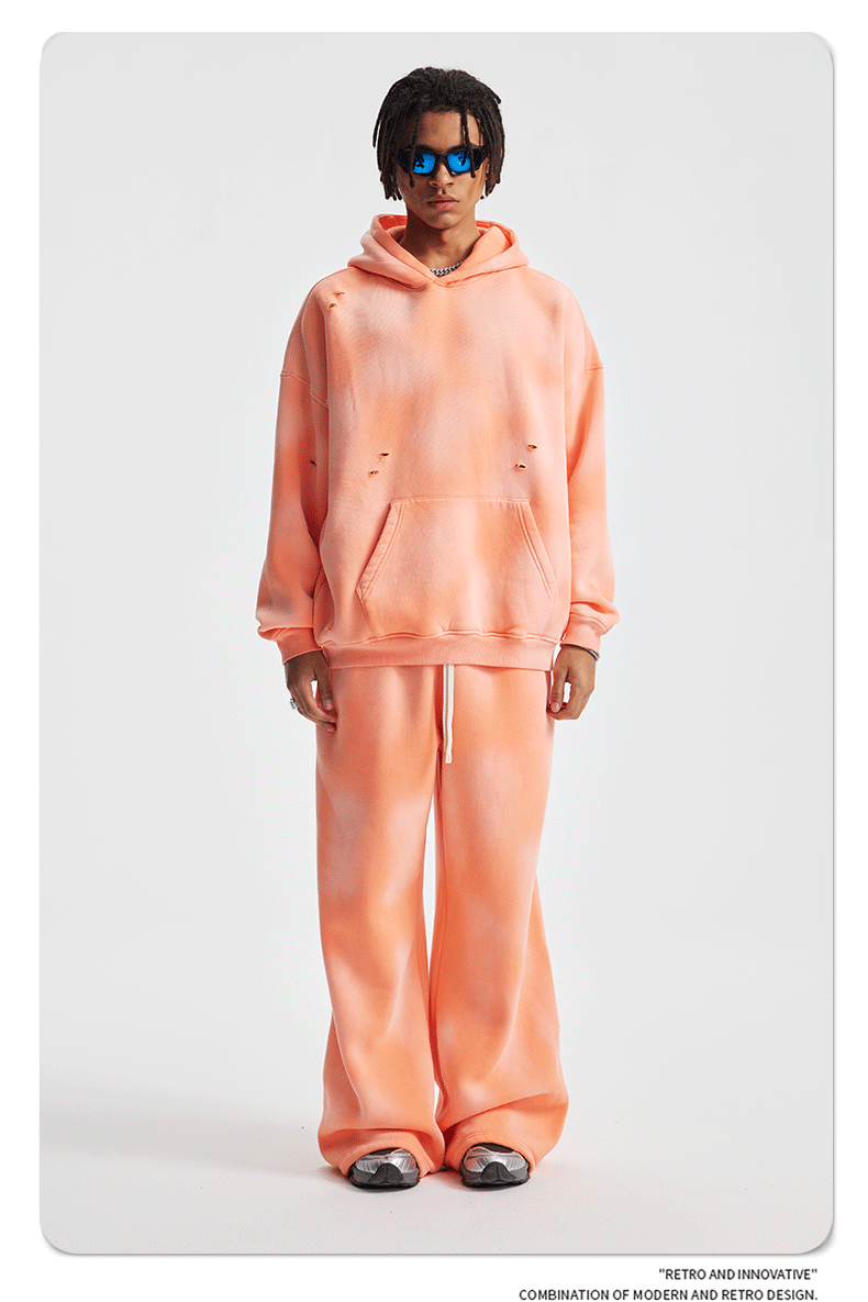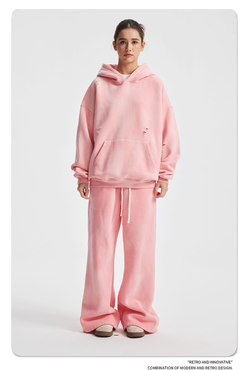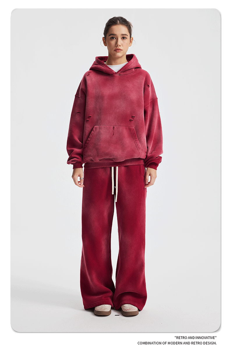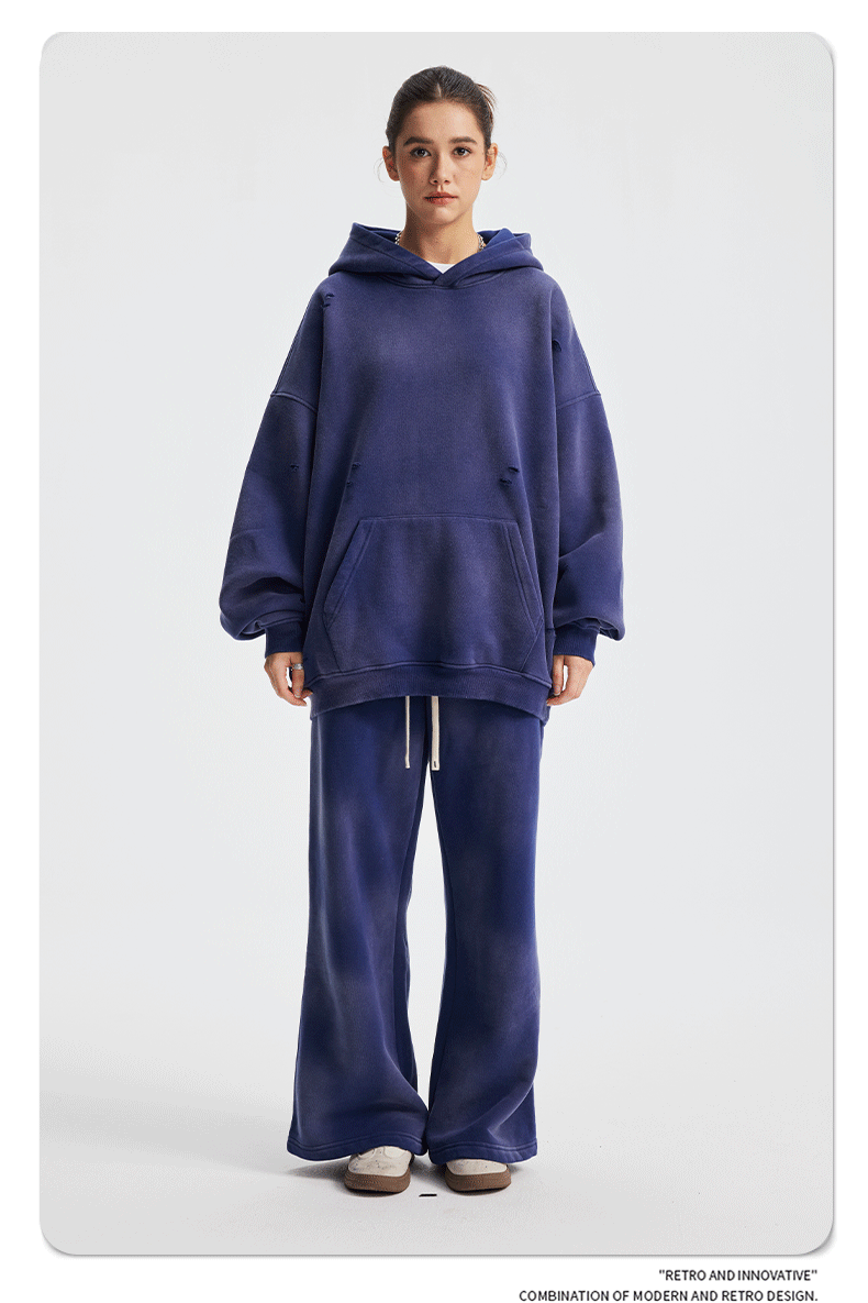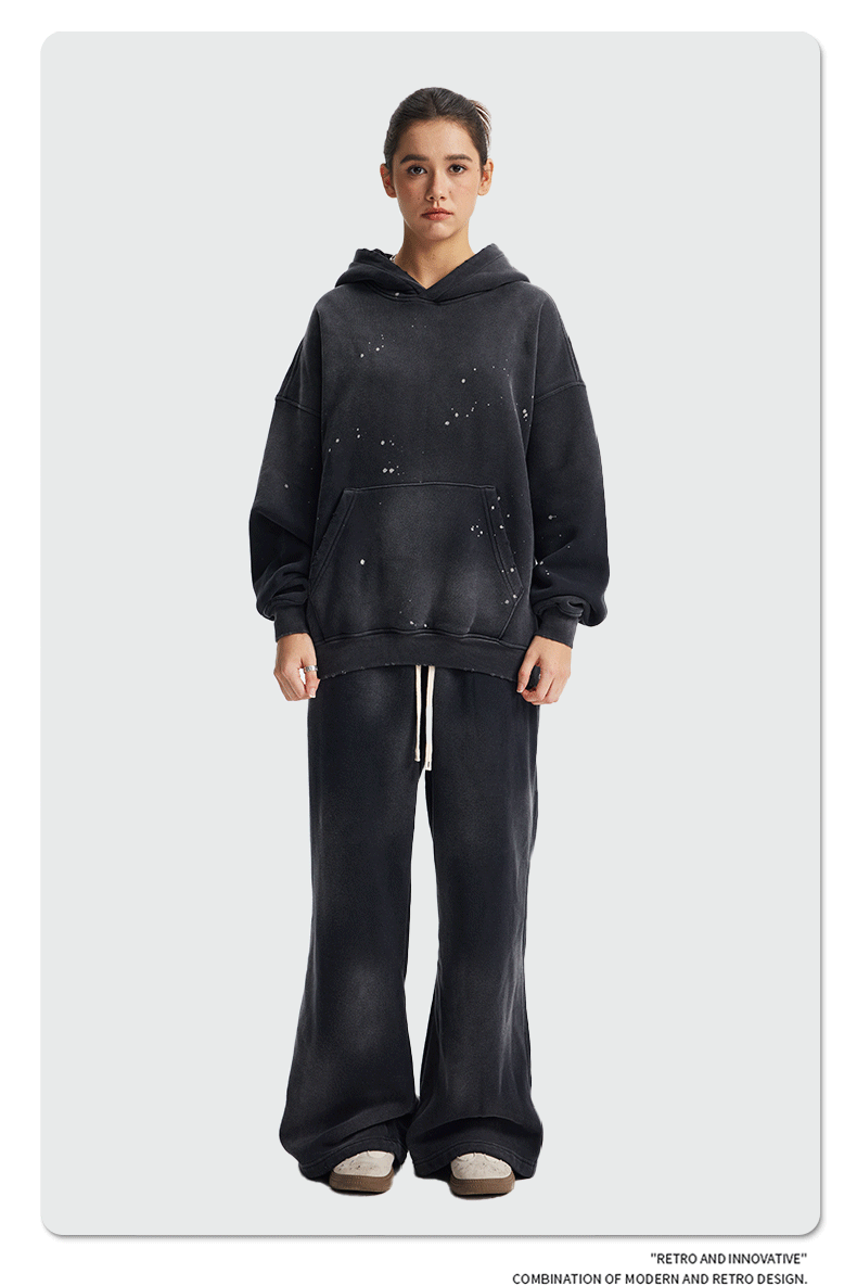 2026 가을 겨울 신상품 스프레이 워싱, 빈티지 스타일, 데미지, 컷팅 디테일, 기모 안감 스웨트셔츠와 스웨트팬츠 세트, 해외 공급원산지스토어 가기