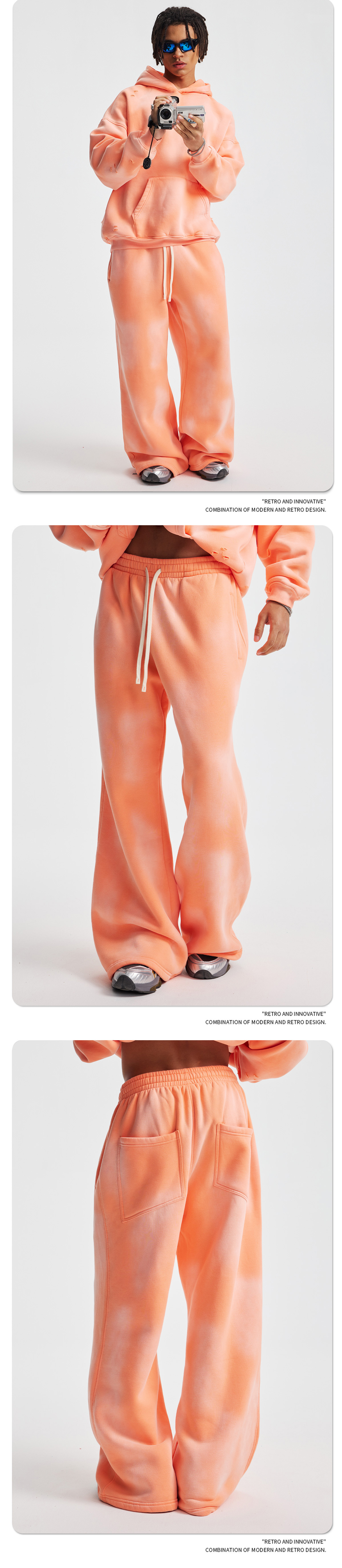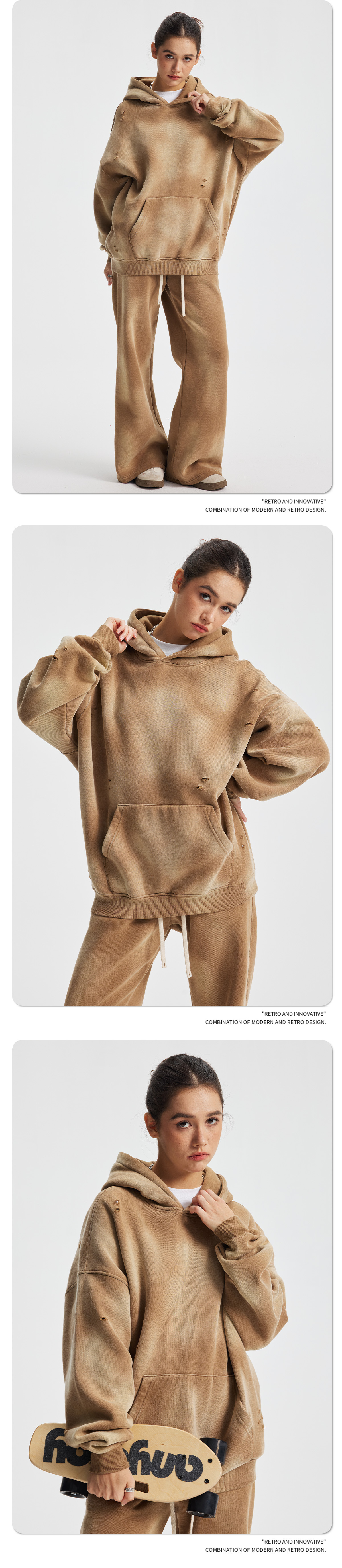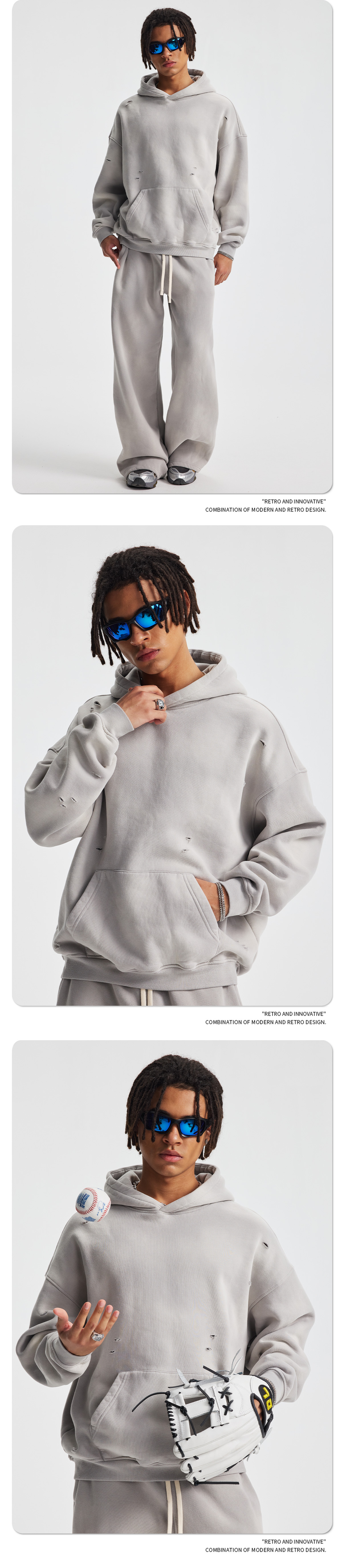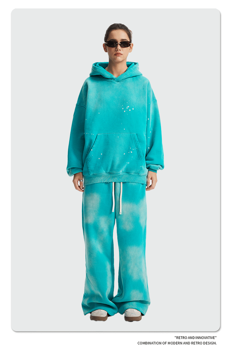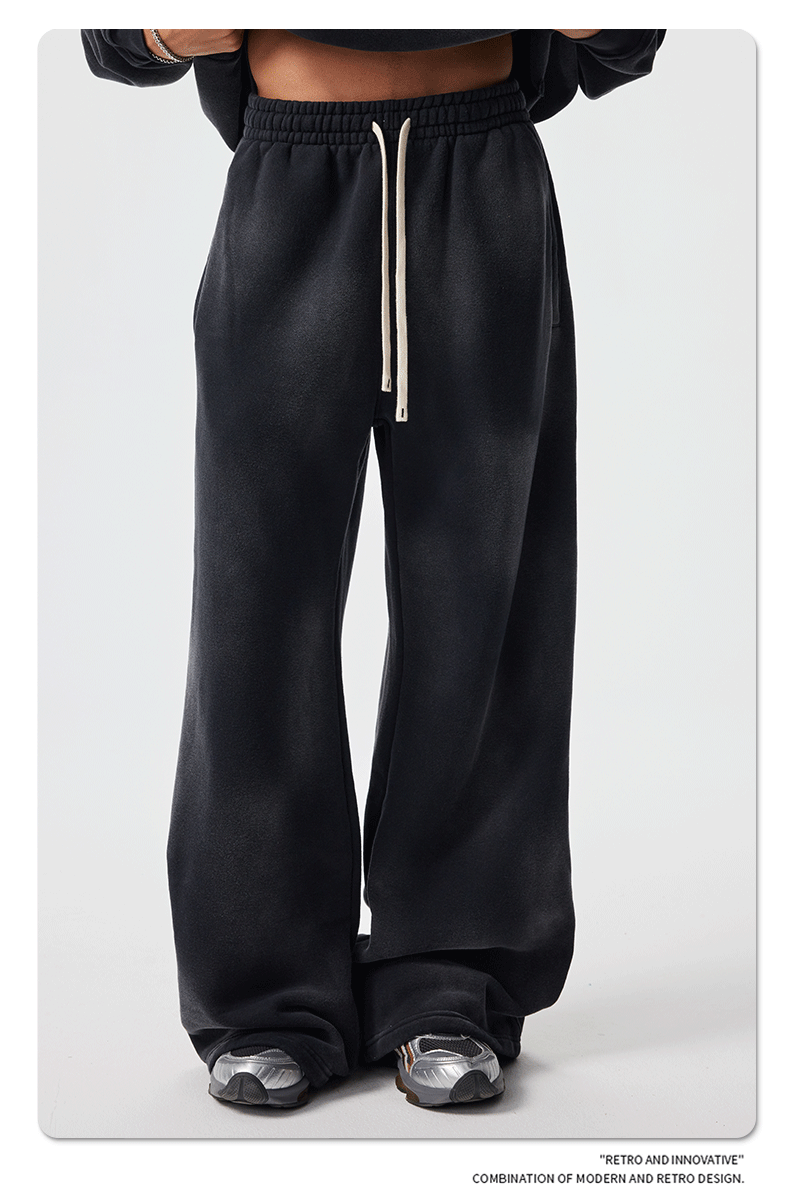 2026 가을 겨울 신상품 스프레이 워싱, 빈티지 스타일, 데미지, 컷팅 디테일, 기모 안감 스웨트셔츠와 스웨트팬츠 세트, 해외 공급원산지스토어 가기