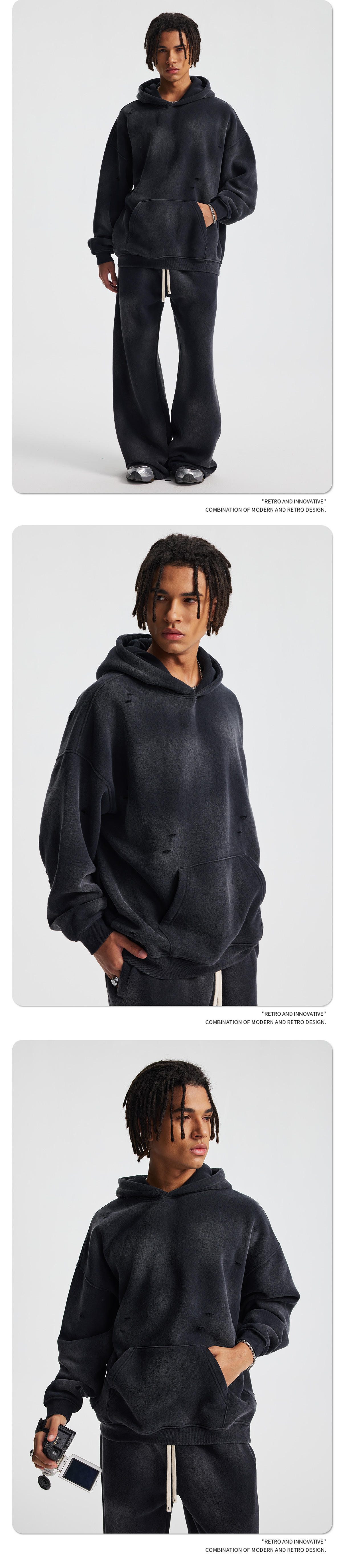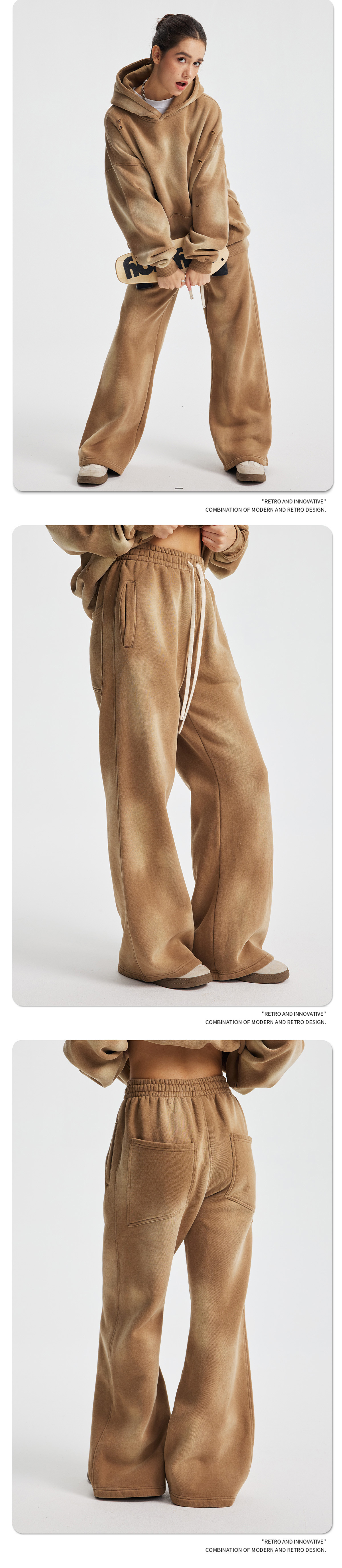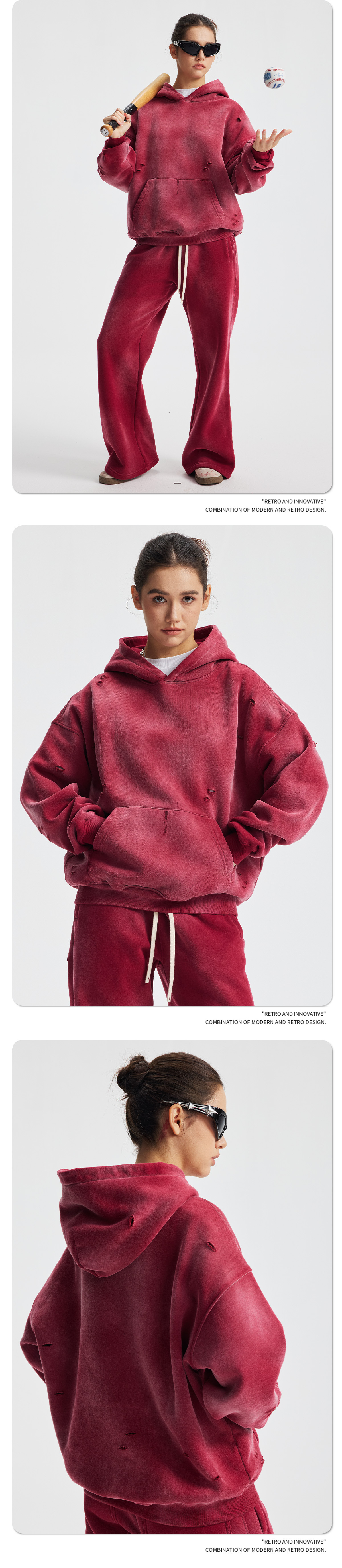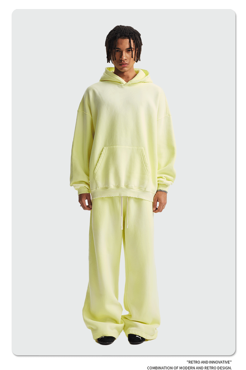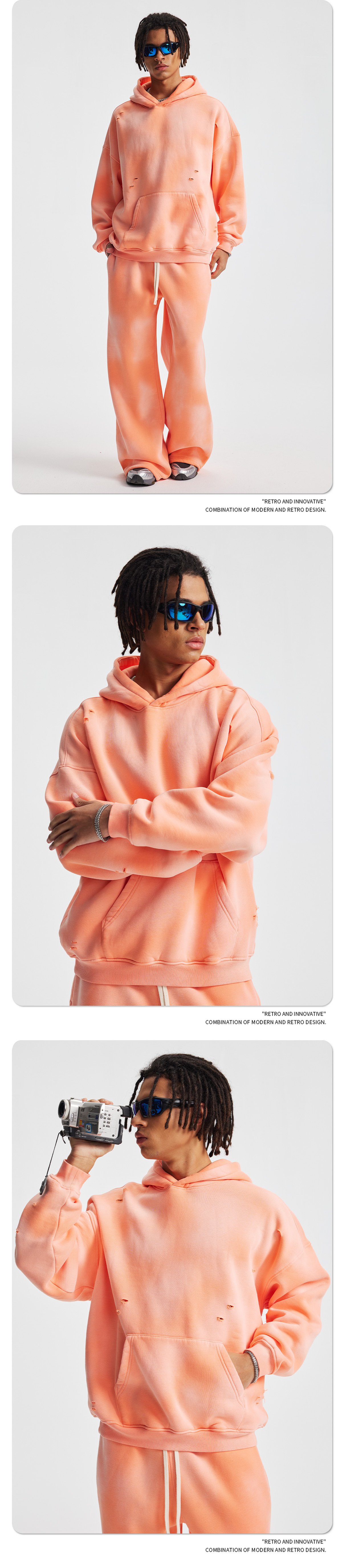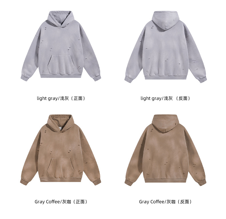 2026 가을 겨울 신상품 스프레이 워싱, 빈티지 스타일, 데미지, 컷팅 디테일, 기모 안감 스웨트셔츠와 스웨트팬츠 세트, 해외 공급원산지스토어 가기