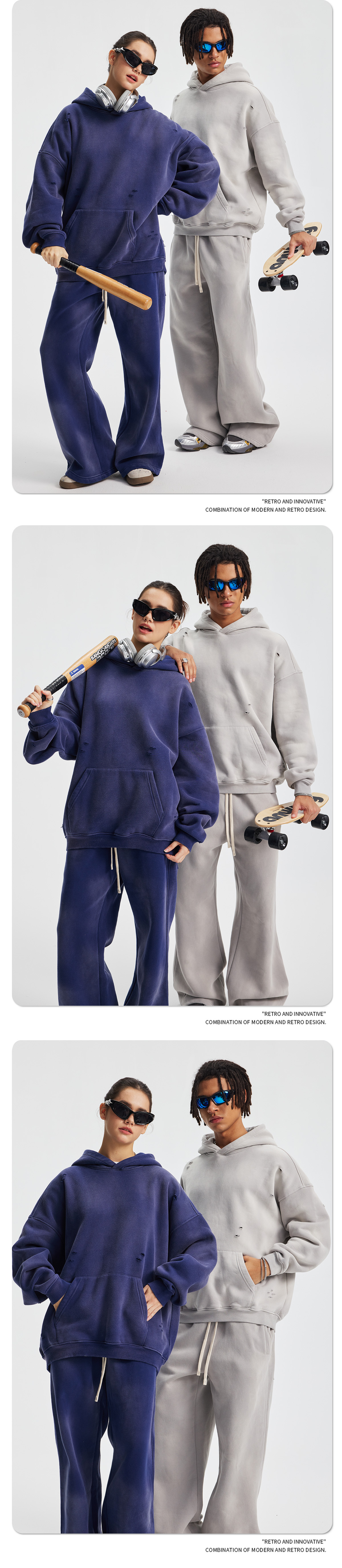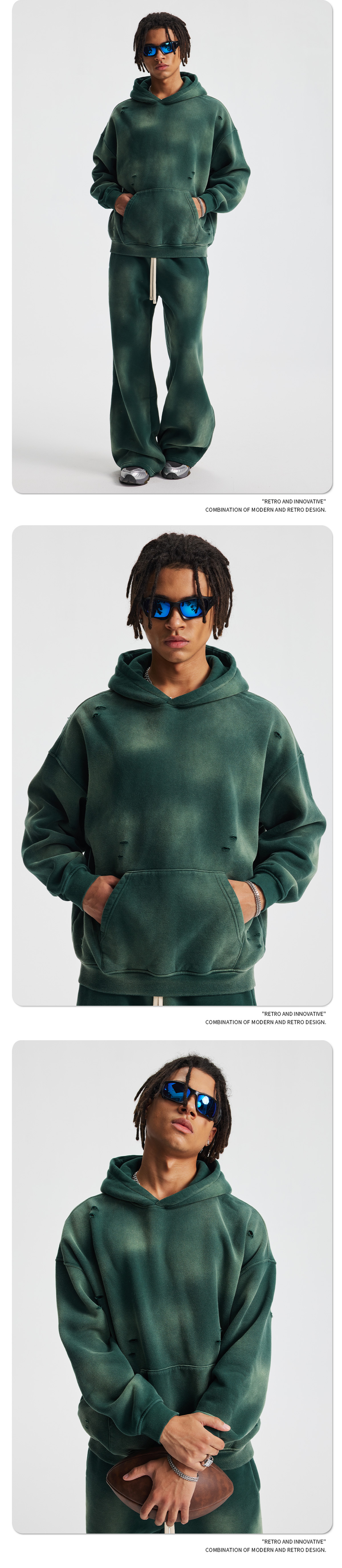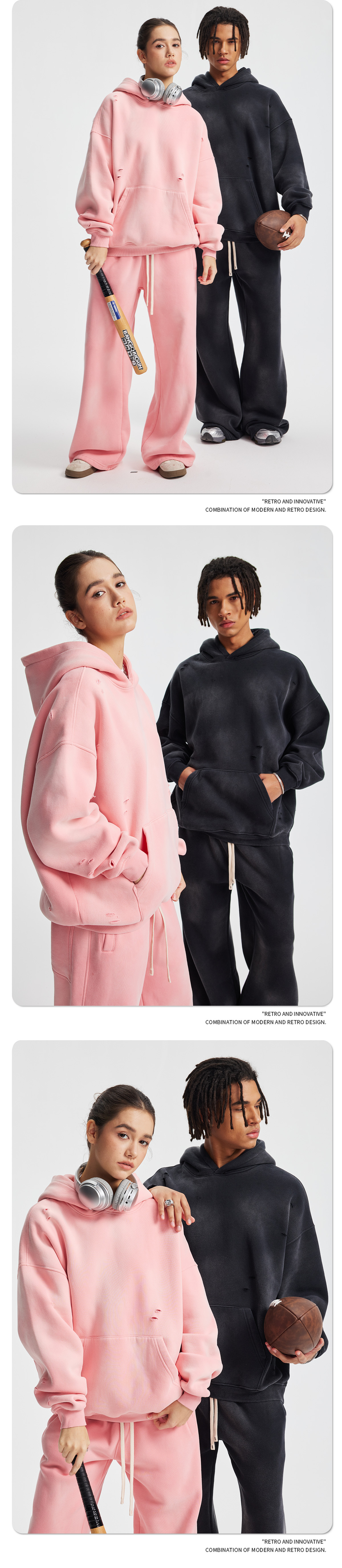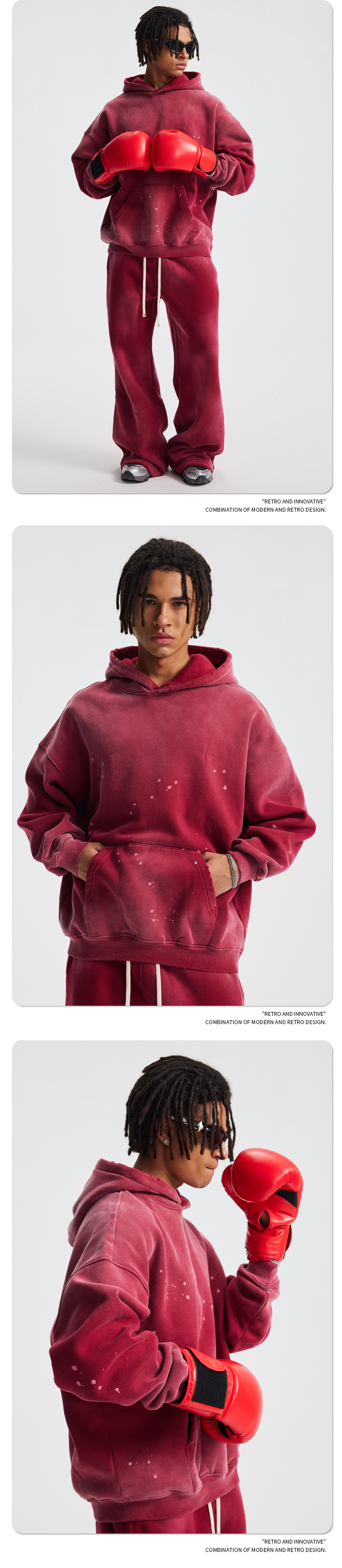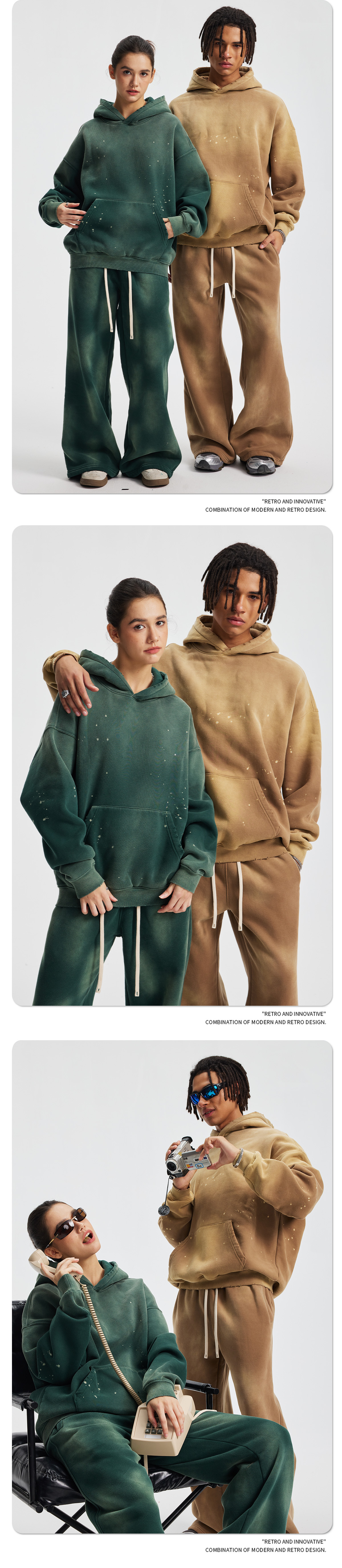 2026 가을 겨울 신상품 스프레이 워싱, 빈티지 스타일, 데미지, 컷팅 디테일, 기모 안감 스웨트셔츠와 스웨트팬츠 세트, 해외 공급원산지스토어 가기