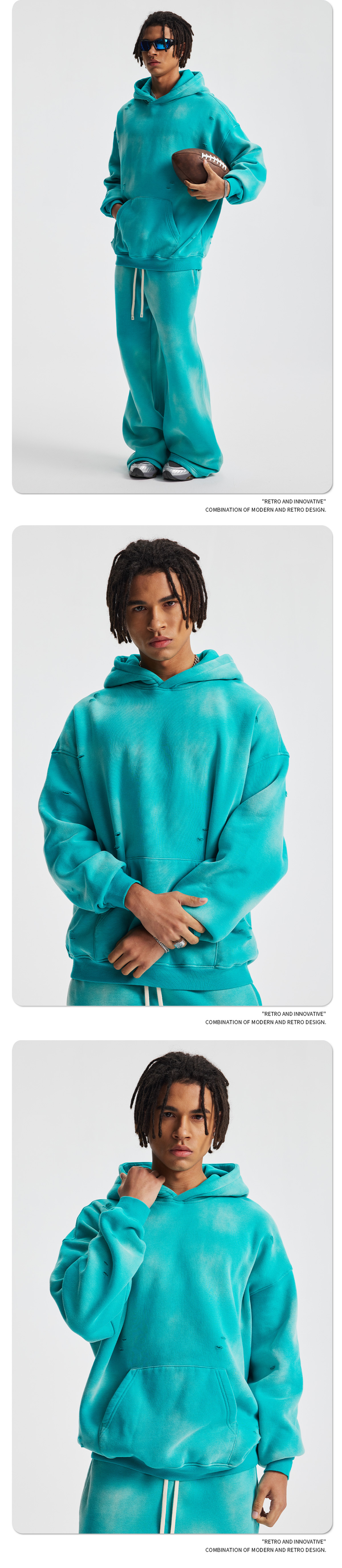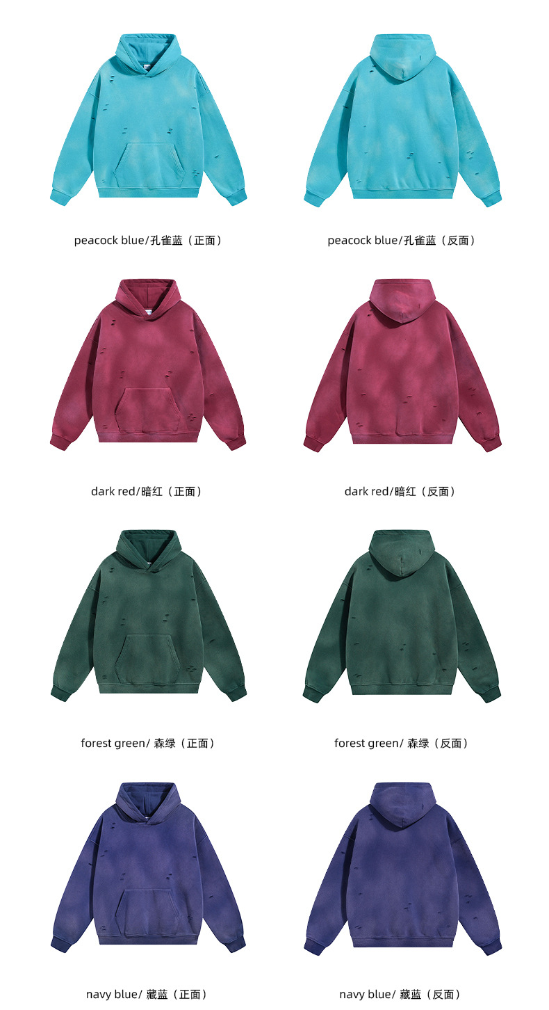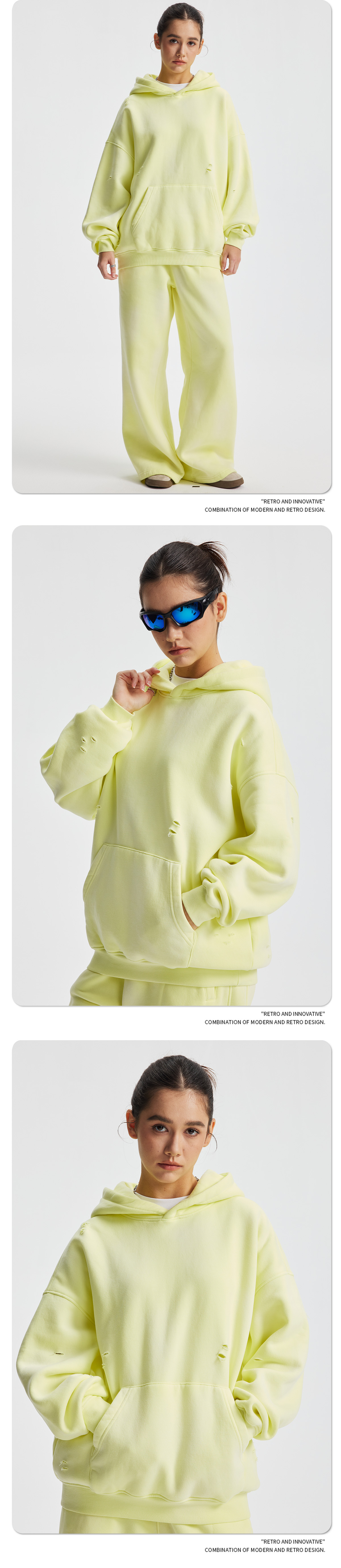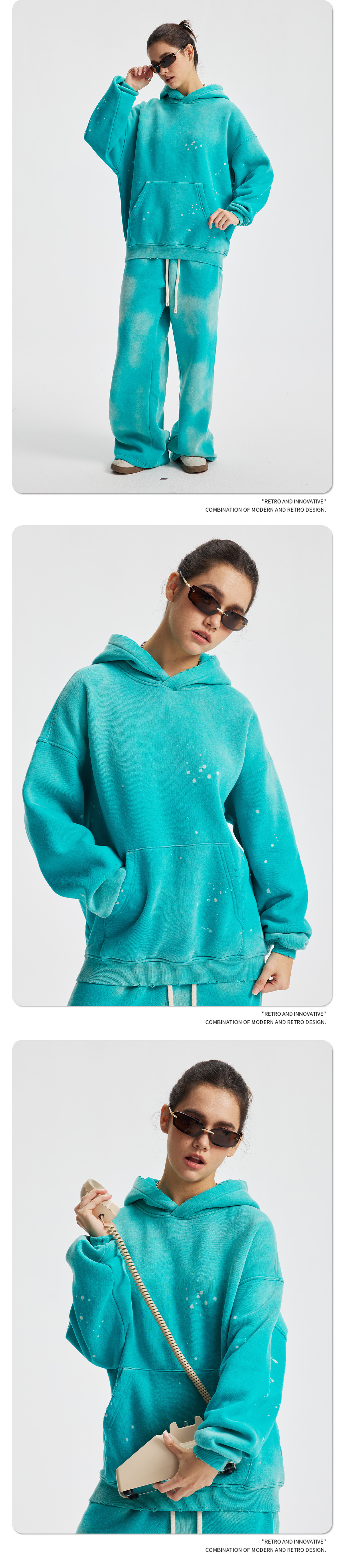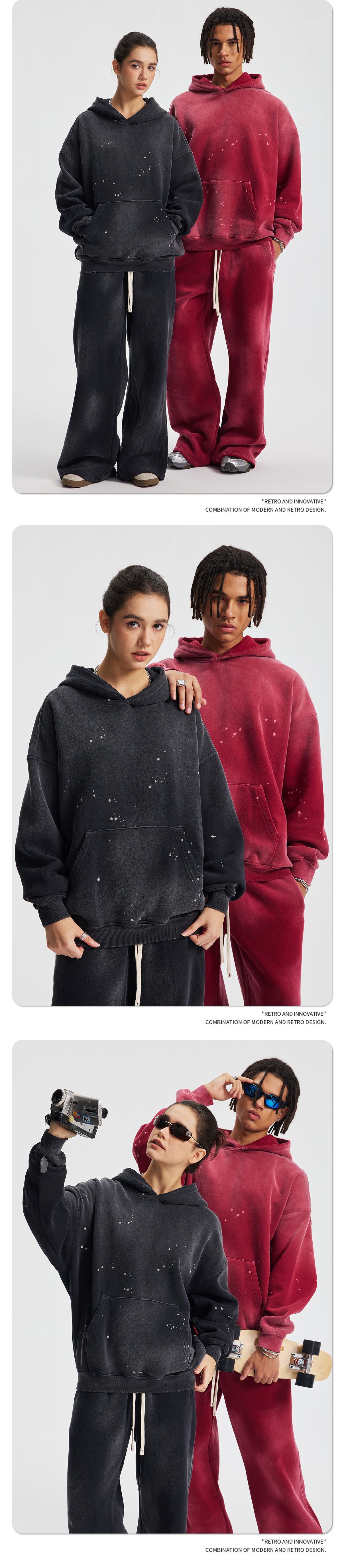 2026 가을 겨울 신상품 스프레이 워싱, 빈티지 스타일, 데미지, 컷팅 디테일, 기모 안감 스웨트셔츠와 스웨트팬츠 세트, 해외 공급원산지스토어 가기