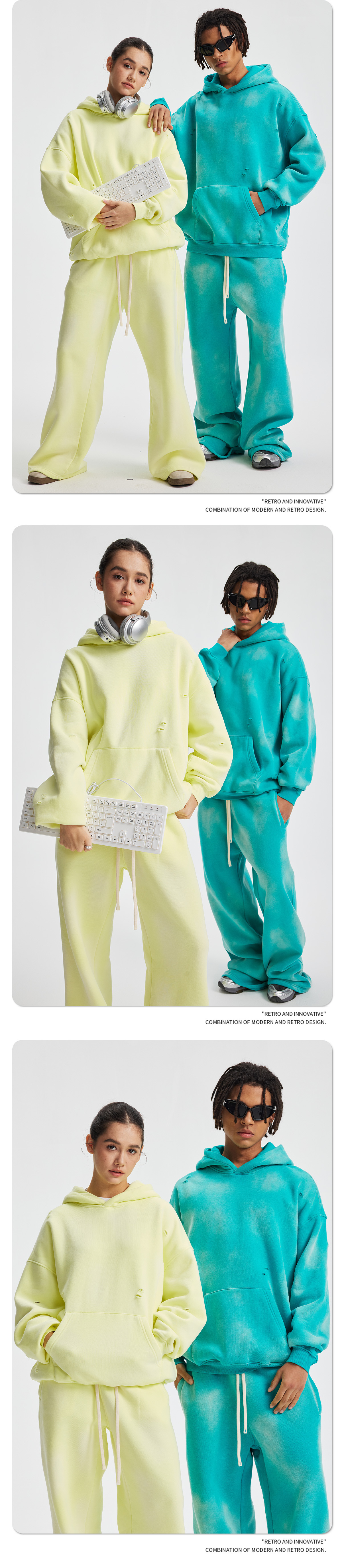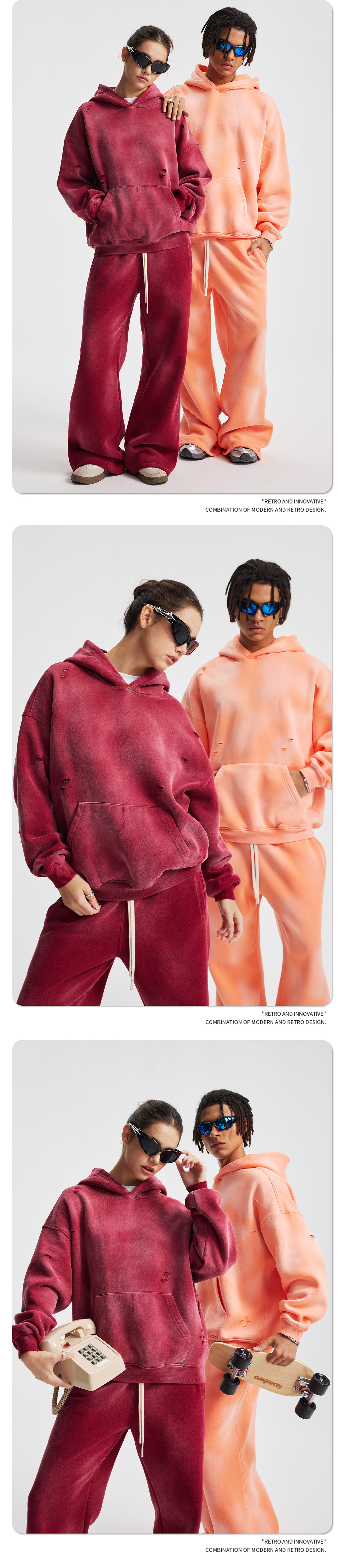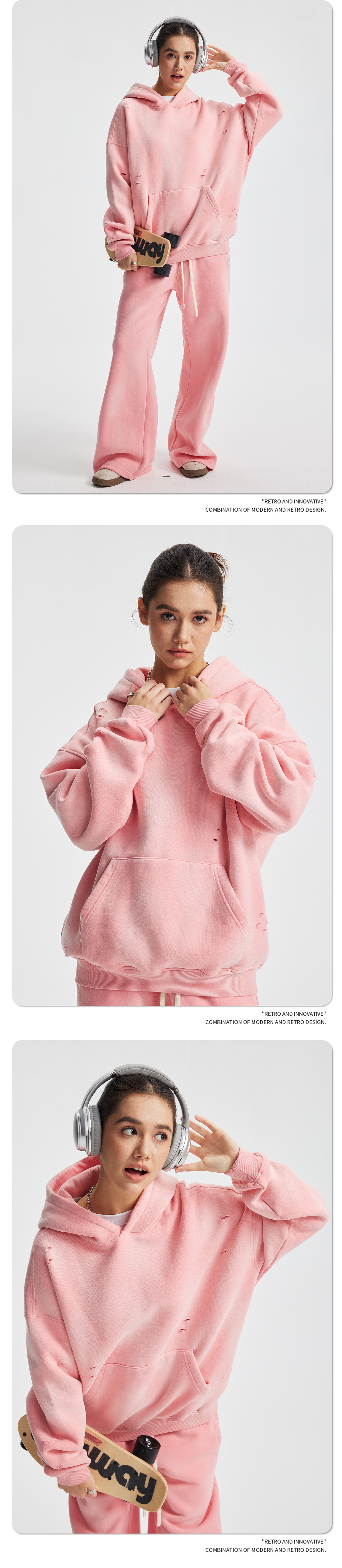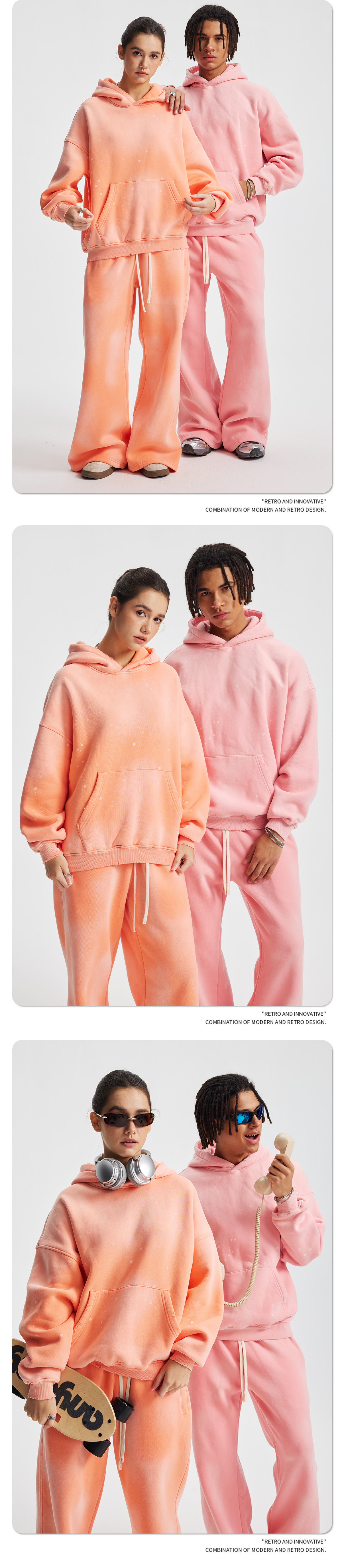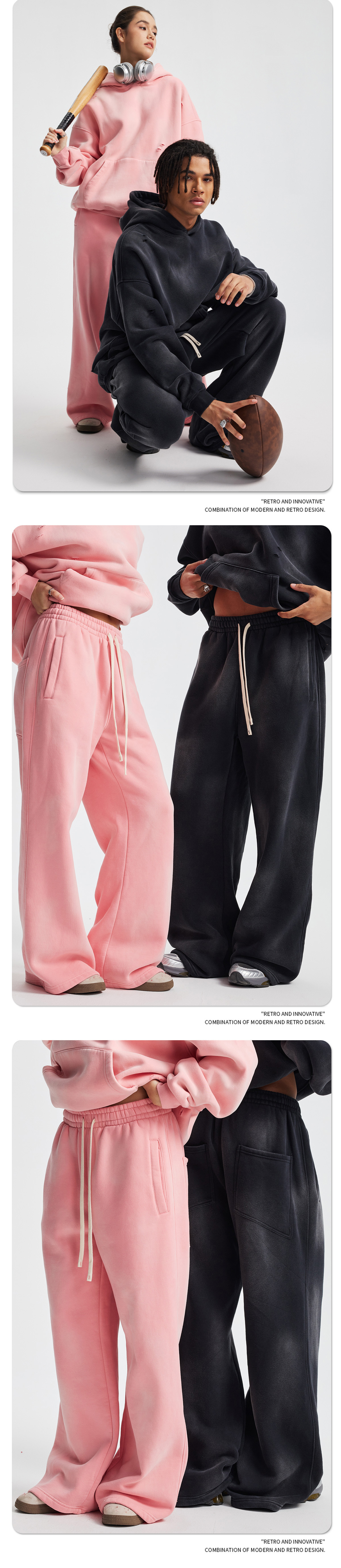 2026 가을 겨울 신상품 스프레이 워싱, 빈티지 스타일, 데미지, 컷팅 디테일, 기모 안감 스웨트셔츠와 스웨트팬츠 세트, 해외 공급원산지스토어 가기