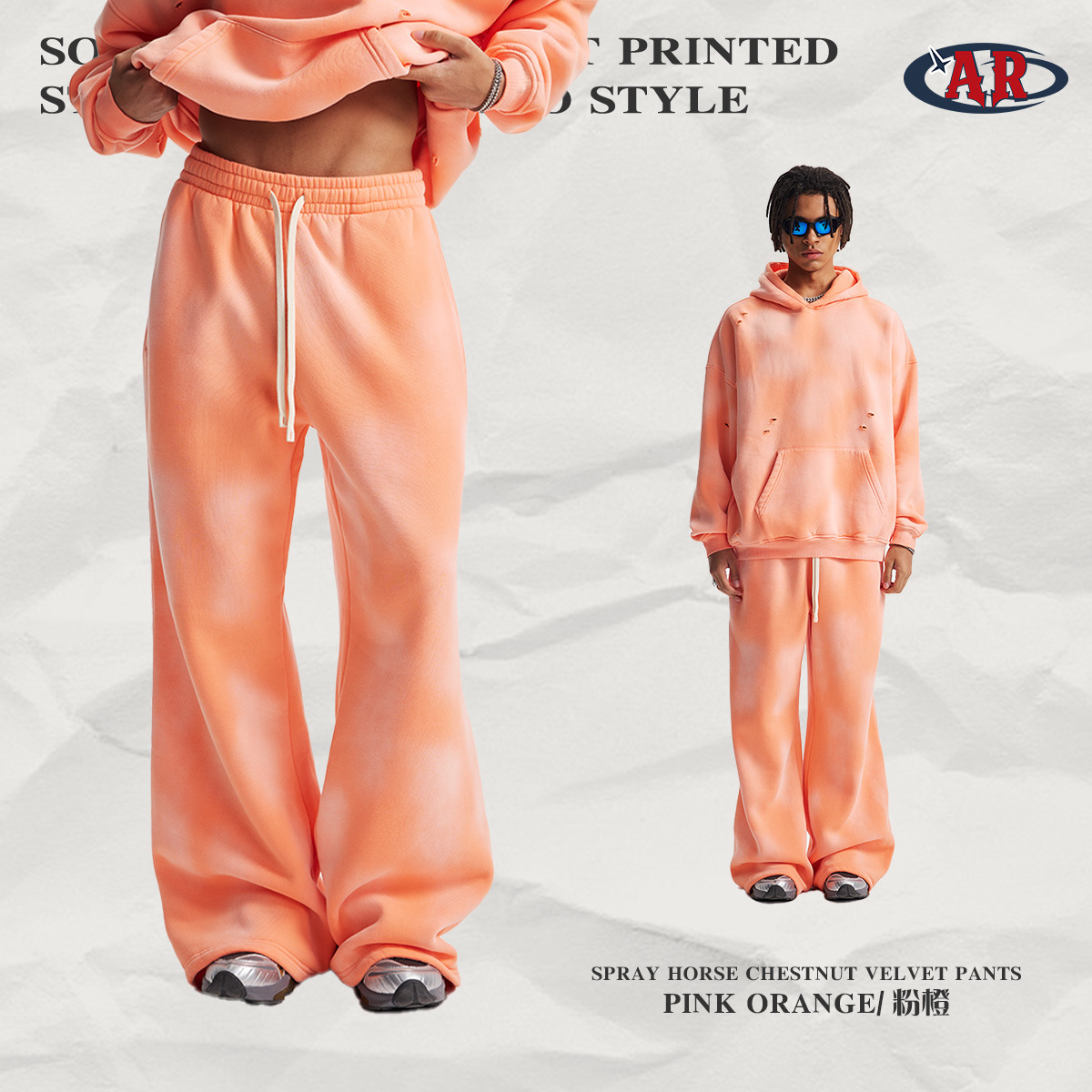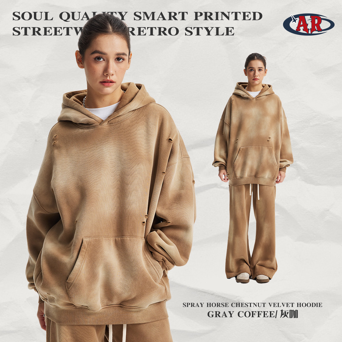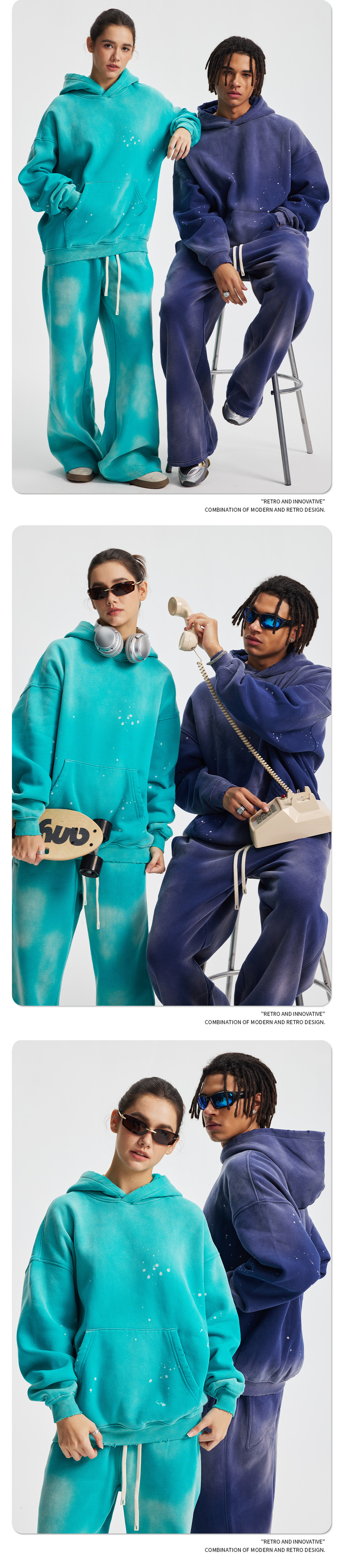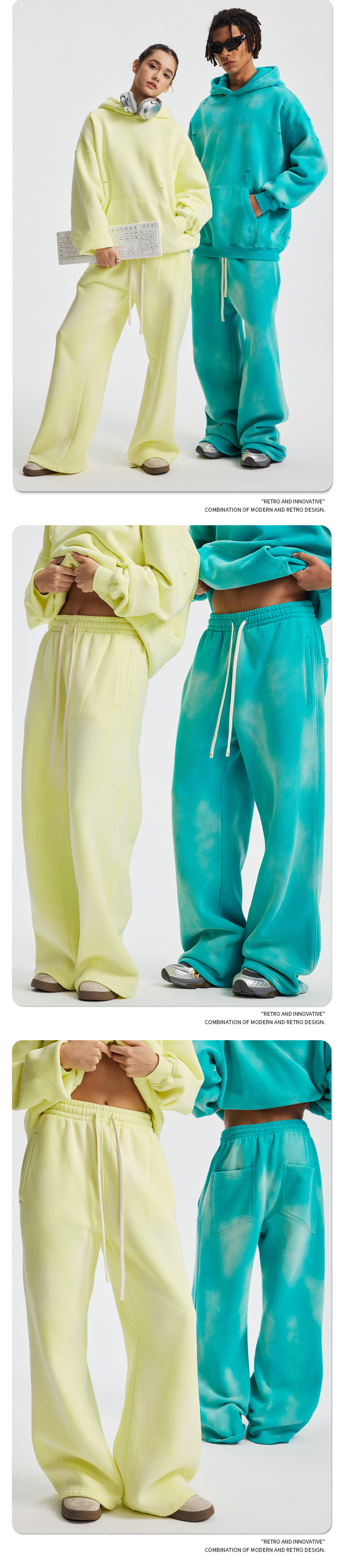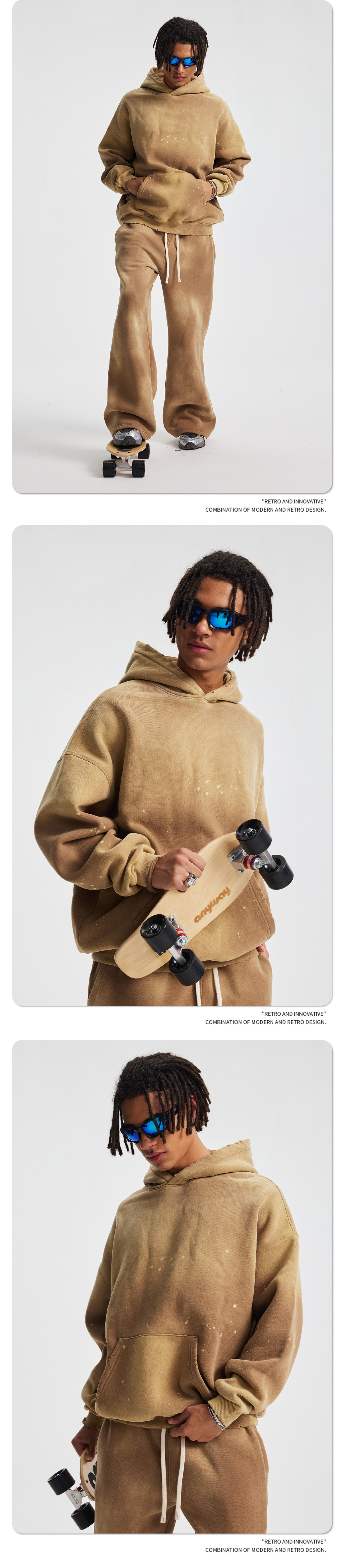 2026 가을 겨울 신상품 스프레이 워싱, 빈티지 스타일, 데미지, 컷팅 디테일, 기모 안감 스웨트셔츠와 스웨트팬츠 세트, 해외 공급원산지스토어 가기