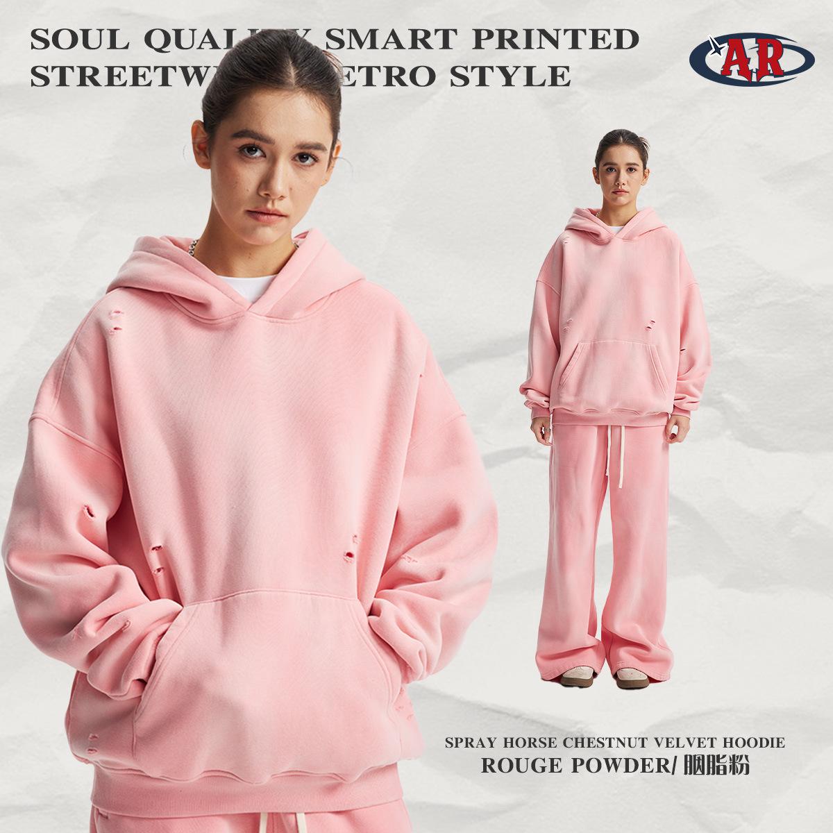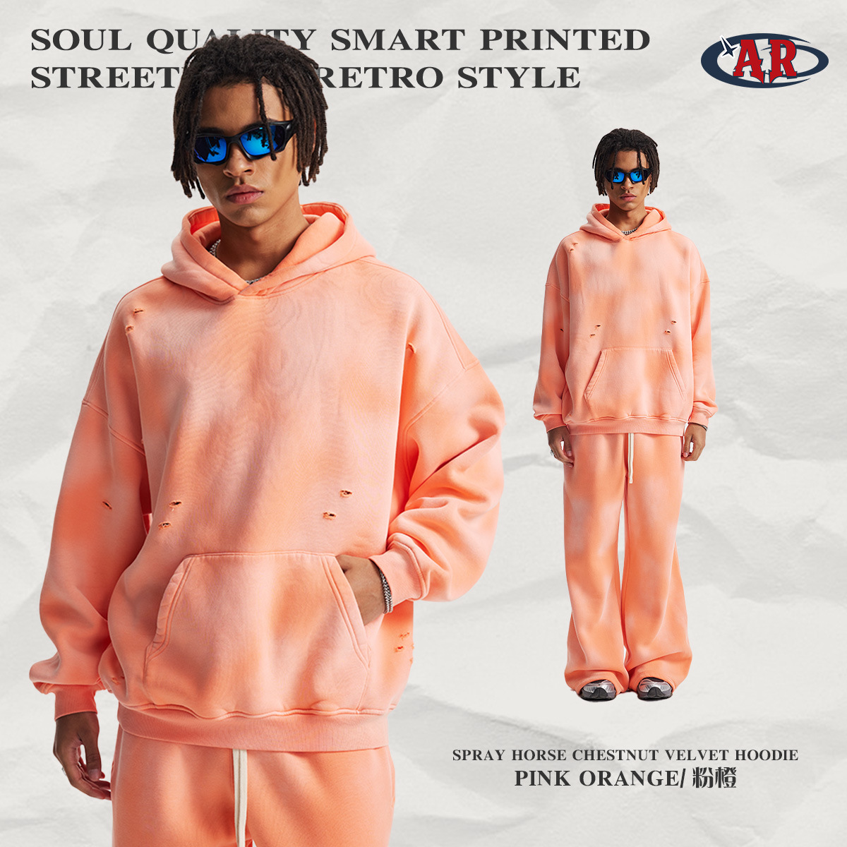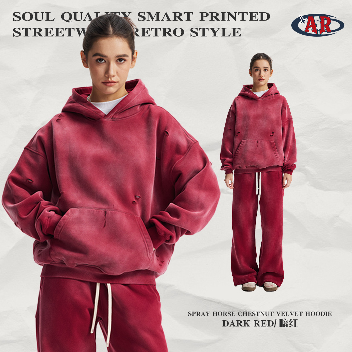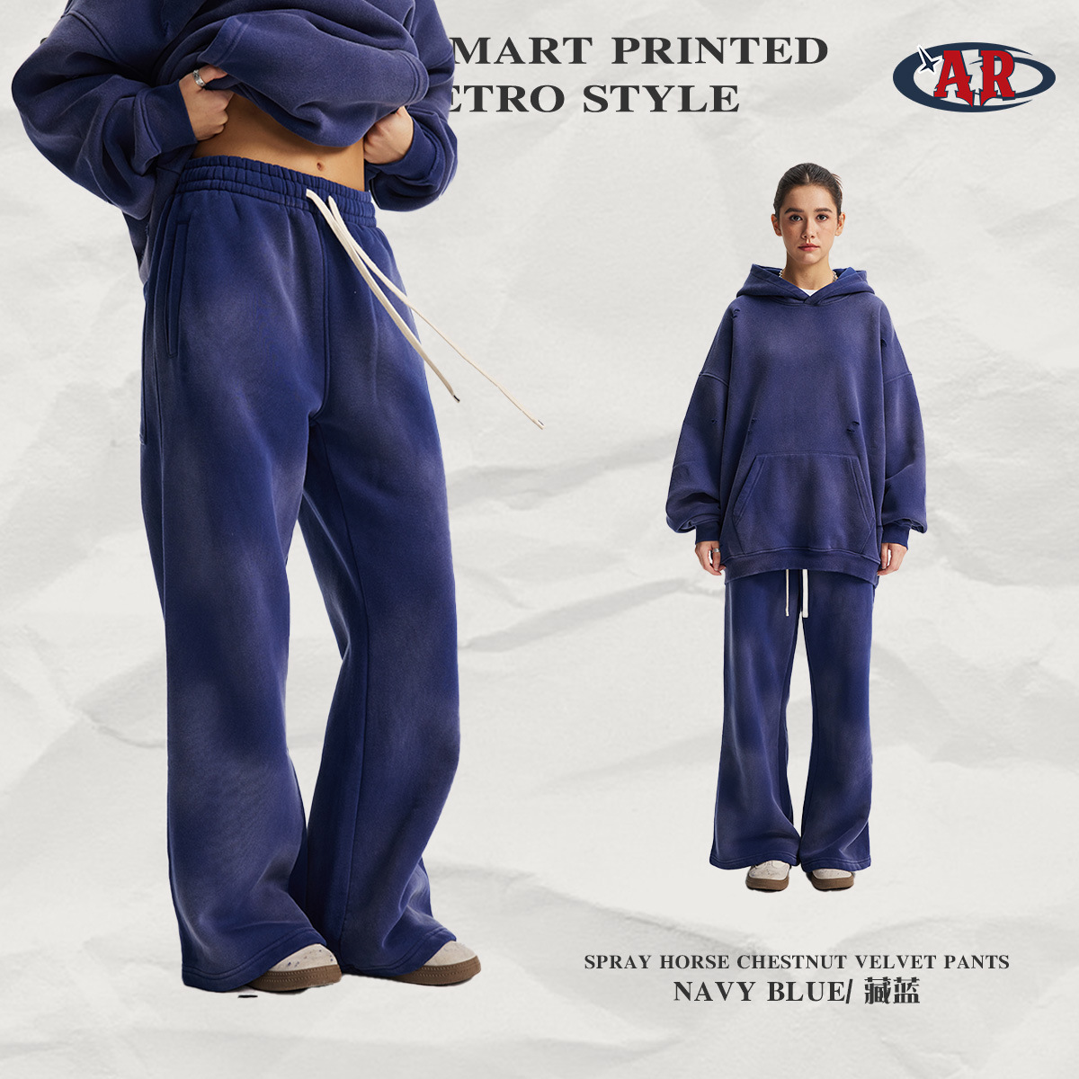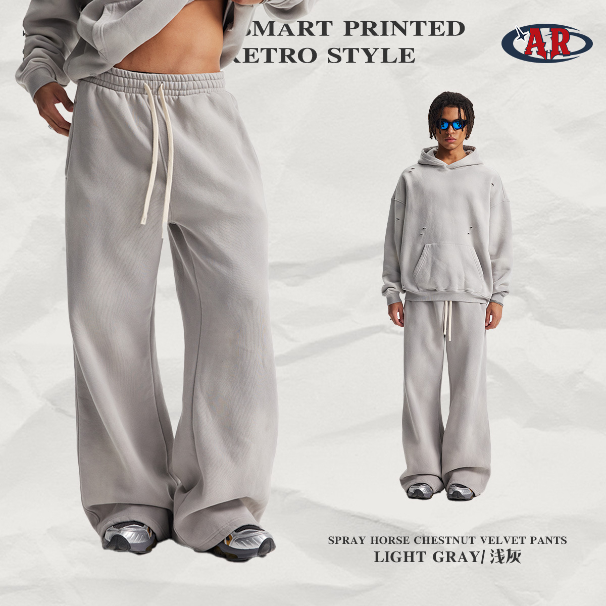 2026 가을 겨울 신상품 스프레이 워싱, 빈티지 스타일, 데미지, 컷팅 디테일, 기모 안감 스웨트셔츠와 스웨트팬츠 세트, 해외 공급원산지스토어 가기