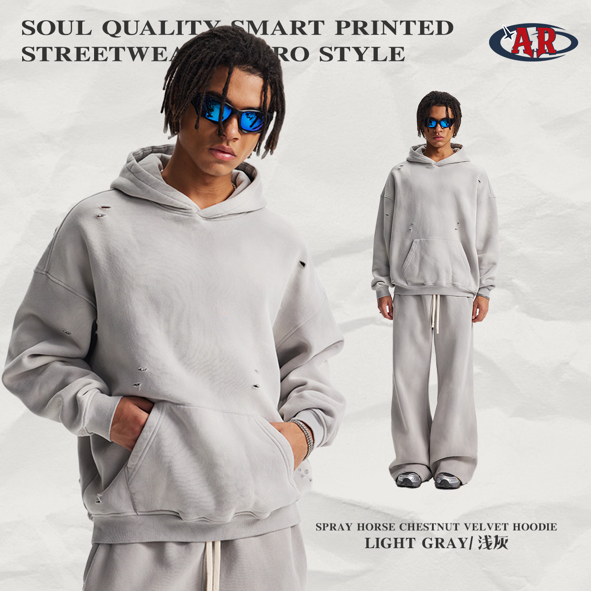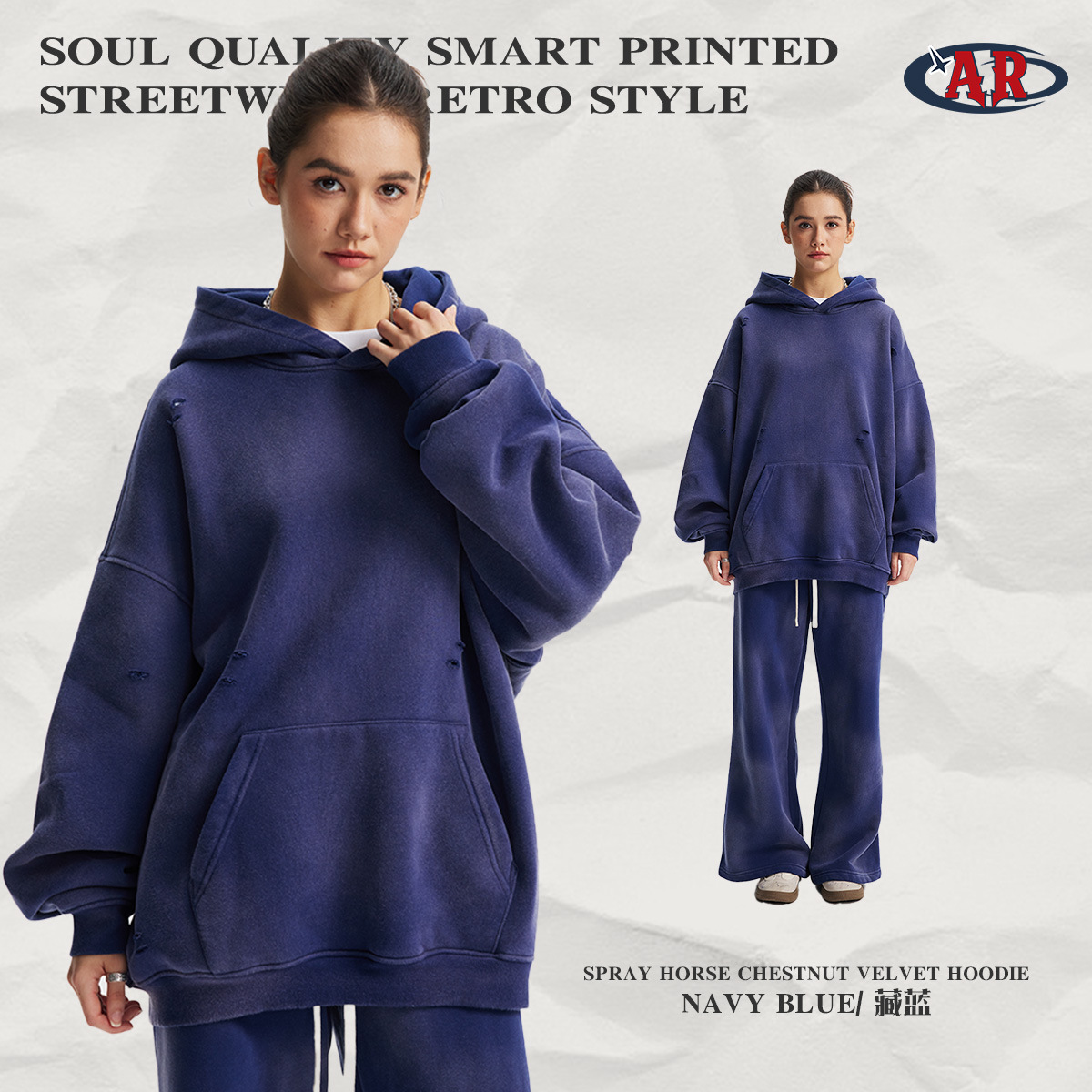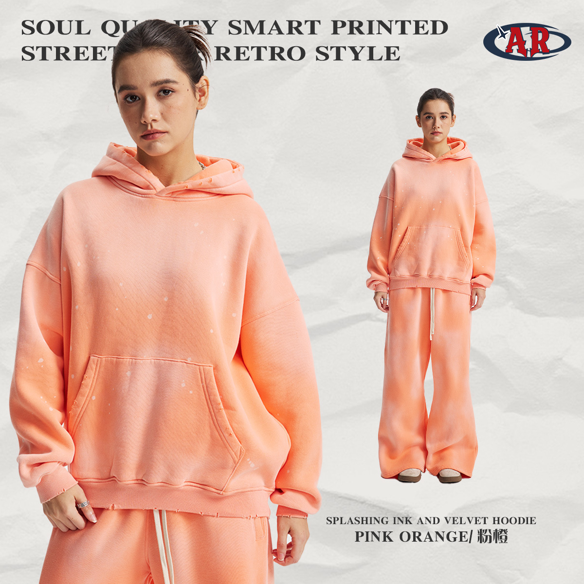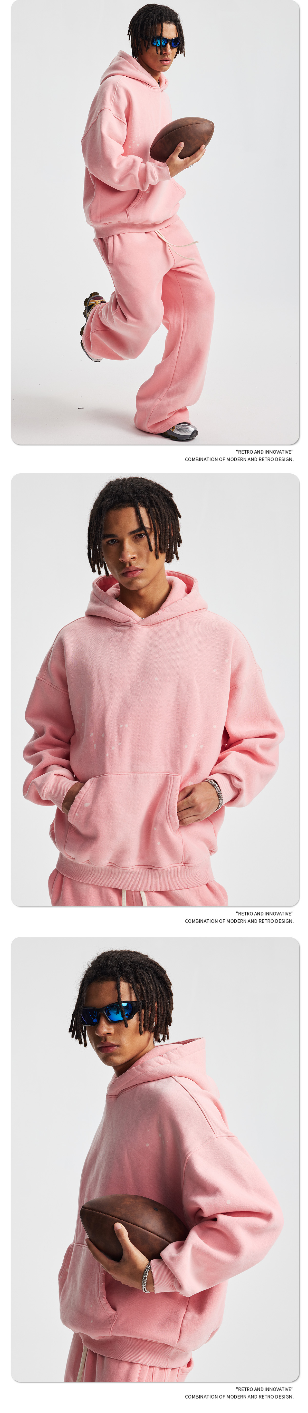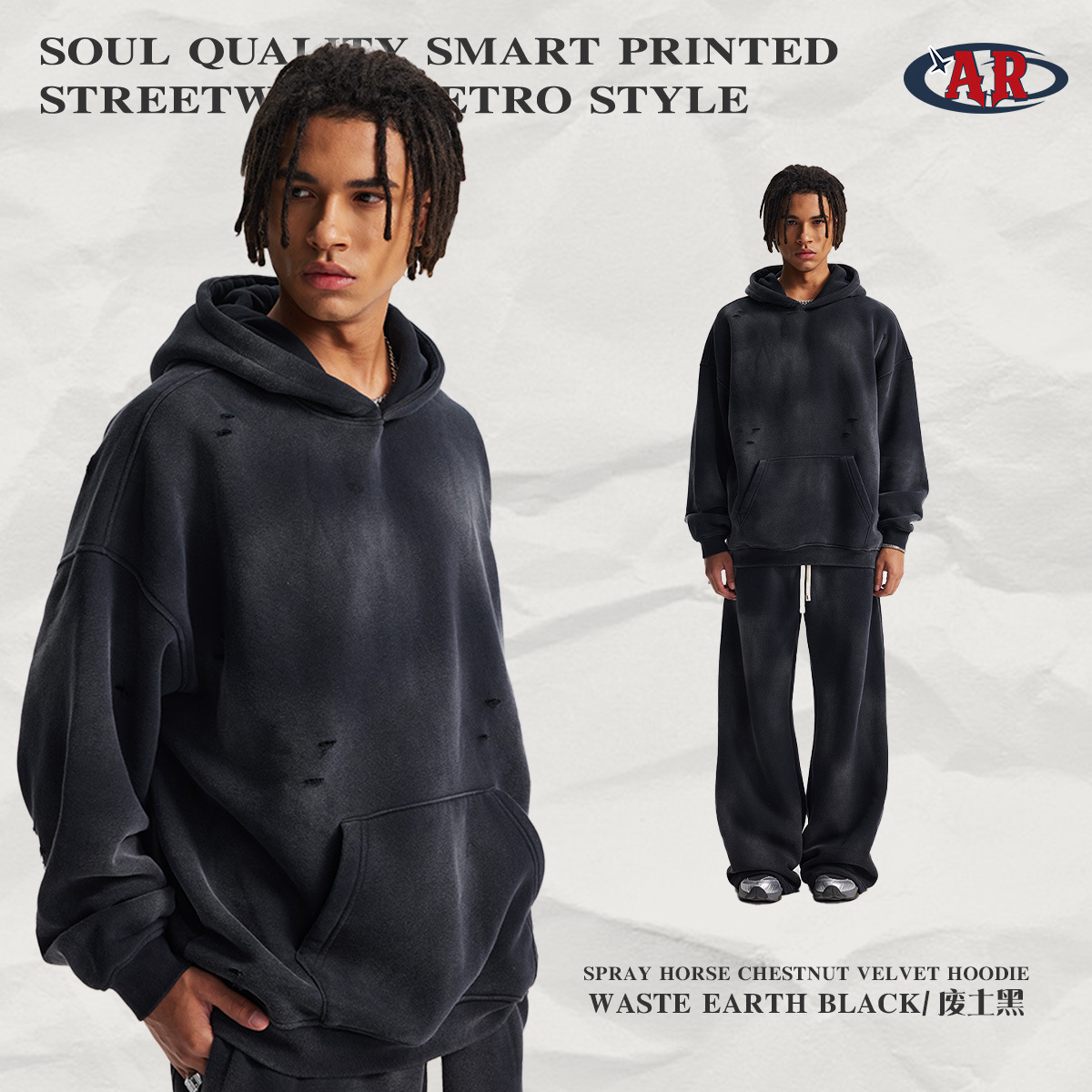 2026 가을 겨울 신상품 스프레이 워싱, 빈티지 스타일, 데미지, 컷팅 디테일, 기모 안감 스웨트셔츠와 스웨트팬츠 세트, 해외 공급원산지스토어 가기