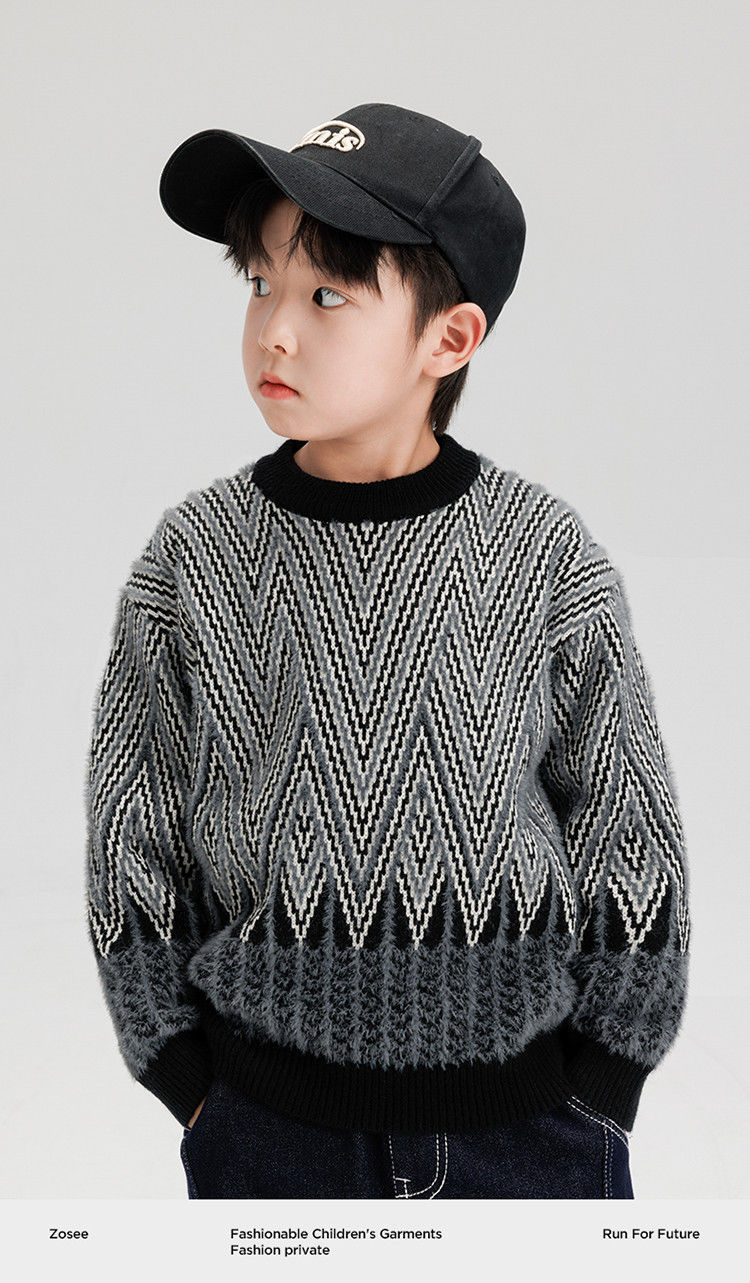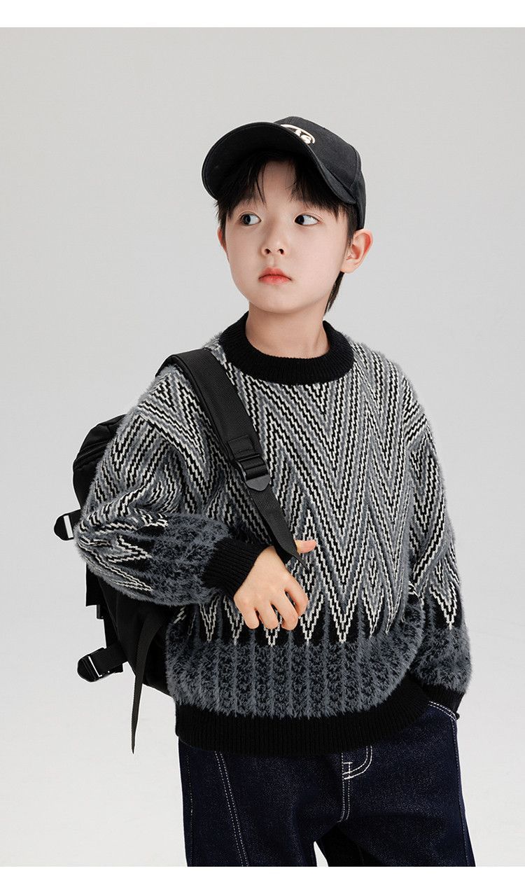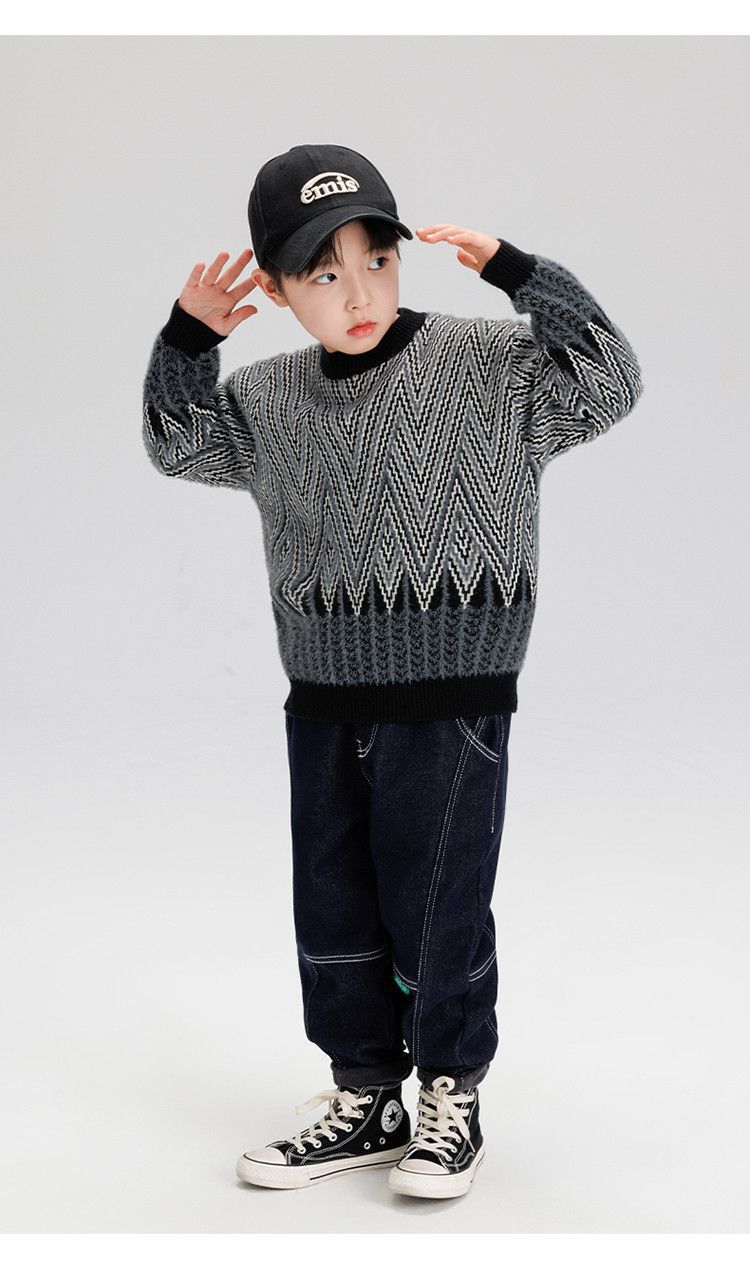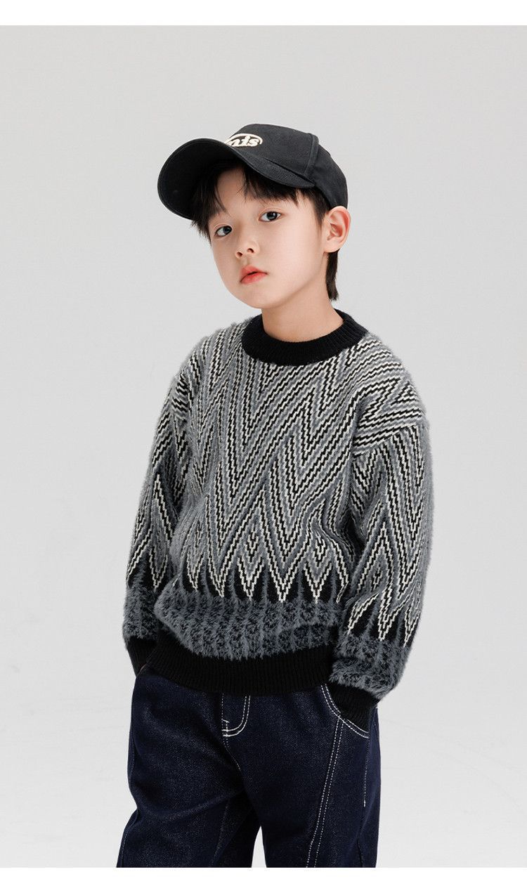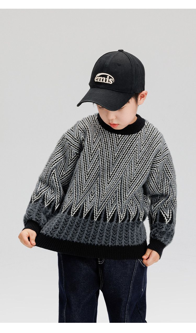소년 스웨터 겨울 2024 새로운 어린이 복고풍 대비 컬러 북극 양털 골판지 자카드 탑 안티 필링 도매스토어 가기