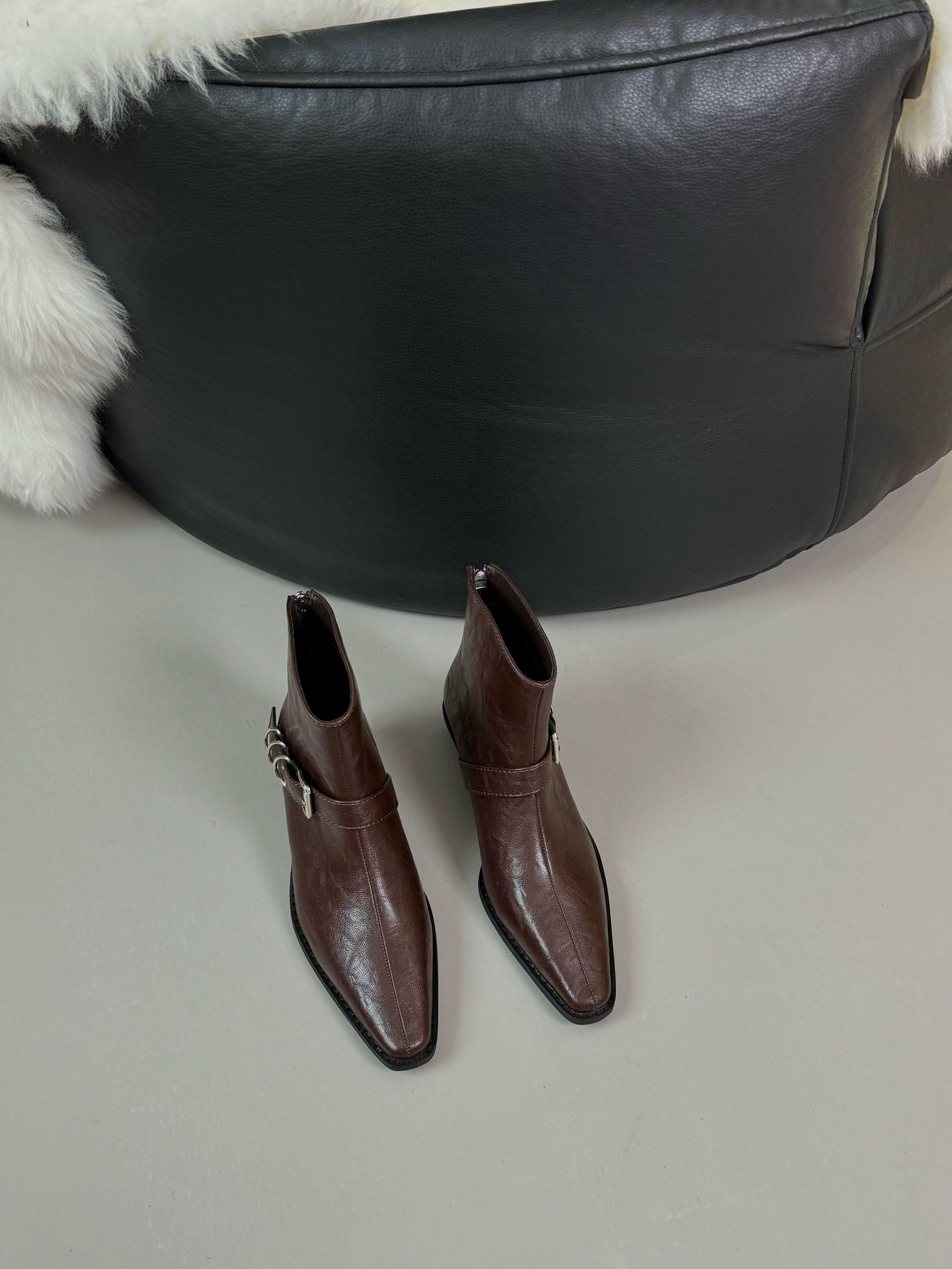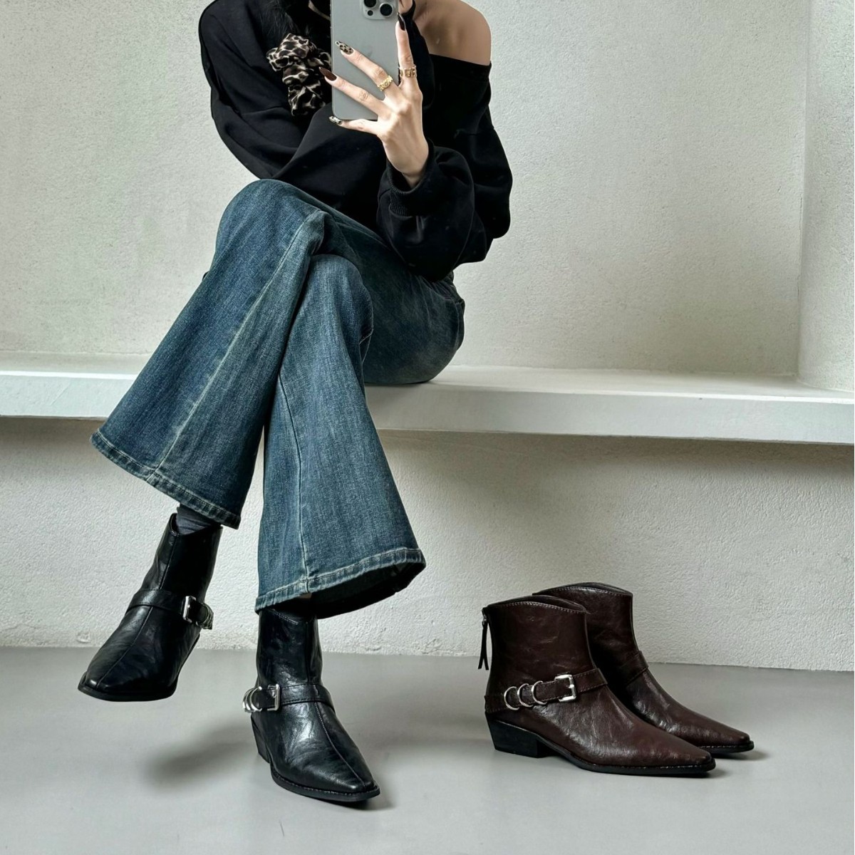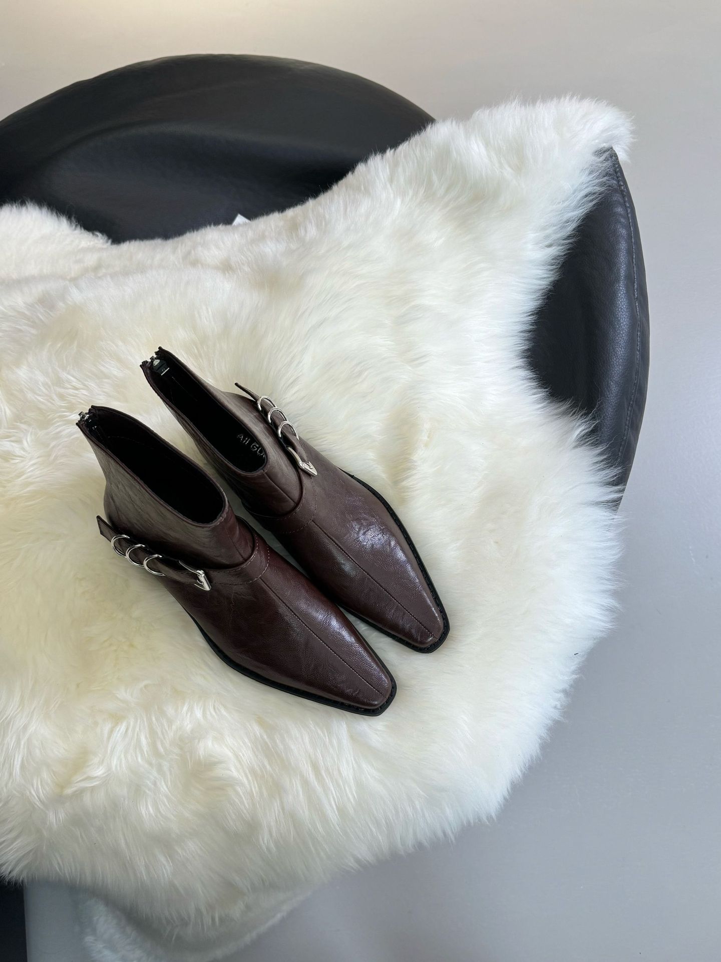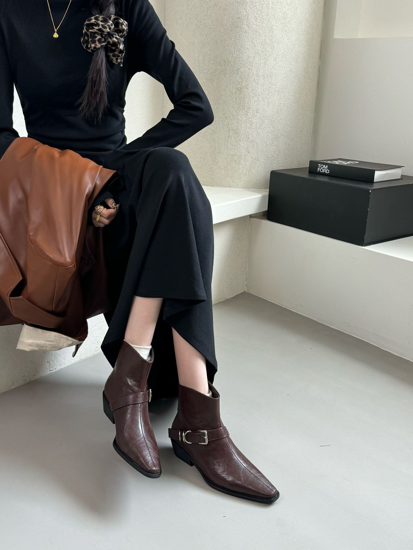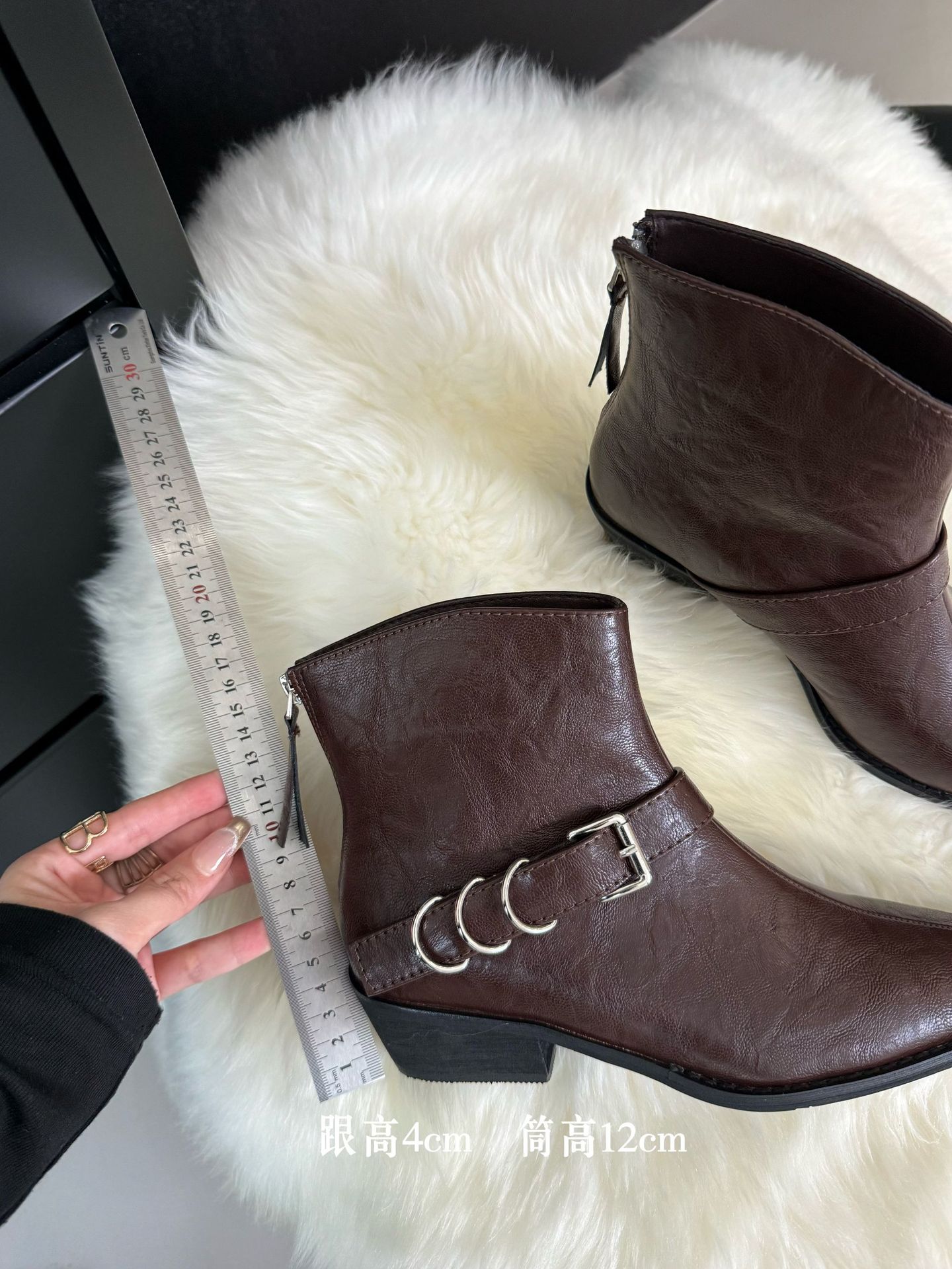 프렌치 스타일 뾰족코 두꺼운 굽 숏부츠 여성용 2025 가을 겨울 신상 레트로 벨트 버클 숏부츠스토어 가기