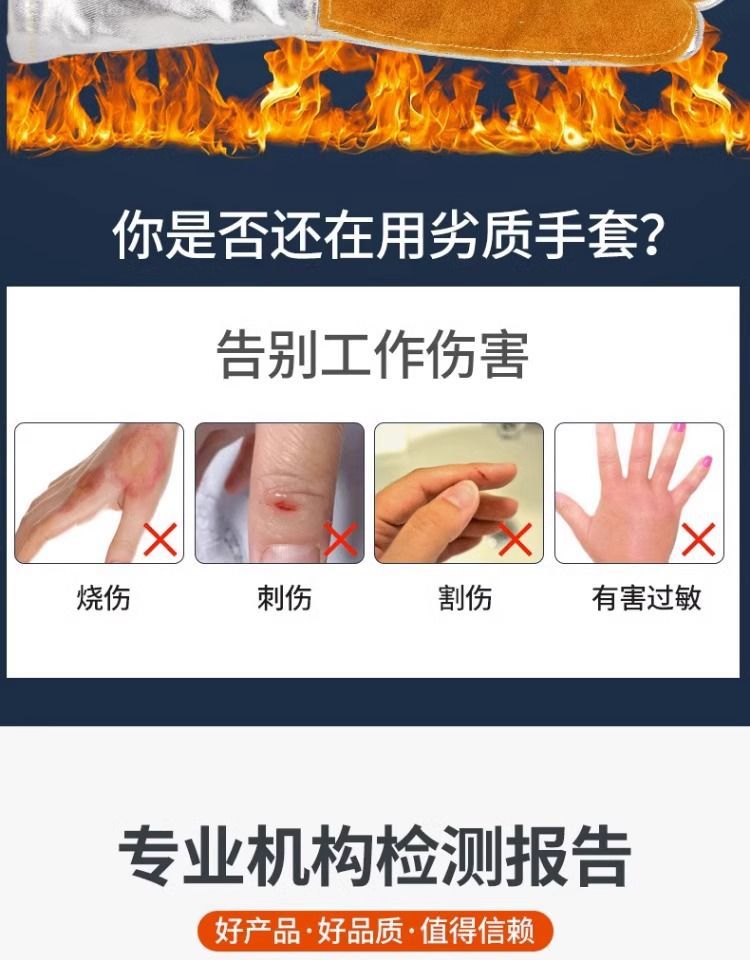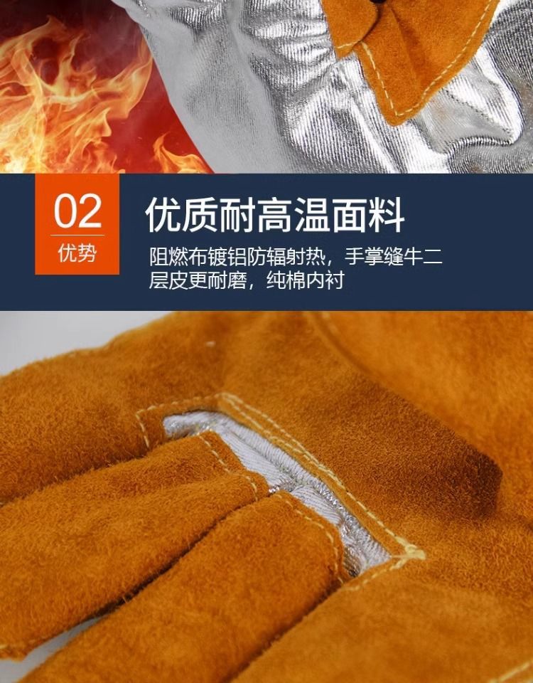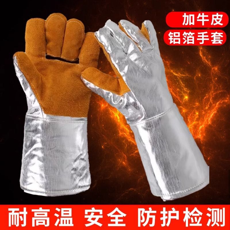 알루미늄 호일 cowhide 두껍게 마모 방지 단열 전기 용접 장갑 방화 방지 고온 5 손가락 장갑 250-1000 도스토어 가기