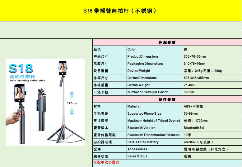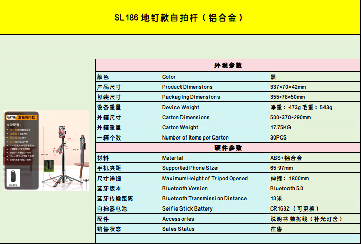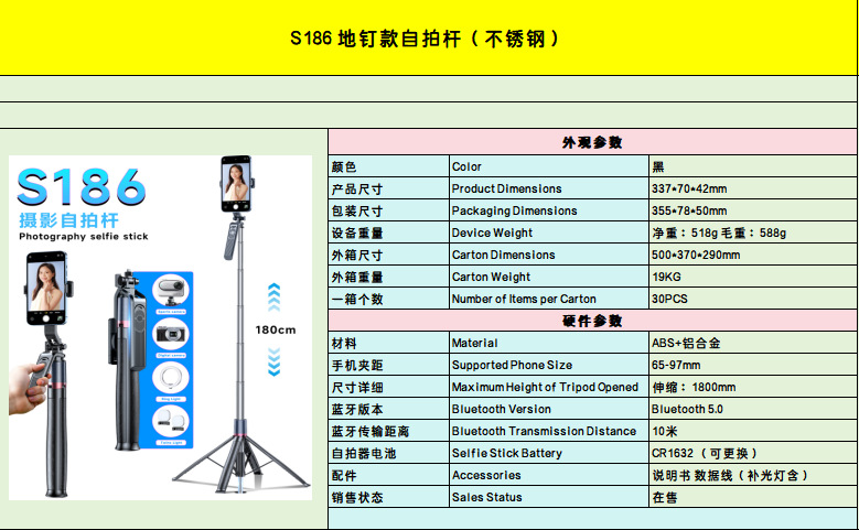• S186 4각 셀카봉에는 접지 못이 포함되어 있지 않으며 조명이 없는 스테인레스 스틸 모델입니다.