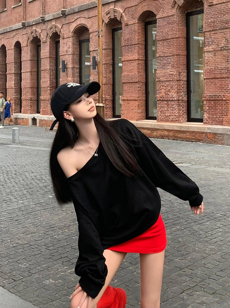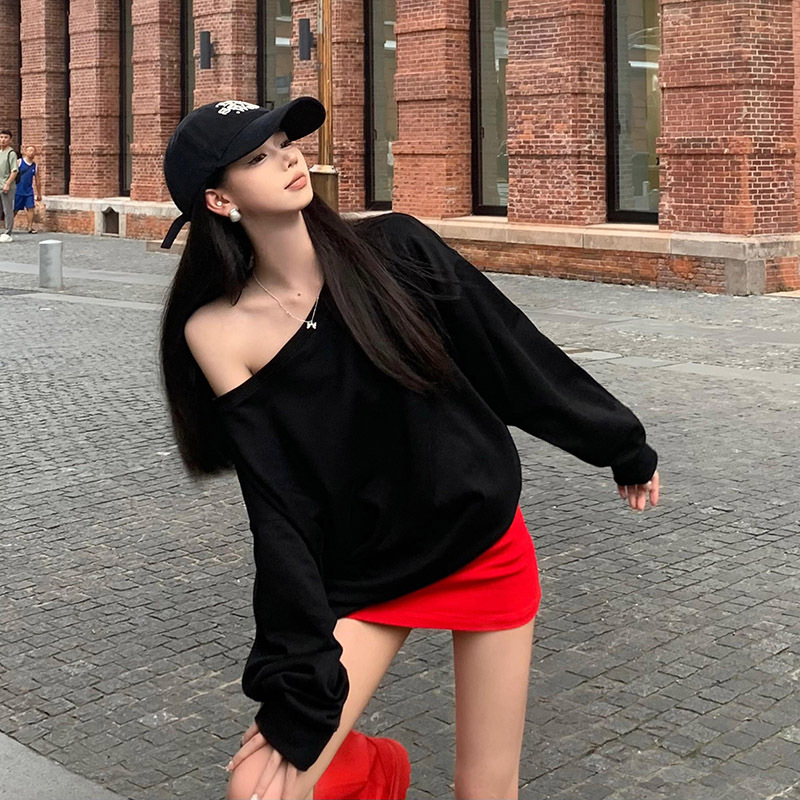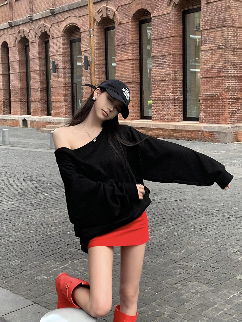 하이 엔드 블랙 경사 어깨 긴팔 풀오버 스웨터 여성의 가을과 겨울 게으른 바람 느슨한 슬림 캐주얼 다재다능한 최고 트렌디스토어 가기