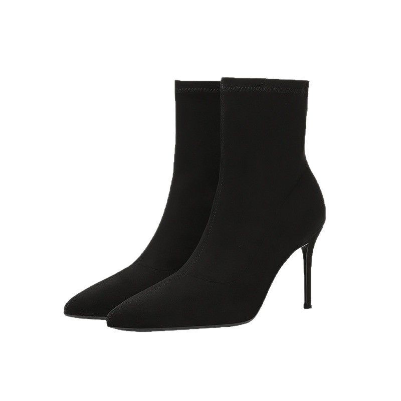 블랙 스트레치 슬리밍 양말 부츠 2025 인터넷 연예인 신상 미드길이 얇은 굽 뾰족한 발가락 슬리밍 슈퍼 하이힐 여성용 숏부츠스토어 가기
