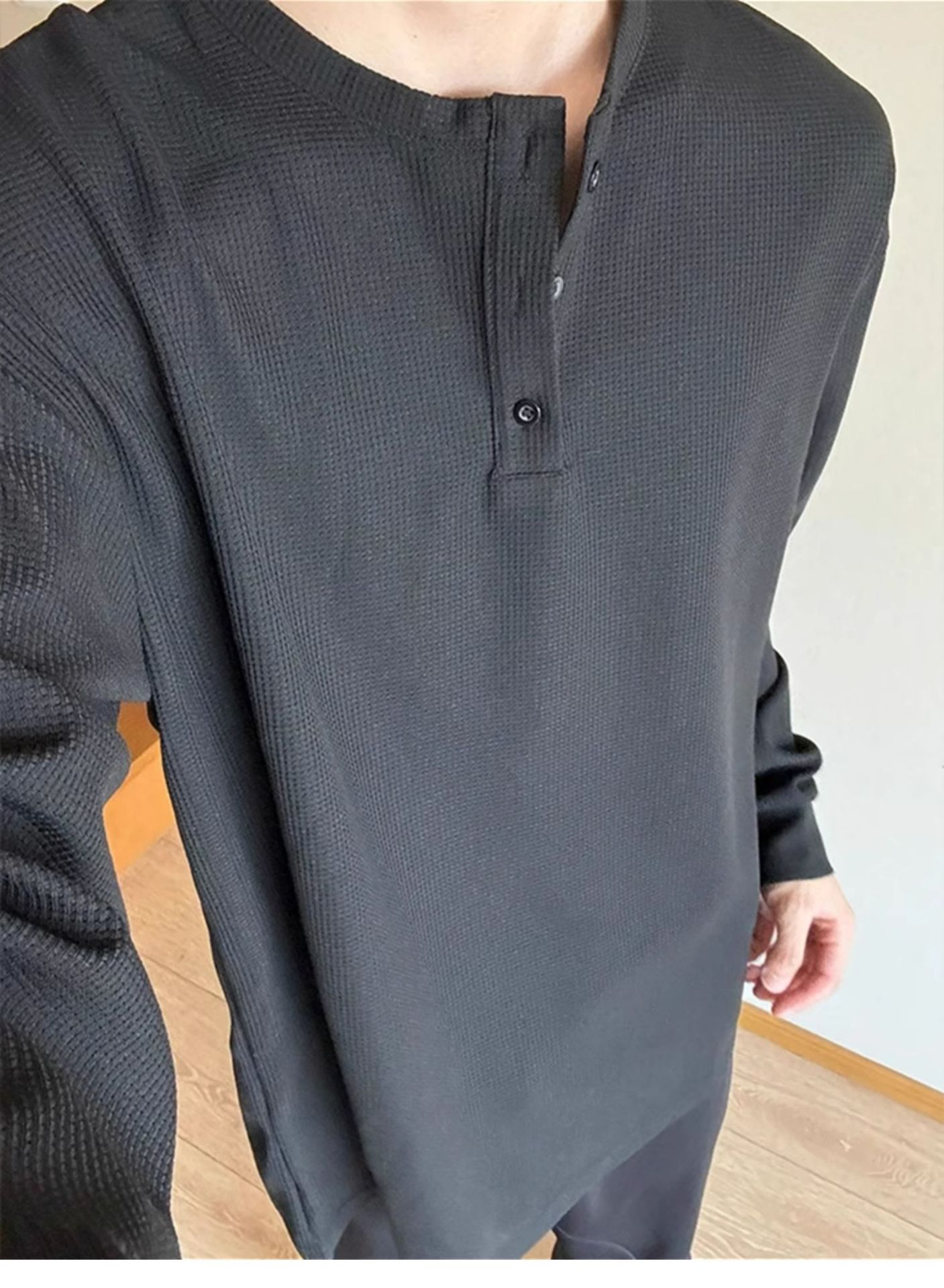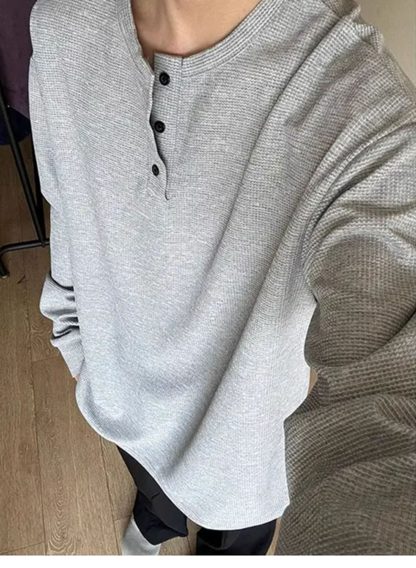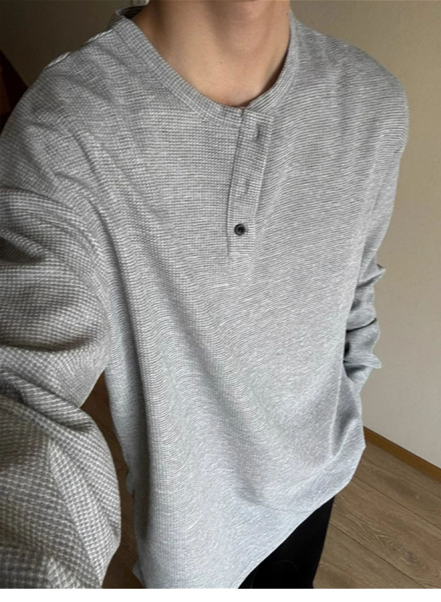 그레이 헨리 칼라 긴팔 티셔츠 남성용 봄과 가을 미국 티셔츠 와플 루즈 캐주얼 내베이스 셔츠스토어 가기