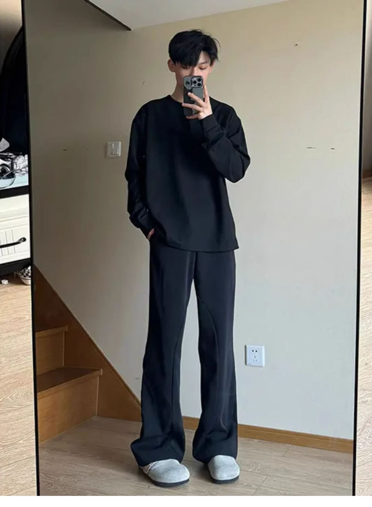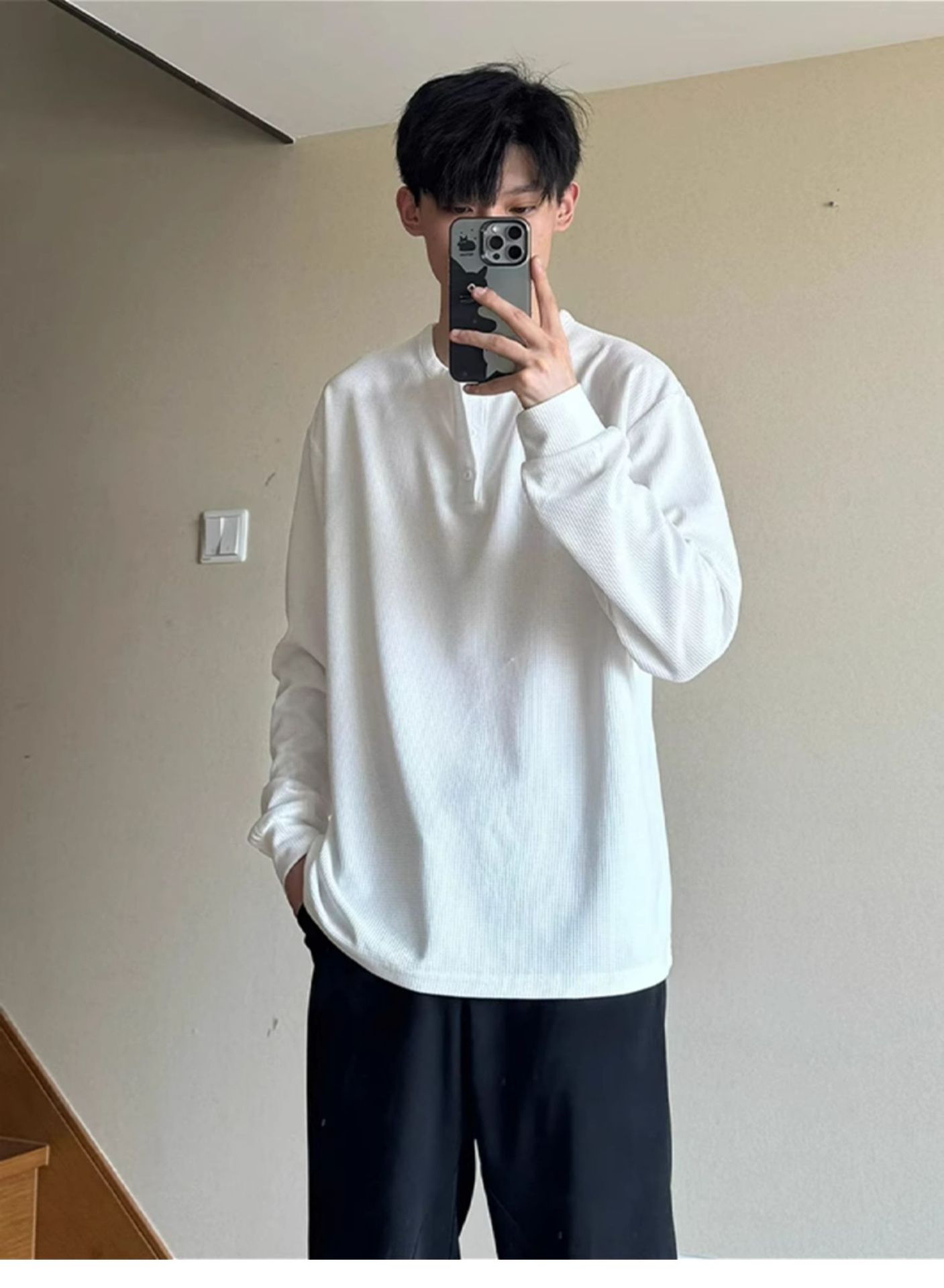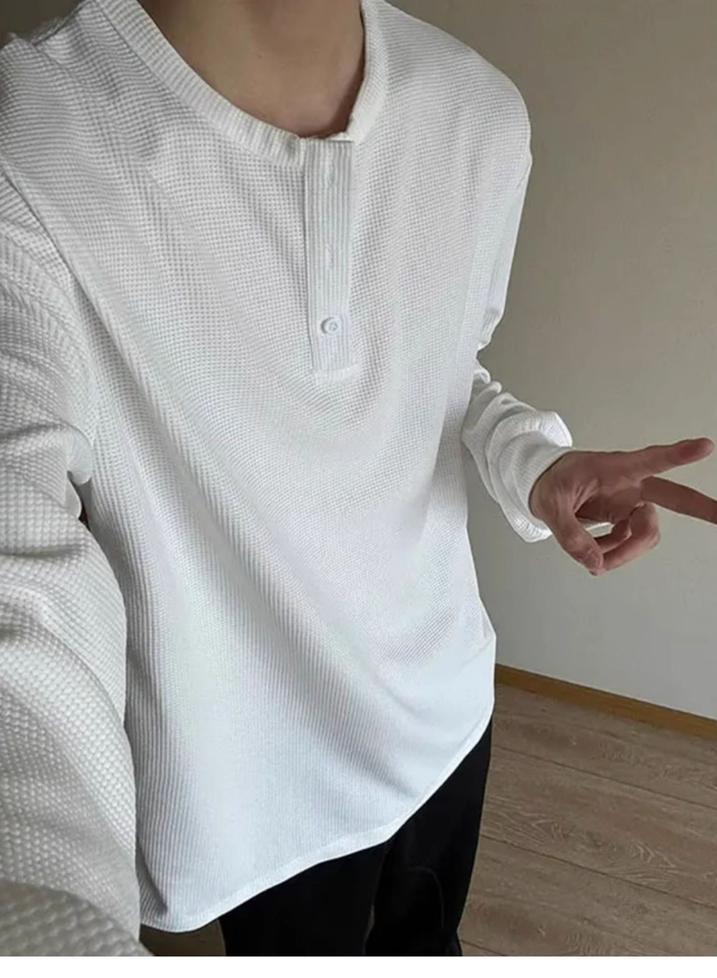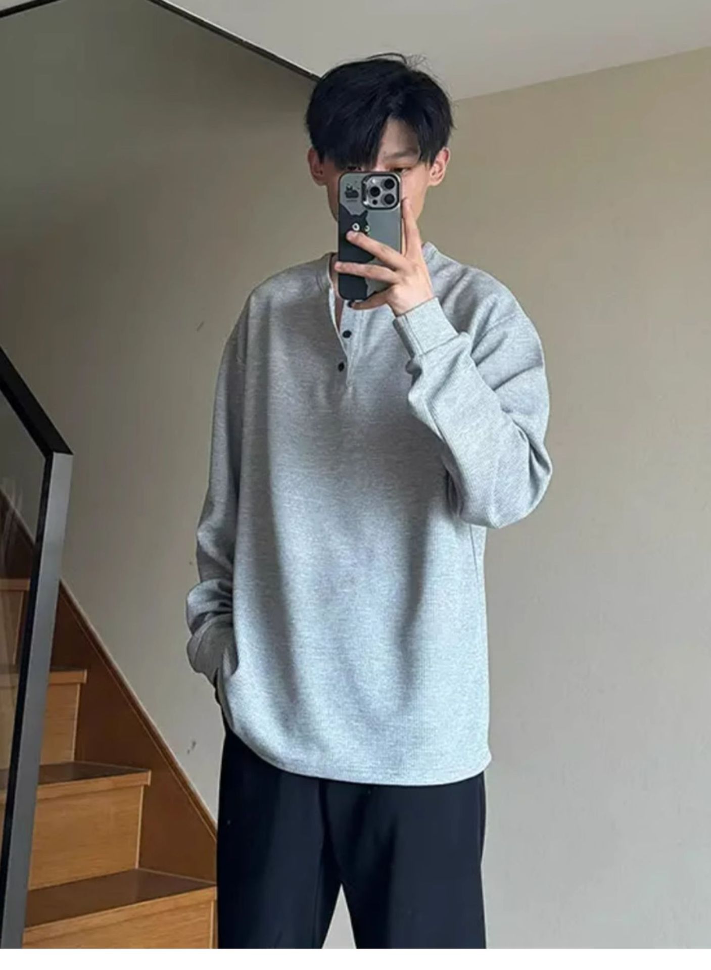 그레이 헨리 칼라 긴팔 티셔츠 남성용 봄과 가을 미국 티셔츠 와플 루즈 캐주얼 내베이스 셔츠스토어 가기