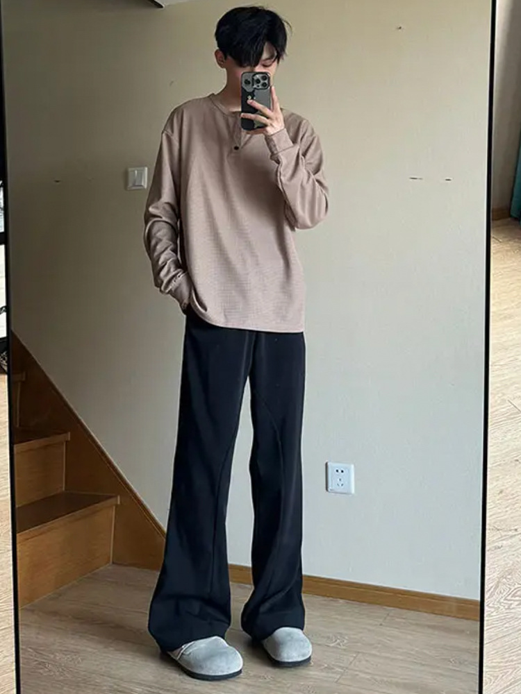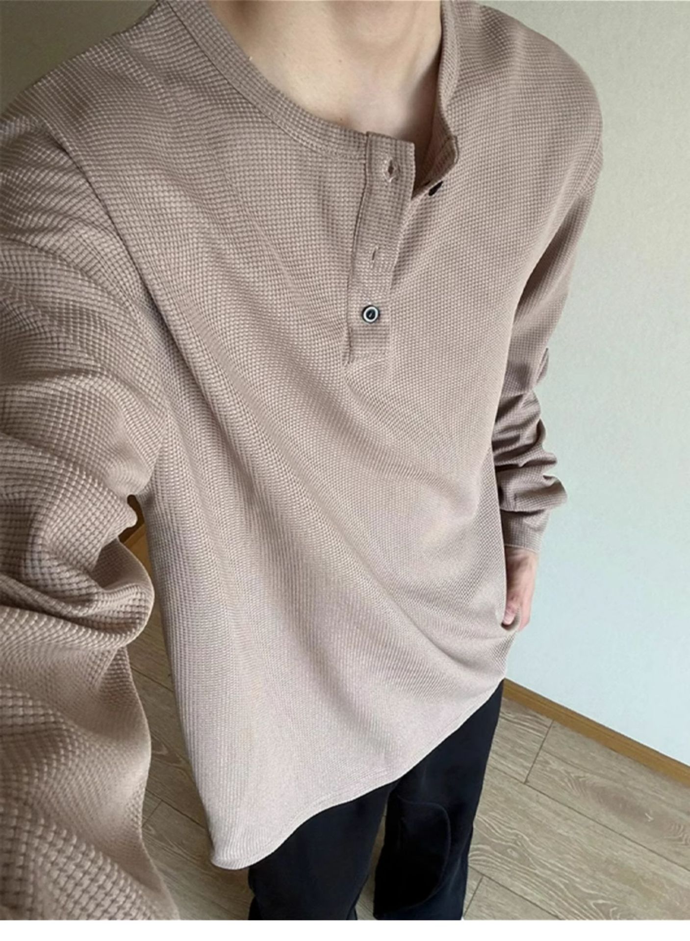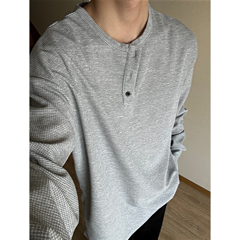 그레이 헨리 칼라 긴팔 티셔츠 남성용 봄과 가을 미국 티셔츠 와플 루즈 캐주얼 내베이스 셔츠
