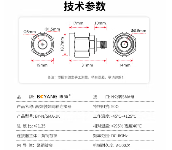 博扬 高频射频同轴连接器50欧 N公转SMA母转接器 N公/SMA母转接头 1个装 BY-N/SMA-JK*1 合格证*1