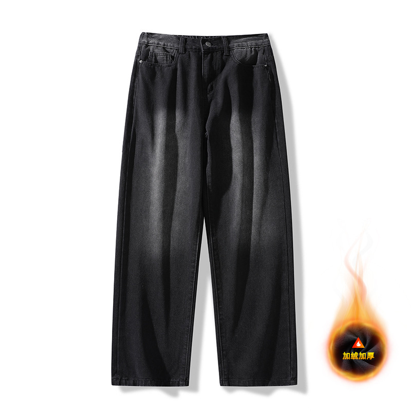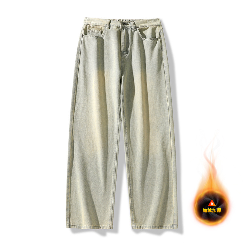 무추 남성복∣후리스 안감 두꺼운 보온성 아메리칸 스타일 데님 팬츠 남성용 루즈핏 레트로 워싱 와이드 팬츠 만능 코디 바지