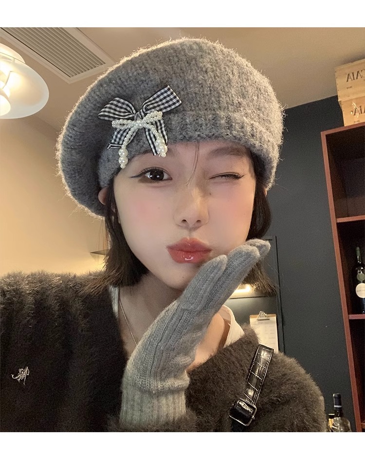 활 회색 베레모 여성의 가을과 겨울 따뜻한 니트 봉제 꽃 봉제 화가의 모자 큰 머리 올 매치 모자